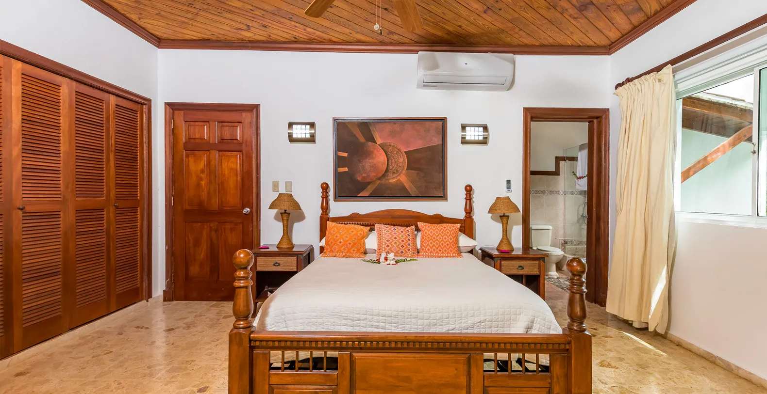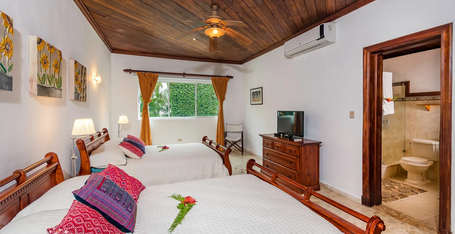 Villa Los Ensueños has 2 bedrooms downstairs. The first bedroom has one queen bed, TV, closet, air condition, ceiling fan, ensuite bathroom with shower. From this bedroom you have direct access to the furnished terrace, pool area and backyard.