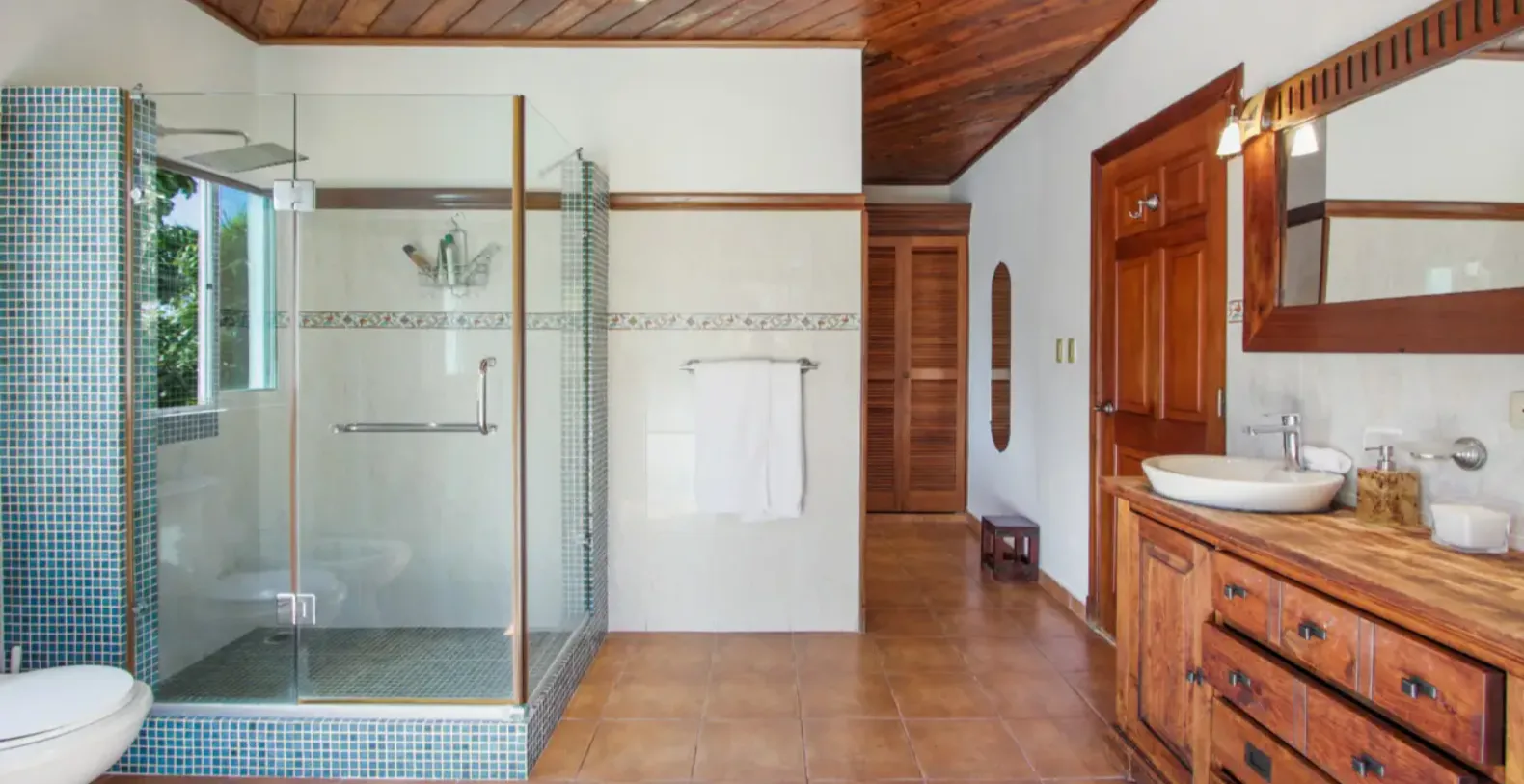 Los Ensueños accommodates up to ten guests across five beautifully appointed bedrooms. Three bedrooms are located on the ground floor and two upstairs, offering a thoughtful layout that suits families and multi-generational groups alike. All bedrooms are air-conditioned and feature private en-suite bathrooms and closets, ensuring comfort and privacy for every guest.