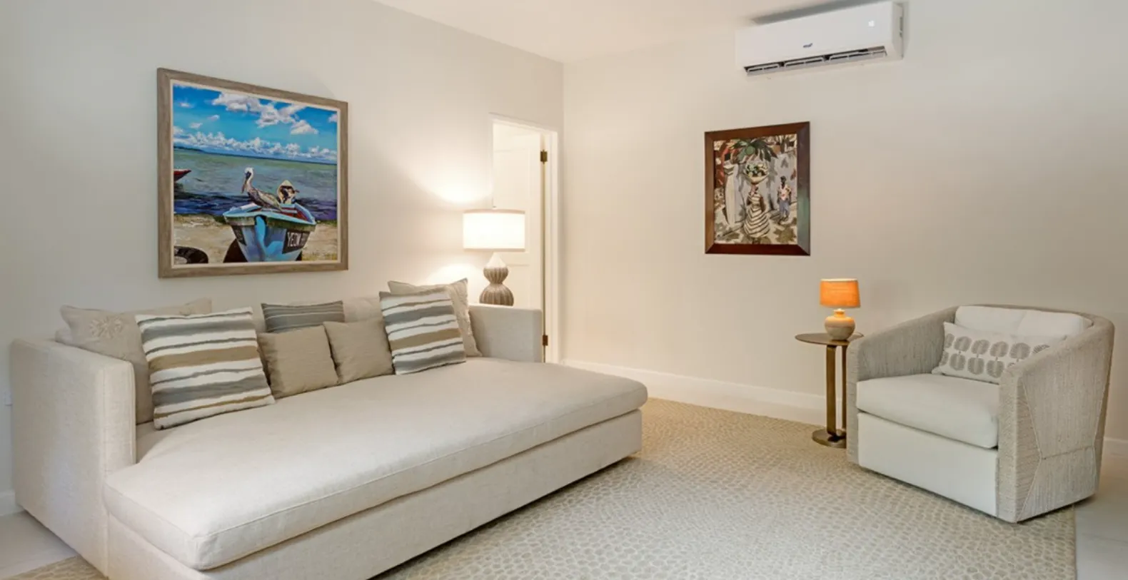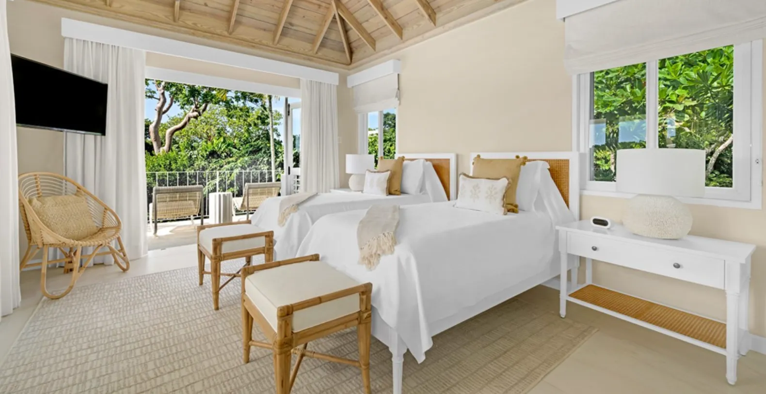 Villa Abacus was fully restored in 2023 and it has 3-bedroom, 3-bathroom, accommodating up to 8 guests across three spacious ensuite bedrooms. The primary bedroom features a plush king-size bed and opens to a private terrace with garden views. The second bedroom offers flexibility with either a king-size or twin bed configuration, while the third bedroom also boasts a king-size bed. A cozy media room with an 80” TV can double as a fourth bedroom, featuring a queen pull-out sofa ideal for children or extra guests, with additional space for a cot if needed. Each bedroom comes with flat-screen TV, air-conditioning and ceiling fans for maximum guests comfort. Inside, the open-concept living and dining areas are bright and inviting, styled in soothing neutral tones with natural wood and rattan finishes. Vaulted ceilings and expansive windows create an airy ambiance that blends seamlessly with the outdoors. A fully equipped bar with beverage center, wine fridge, and ice machine offers the perfect setup for entertaining.