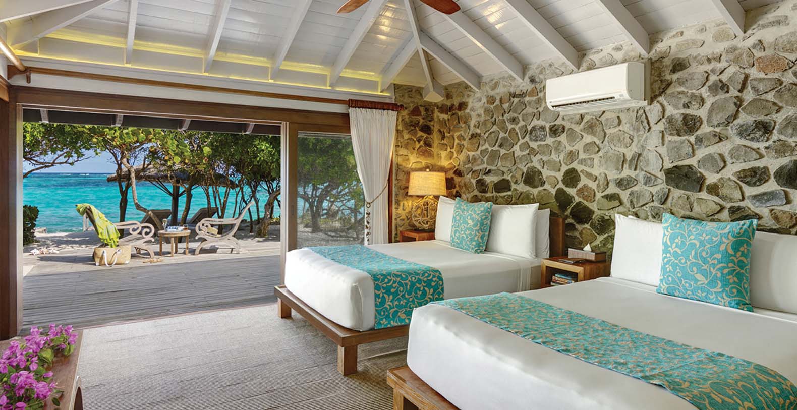The Two Bedroom Beach Villas on Petit St. Vincent Private Island span over 1500 sq. ft. They feature vaulted ceilings crafted from local purpleheart wood, smooth marble stone flooring, and beds dressed in crisp white Italian linens. The villas provide plenty of space for families or groups of friends, and the outdoor lounge with large pavilion ceiling offers ample room for relaxing, dining, or soaking up the sights and sounds of the nearby ocean.