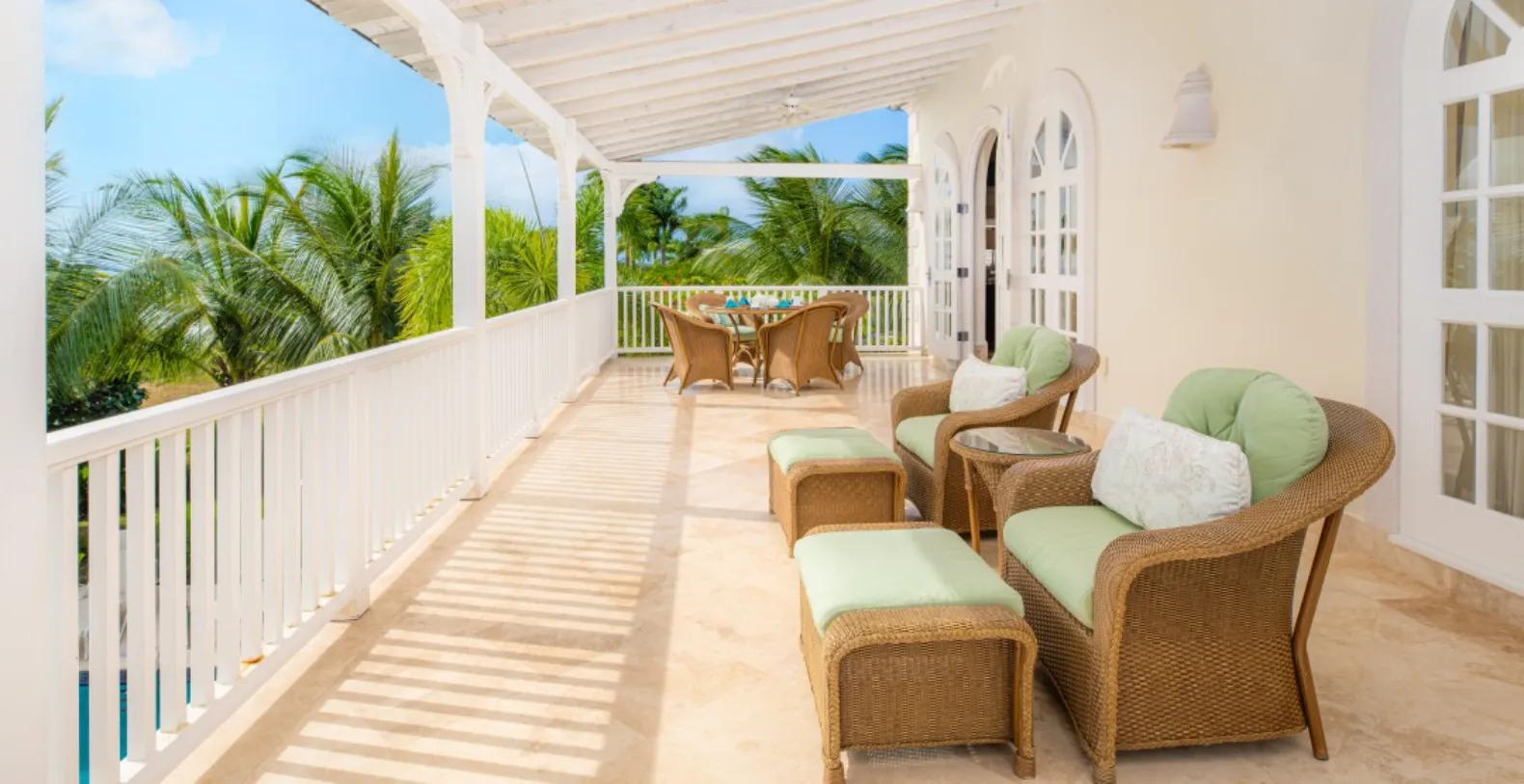 The villa unfolds across a beautifully arranged main residence and a fully self-contained guest cottage, creating flexibility for larger groups while maintaining a sense of intimacy. Interiors are bright and airy. Classic Caribbean architectural elements such as large windows, jalousie shutters, and open-plan living spaces invite natural light and cooling island breezes. At the heart of the home, a spacious fully equipped kitchen with high-end appliances—including double ovens, wine cooler, and espresso facilities—anchors the main living space, seamlessly connecting to elegant indoor dining and relaxed lounge areas. Multiple sitting rooms open onto a covered terrace, creating a natural flow between interior comfort and outdoor living.