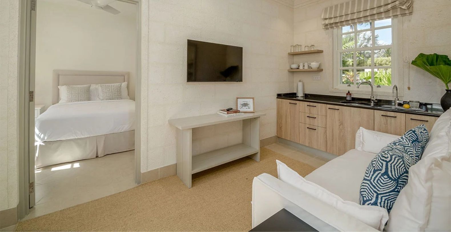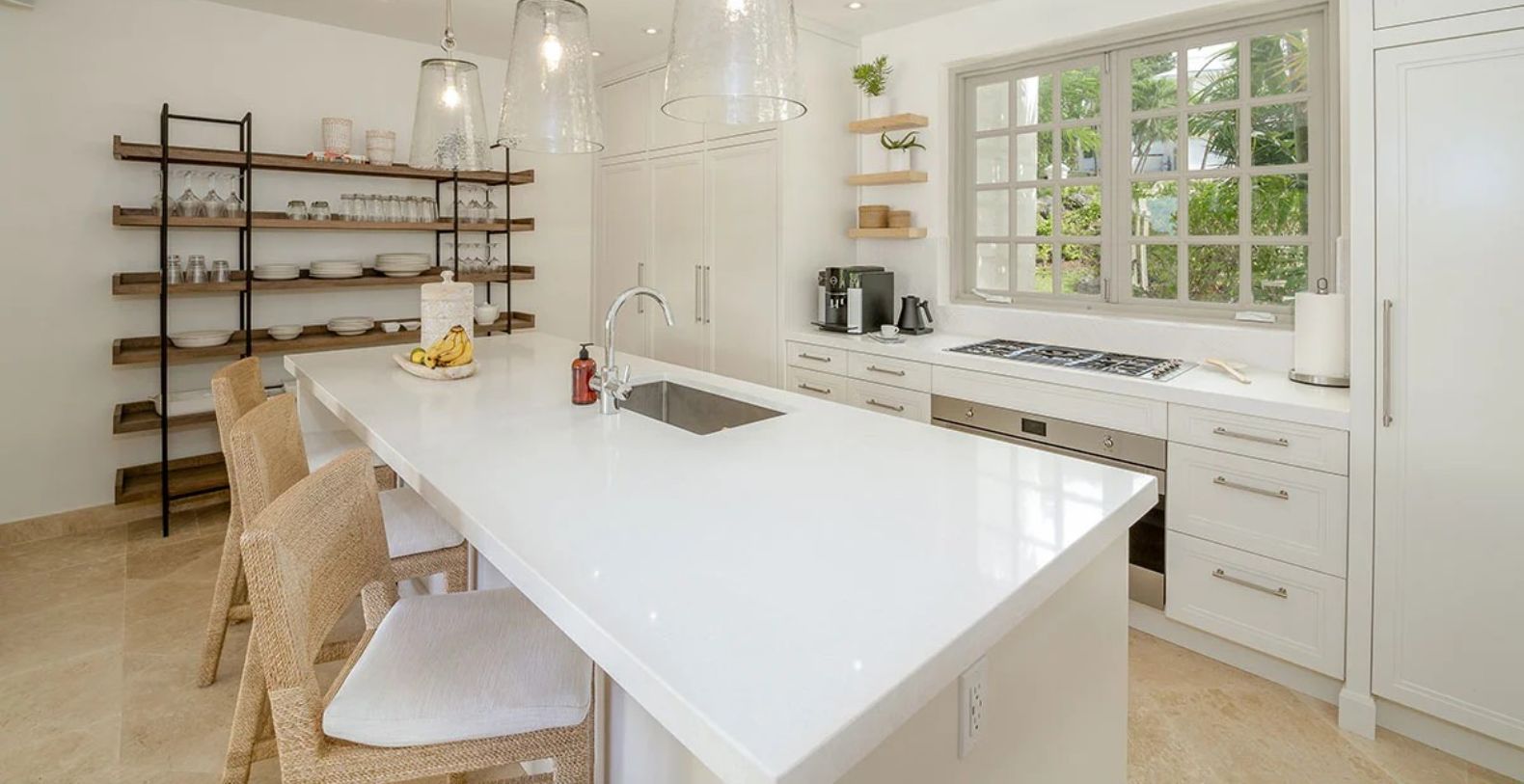 As you step through the grand entrance, you'll find yourself in a haven where modern elegance meets Caribbean charm. You’ll experience the pinnacle of tropical luxury at Villa One Westland Heights, built as 5-bedroom, 5-bathroom vacation villa nestled in the elite gated community on the West Coast of Barbados. This masterpiece of design, with two lavish primary bedrooms on the upper level, featuring en-suite bathrooms that redefine indulgence, and private access to expansive terraces with sweeping views that promise tranquility at day's end. The main floor houses an en-suite guest bedroom offering secluded luxury, and across the sun-dappled courtyard, a poolside guest cottage harbors two more en-suite bedrooms. Each of these private sanctuaries opens onto terraces that gaze upon the mesmerizing saltwater pool—a centerpiece that invites you to immerse in its crystalline embrace. The living area at Villa One Westland Heights is a study in relaxed elegance, where plush white sofas invite you to unwind in comfort. In the heart of the villa, the kitchen stands as a culinary sanctuary with state-of-the-art appliances and a spacious white quartz island, where guests can savor casual breakfasts or engage in lively cooking sessions. Surrounded by sleek cabinetry and bathed in natural light, it's a space that combines functionality with a chic aesthetic, ensuring every meal is a delightful experience.
