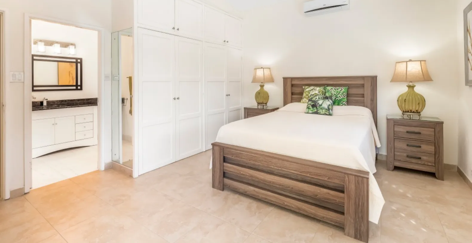 At the center of the villa is a beautifully designed outdoor space, where a private swimming pool is framed by swaying palms and manicured gardens. Sun loungers and shaded seating areas create an inviting setting for long, leisurely days under the Caribbean sun, while the tranquil atmosphere offers a true sense of escape. The seamless connection between indoor and outdoor living spaces allows guests to fully embrace the island’s warm climate and laid-back rhythm.