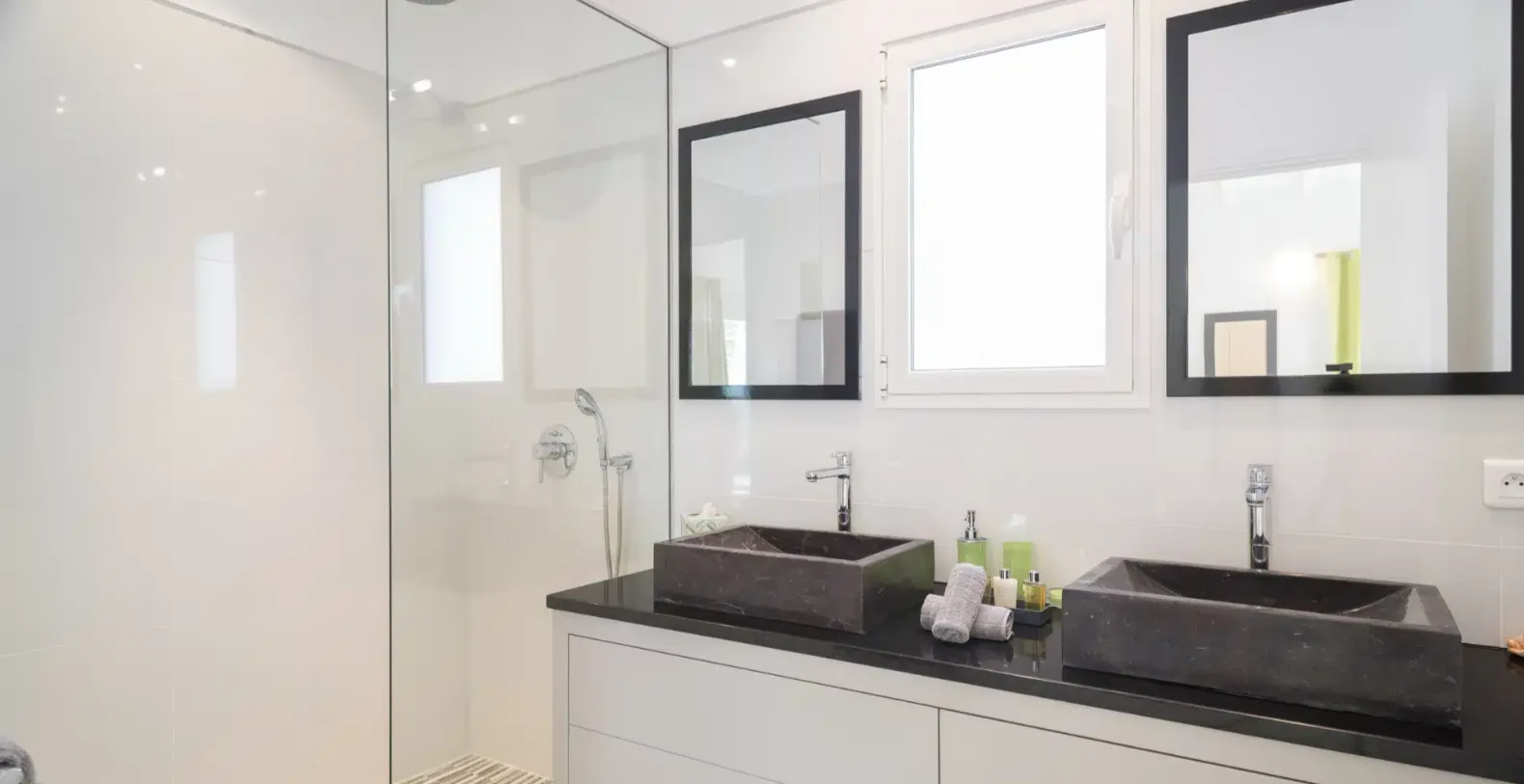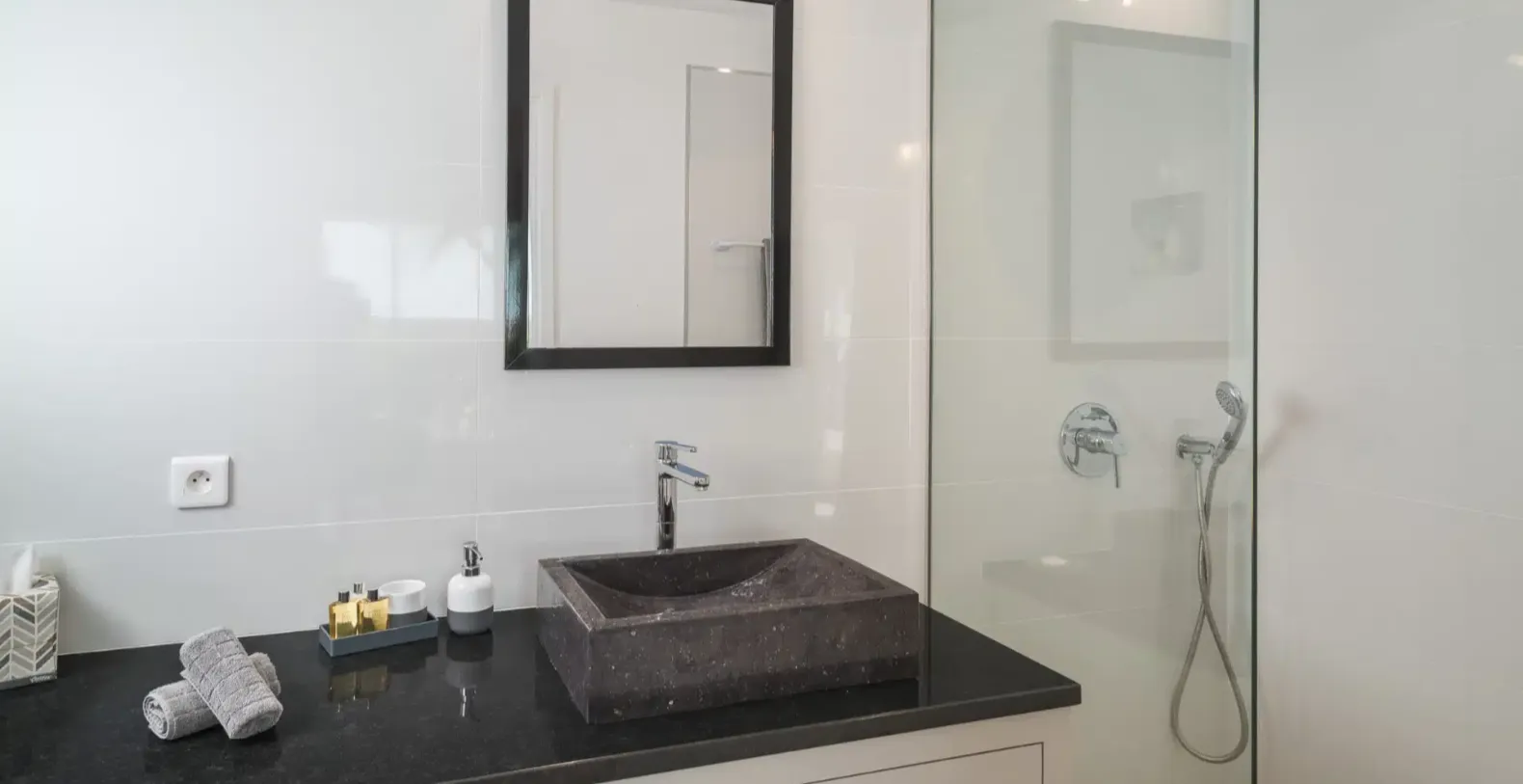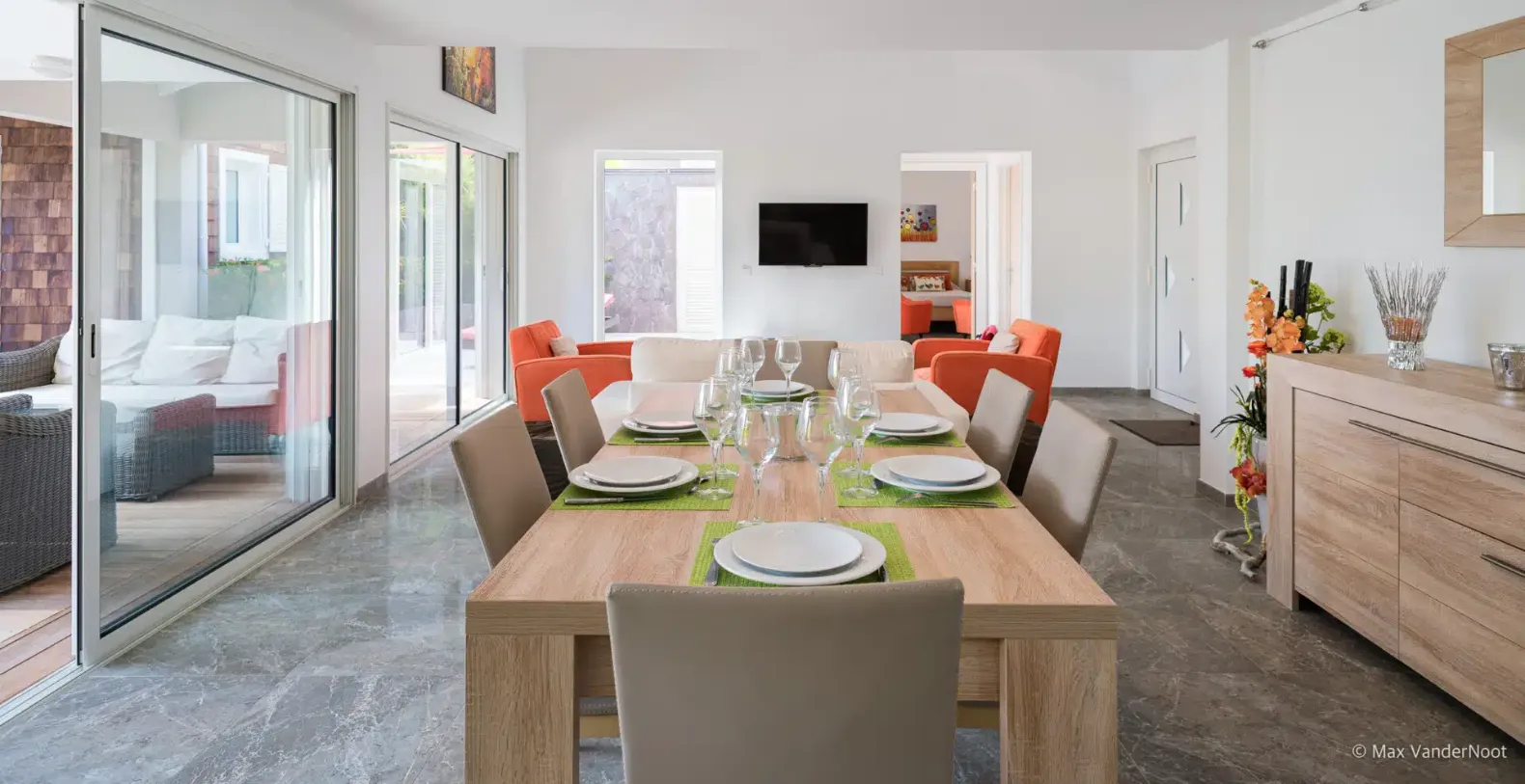 The villa’s layout offers privacy and peace for families or friends traveling together. One bedroom is located in the main house just behind the living area, while two additional bedrooms are set in separate bungalows across the terrace. The primary bedroom features a king-size bed, while the other two offer queen-size beds. Each has an ensuite bathroom with a rainfall shower, minimalist fixtures, and natural stone finishes. The interiors balance comfort and contemporary design — think light wood furniture, soft neutral tones punctuated by bright accents, and playful artwork. The fully equipped kitchen includes all the necessary modern appliances, while the living area is cozy and inviting, perfect for evening gatherings or a quiet read.