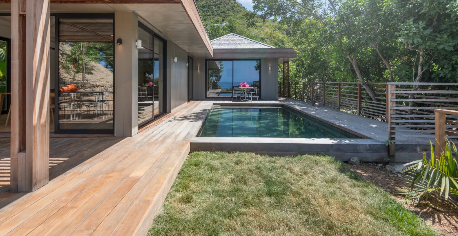 Centered around its serene swimming pool, Villa Bilou invites long, sun-drenched afternoons and quiet evenings beneath the soft glow of the surrounding hills. The pool deck blends seamlessly with the villa’s clean architecture, where smooth wood tones, glass doors, and simple lines create an atmosphere of modern ease. A shaded terrace wraps around the pool, offering space to lounge, dine, or simply enjoy the Caribbean breeze as it moves through the greenery.