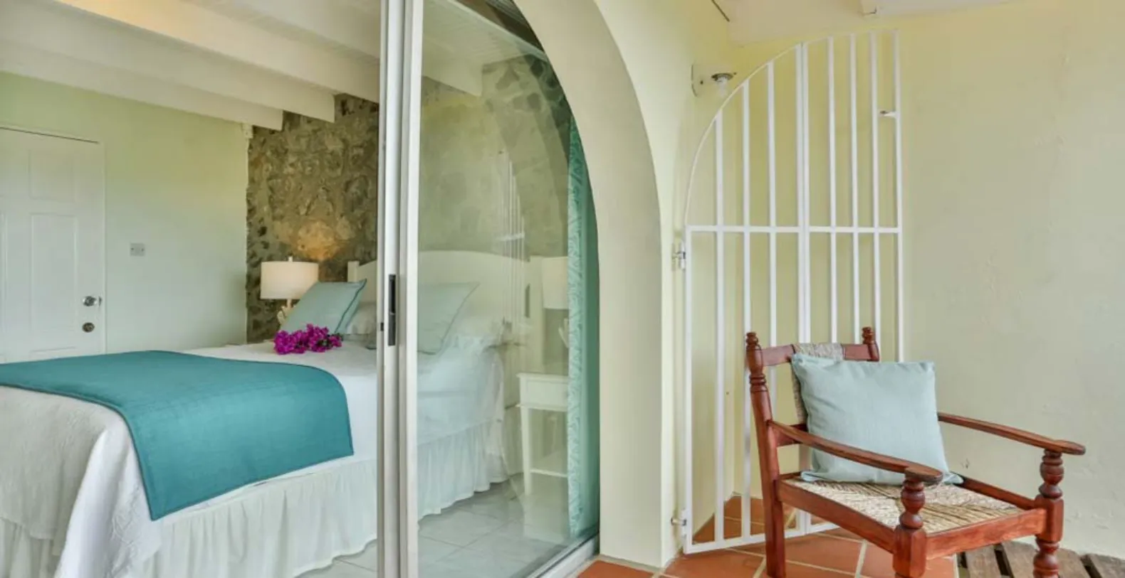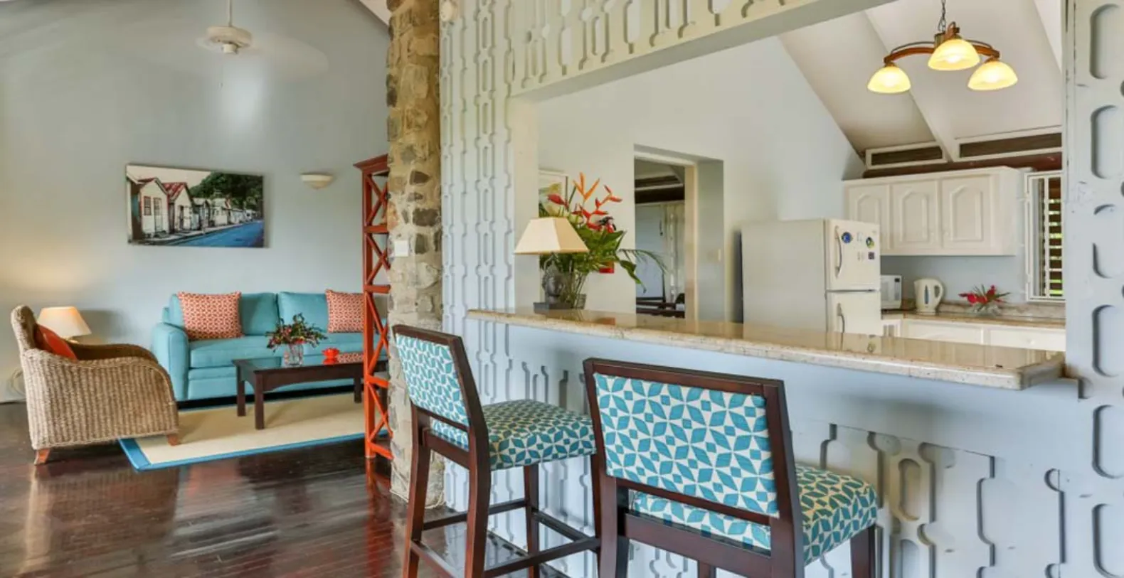 A boardwalk entrance conveys guests directly into a beautiful, open living space with contemporary, casual Caribbean furnishings, which further opens onto a galley veranda equipped with planters chairs and dining table for al fresco dining. There is a full, modern kitchen with 6 hob gas burner on the same level.