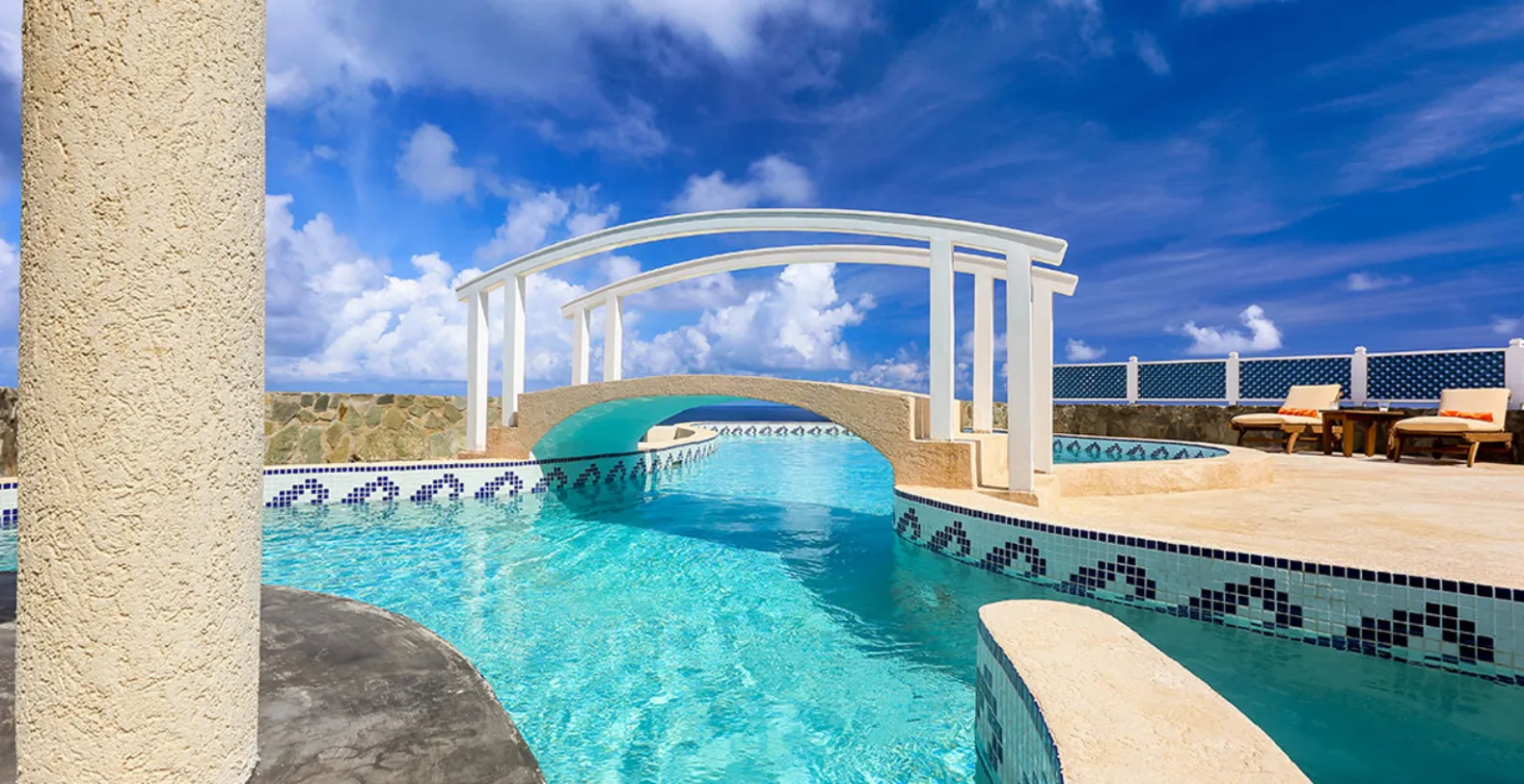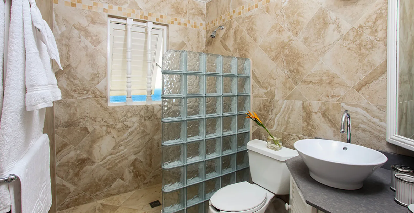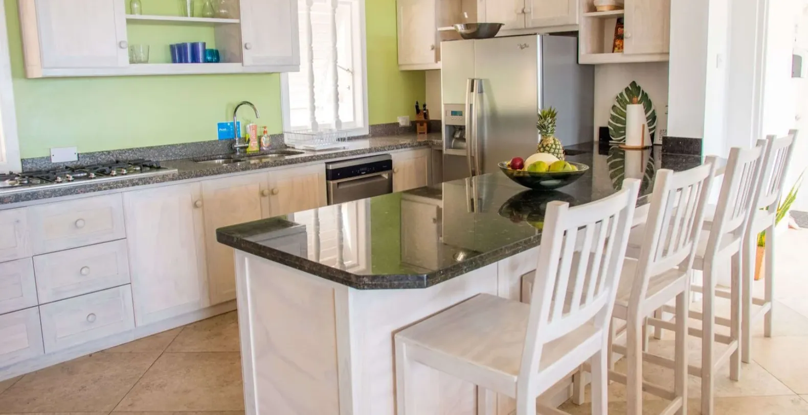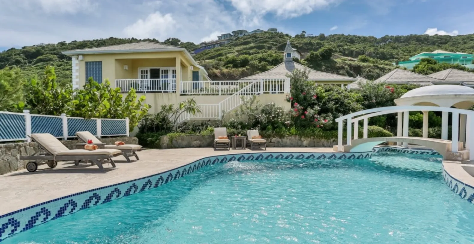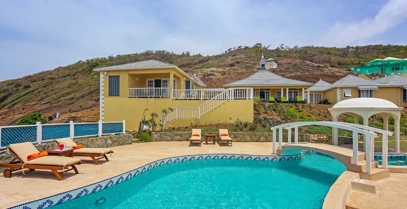There are 4 bedrooms each with ensuite bathrooms. Each bedroom has been artistically decorated by local interior designers, Inside Out. The modern yet Caribbean flair they have chosen is evident through out the house, extending to the living and dining area and out to the pool and deck area. The private swimming pool is a haven of tranquility, where one can hear the sounds of the waves crashing below and also where you might spot migrating whales! The pool area is complete with a swim up bar.