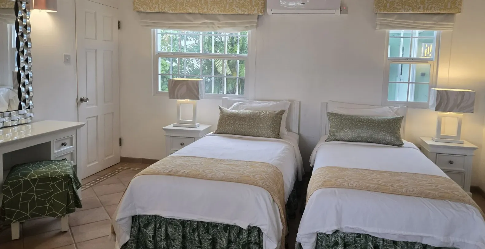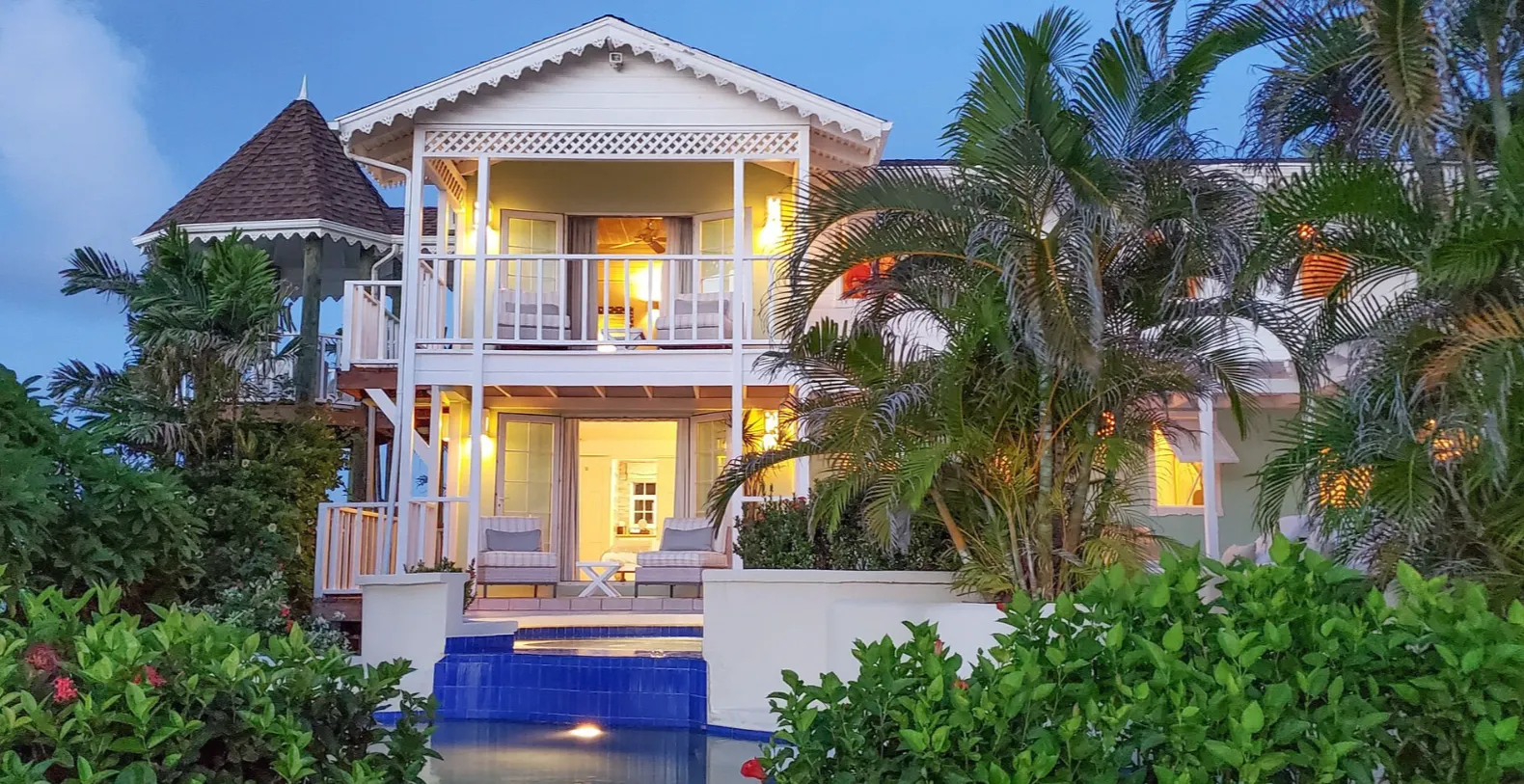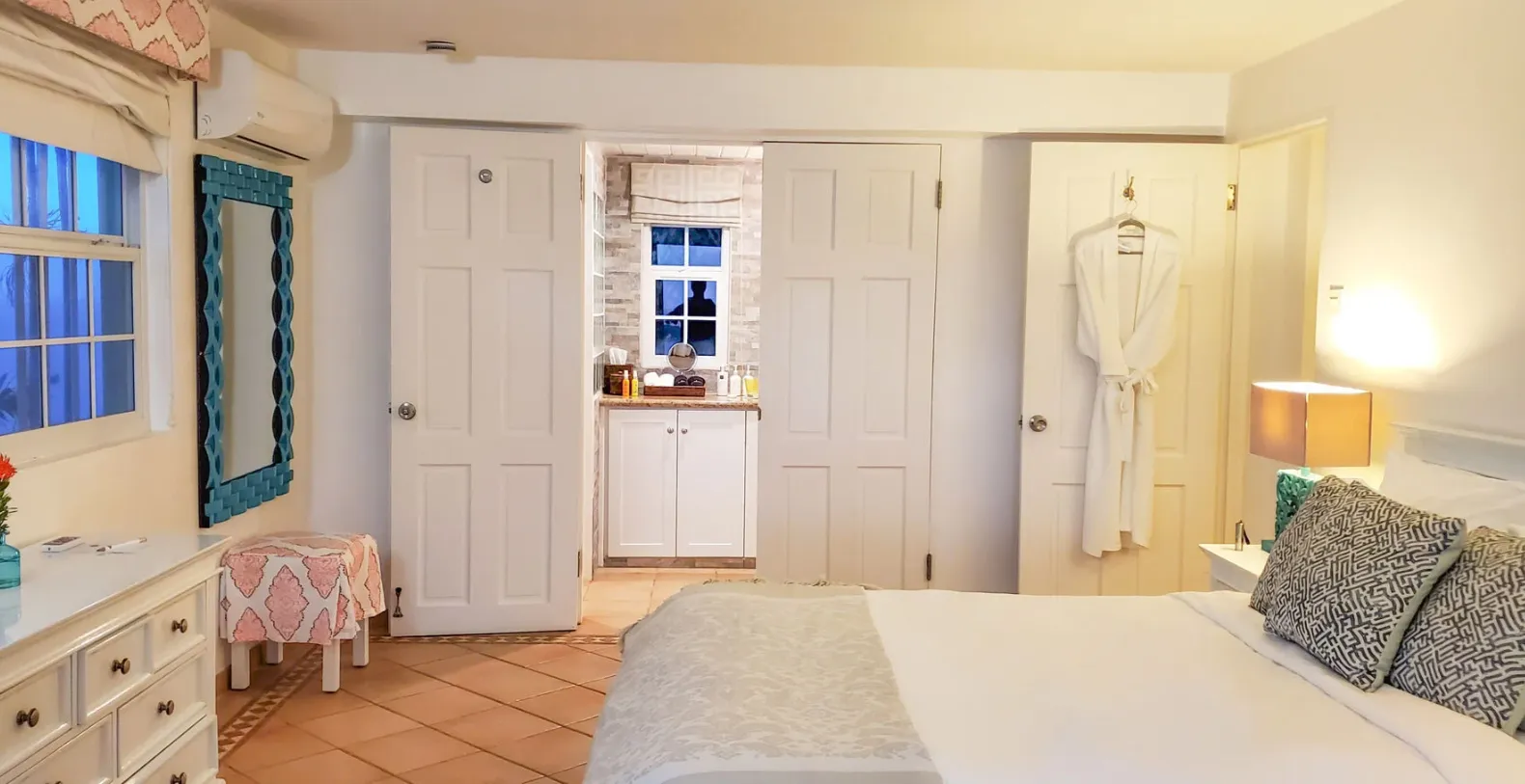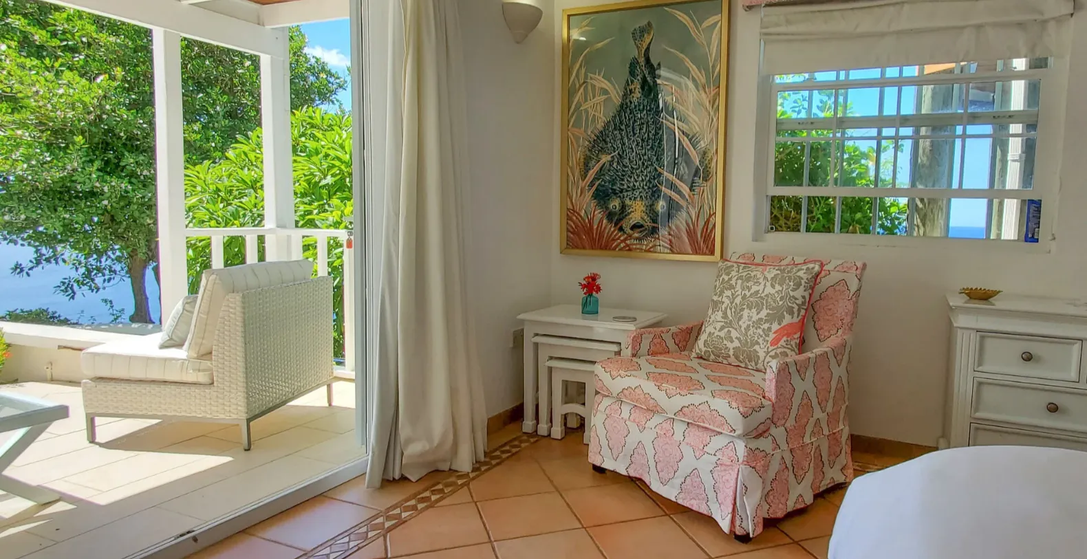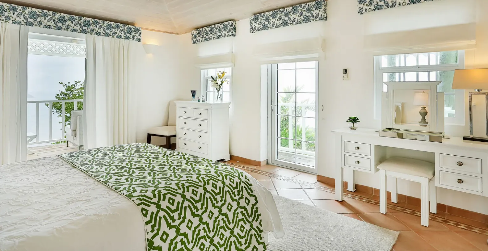 Designed to be enjoyed as either a three-bedroom or two-bedroom vacation rental, Saline Reef Villa offers flexibility without compromising privacy or comfort. The villa features three beautifully appointed, air-conditioned bedrooms, each with an ensuite bathroom and walk-in closet. Two of the bedrooms are ocean-facing, allowing guests to wake up to the sound of waves and sweeping sea views. The lower seaside suite enjoys direct access to the pool through a furnished covered porch, while the upper seaside suite opens onto a private balcony overlooking the Caribbean. The third interior suite can be arranged with either a king bed or twin beds, making it ideal for families or friends traveling together.