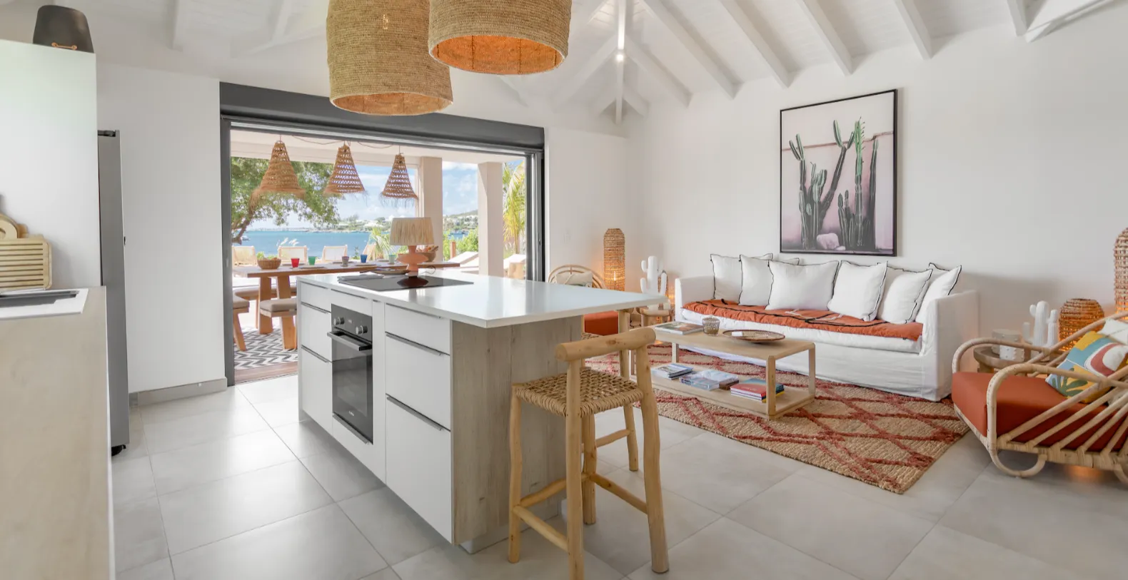 Designed to accommodate up to six guests, the villa is bathed in natural light, with open interiors that flow seamlessly to the outdoors. The living room’s inviting seating and the fully equipped kitchen create an atmosphere of relaxed sophistication, while the shaded dining terrace offers the perfect spot for long seaside lunches. Outside, the heated pool becomes the heart of the home—an irresistible invitation to swim, unwind, and watch the colors of the Caribbean shift with the changing light.