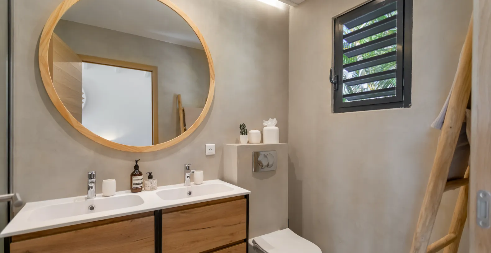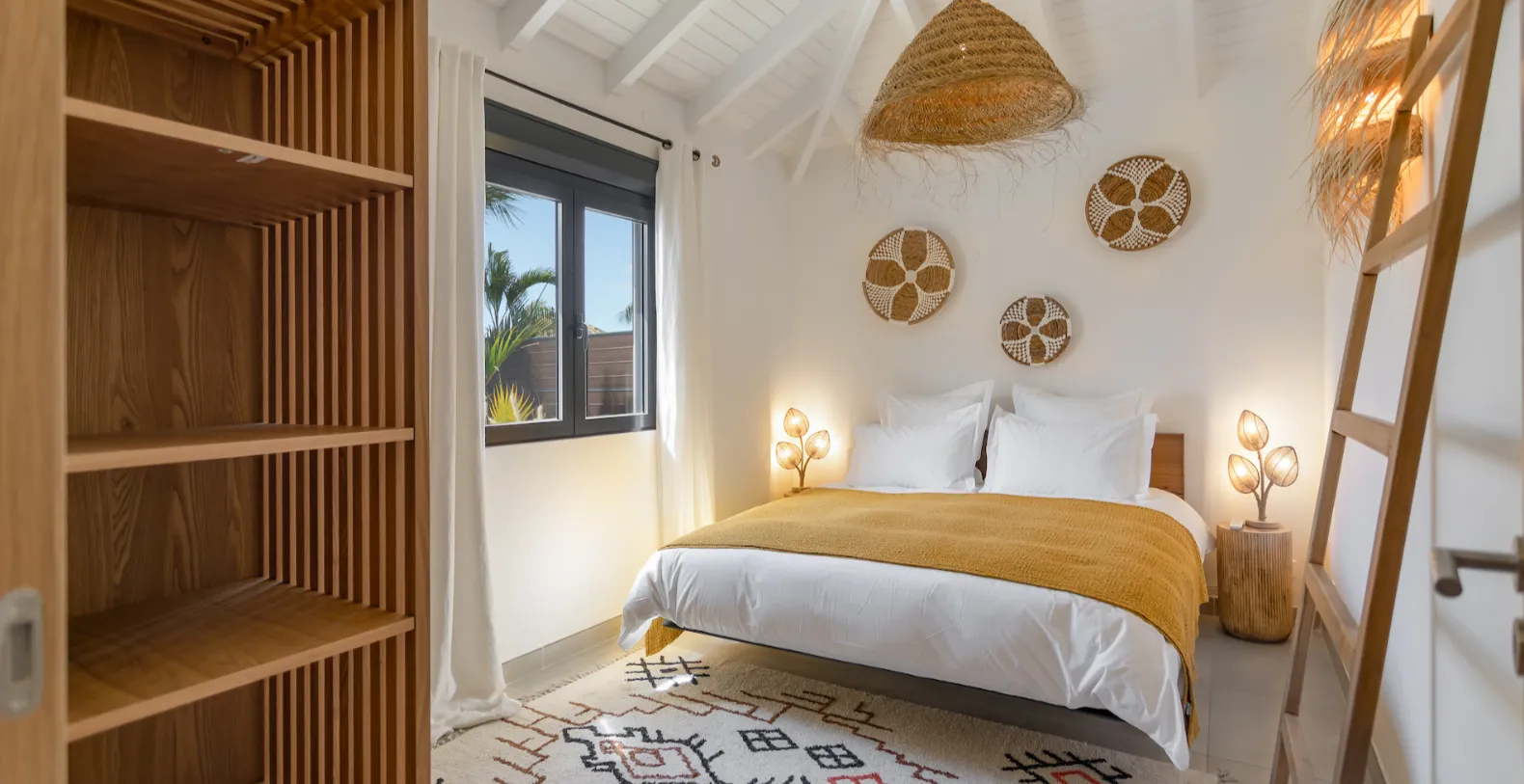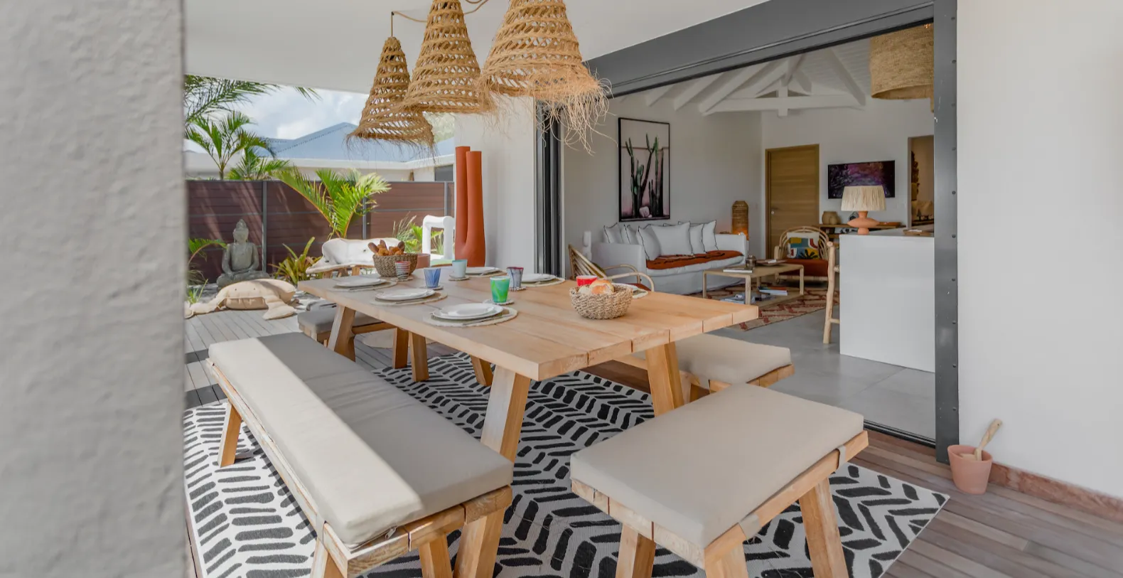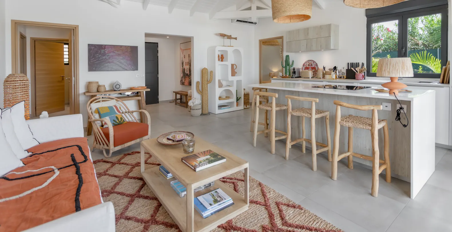 For those who enjoy gentle adventure, a private dock gives you direct access to the sea. Hop into the provided kayak and, after just ten minutes of paddling, arrive at the stunning Pinel Island – a pristine gem of Saint Martin. As the day fades, the terrace transforms into a private paradise—ideal for sunset cocktails or quiet moments beneath the palms. The exotic garden and natural materials throughout create an atmosphere of organic elegance, celebrating the best of Caribbean living.