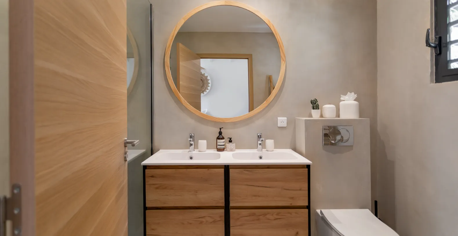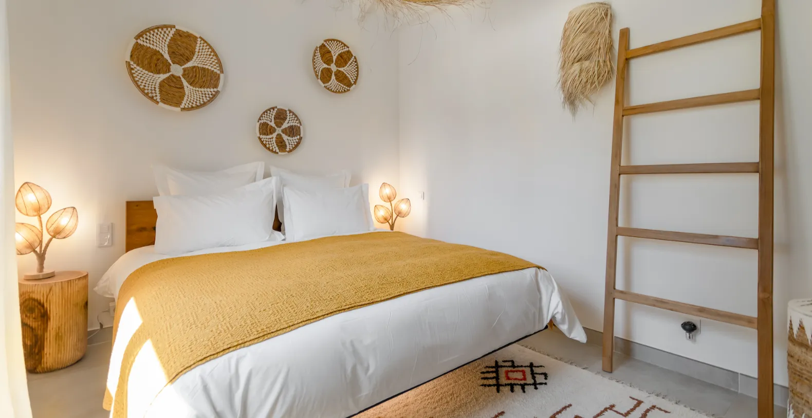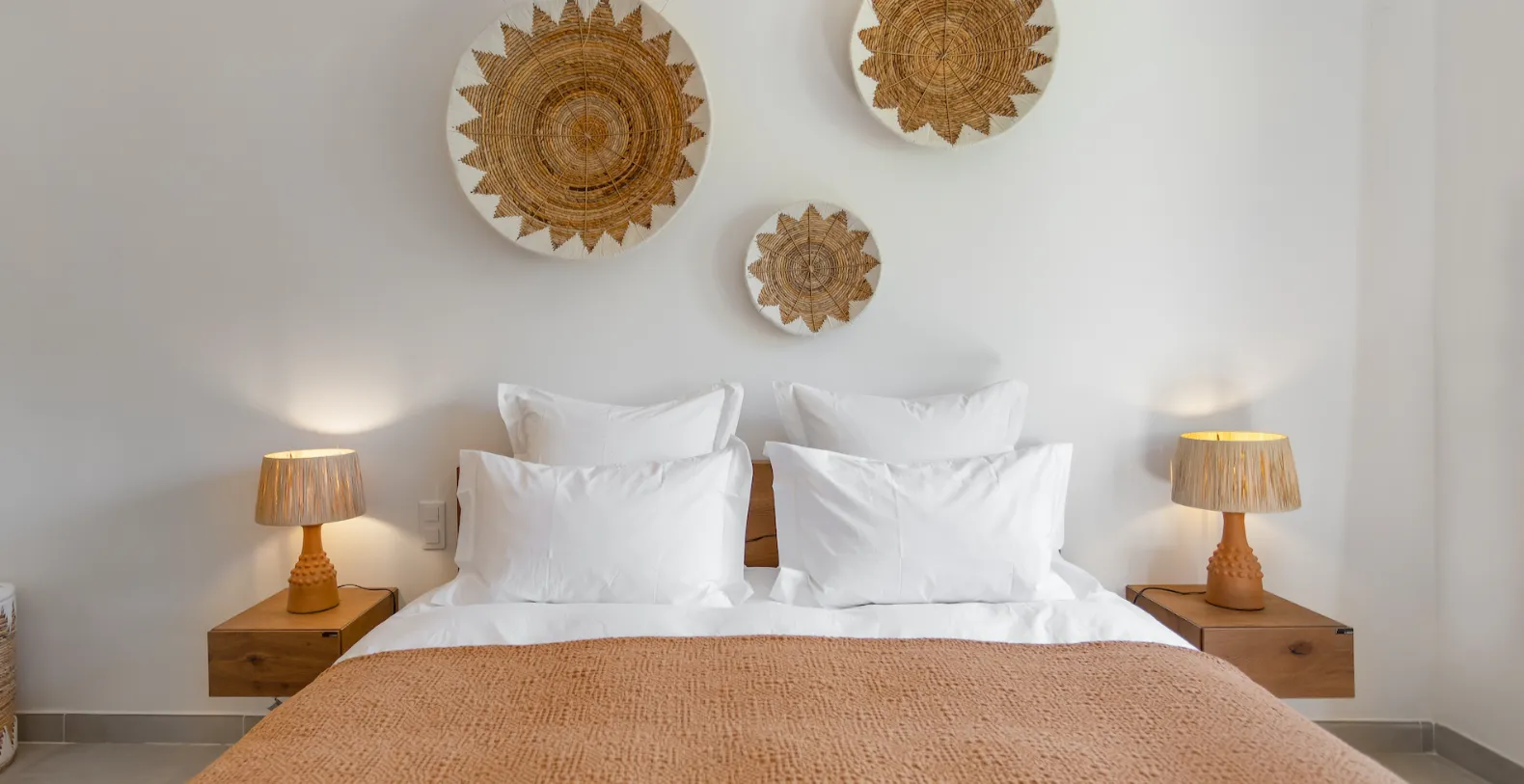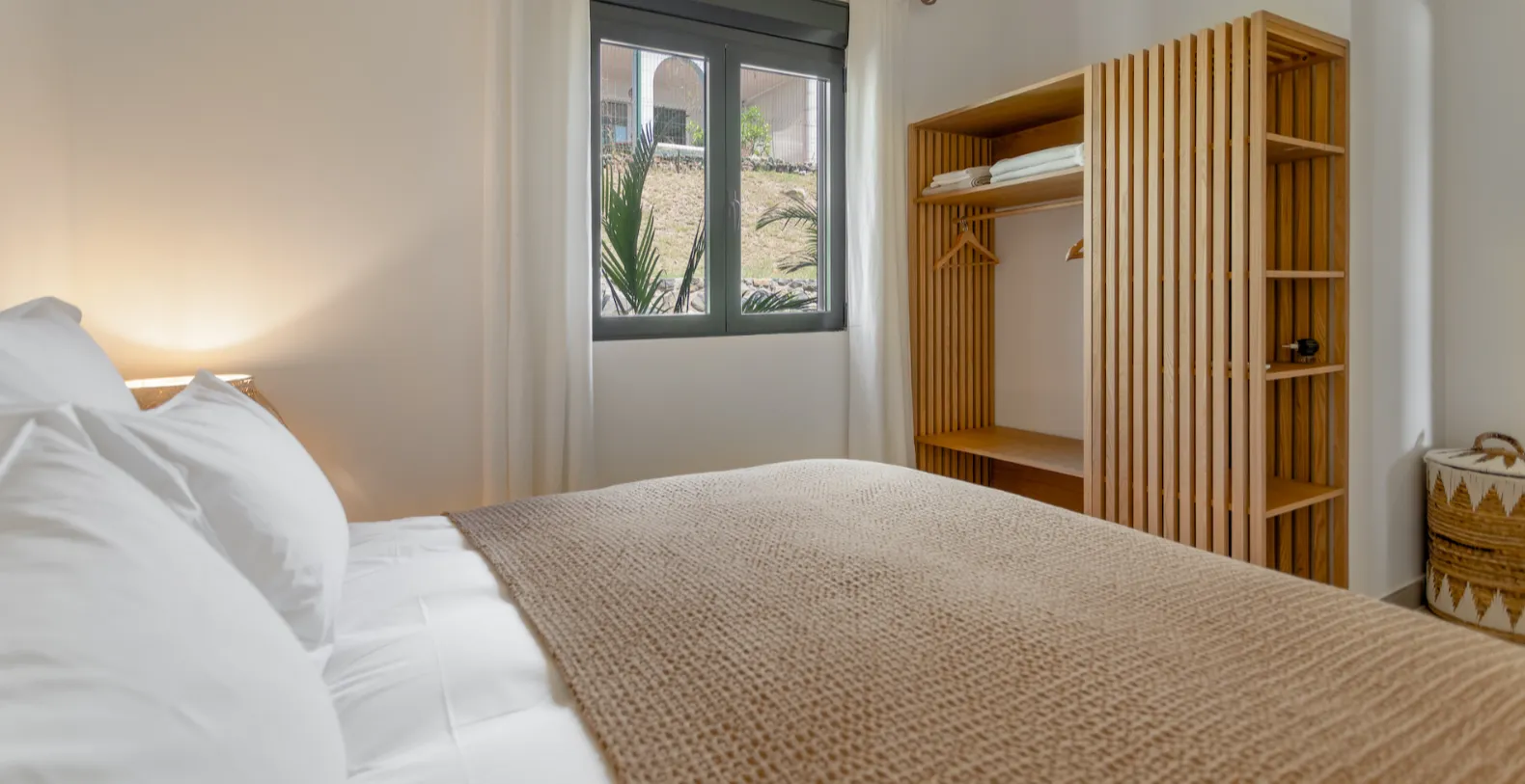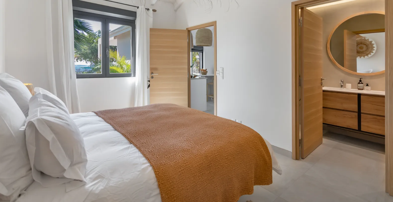 The three bedrooms are tranquil sanctuaries of rest, each featuring soft tones, luxurious linens, and serene garden or sea views. The master suite offers an elegant ensuite bathroom and opens directly to the terrace, allowing you to start your mornings with the gentle rhythm of the waves. The two additional bedrooms, each with king-size beds, share a modern bathroom, with one offering direct outdoor access for a true island wake-up experience.