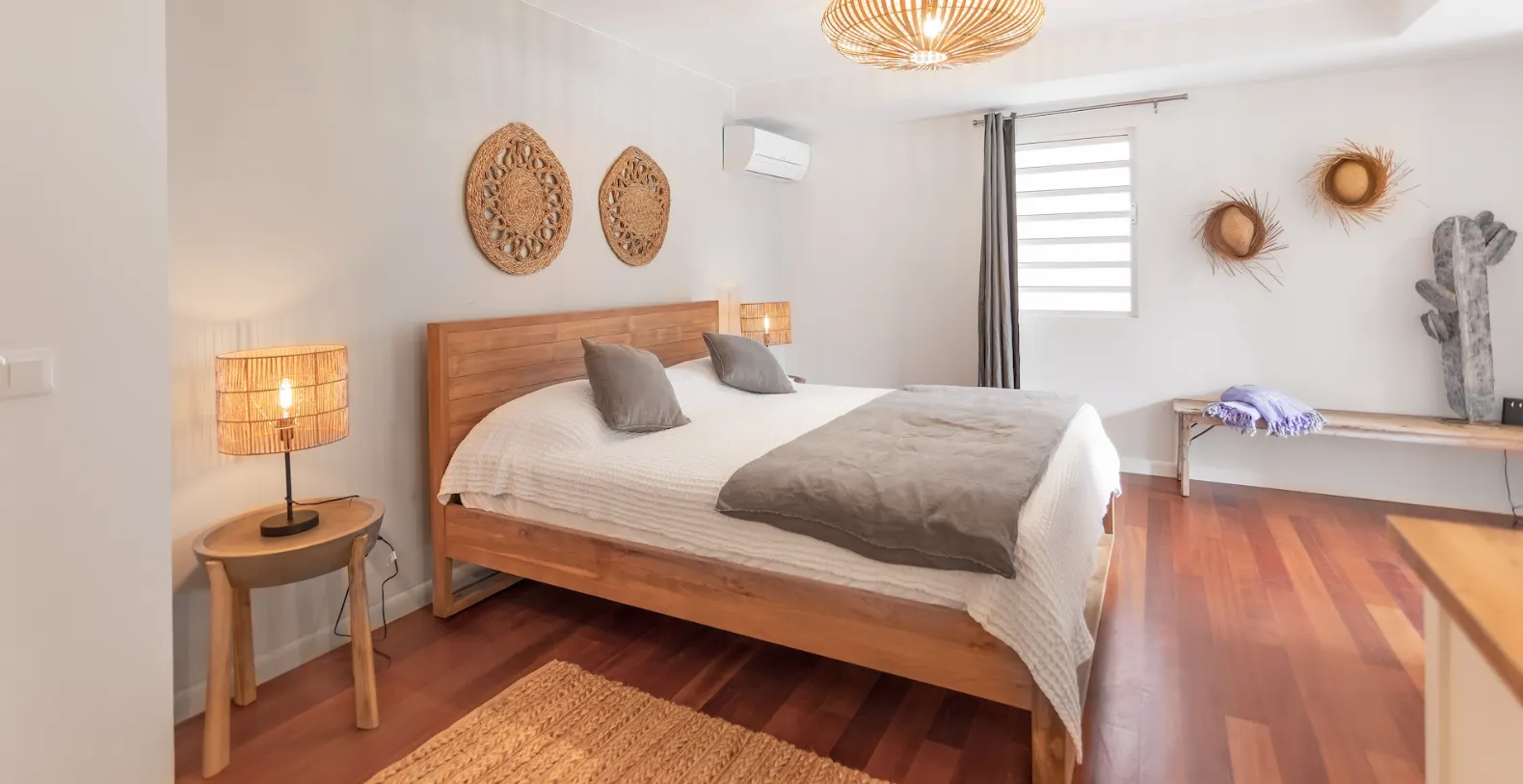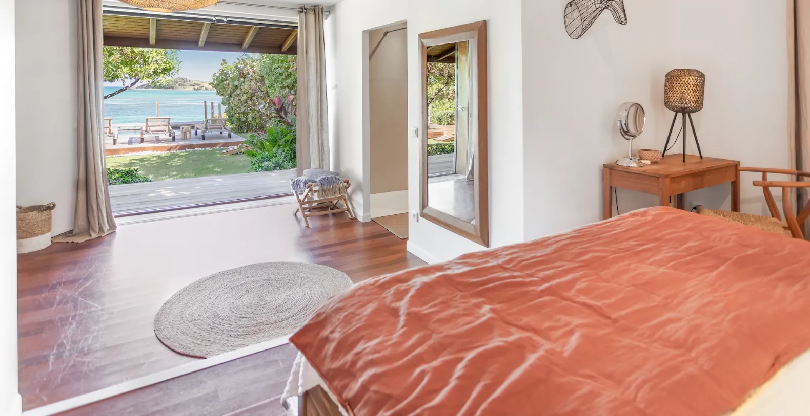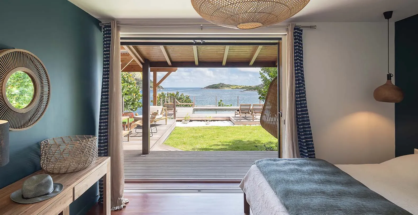Indoors, the villa continues to impress with a seamless flow between the kitchen, dining, and living spaces. The fully equipped kitchen is modern and practical, featuring warm wood cabinetry, sleek countertops, and all the essentials for cooking up island-inspired dishes. Open the sliding doors, and let the sea breeze drift through as you move from indoor comfort to outdoor relaxation. Villa Baltazar comfortably accommodates up to 10 guests across five stylish bedrooms (the villa could also be rented exclusively as three and four-bedroom vacation villa). Two of the bedrooms offer direct ocean views and open onto the deck, ideal for waking up to the sound of the waves and the sight of the sun rising over Pinel Island. Four bedrooms feature king-size beds, while the fifth is furnished with two single beds, making it perfect for kids or friends traveling together. Each bedroom is air-conditioned and features its own ensuite bathroom for added comfort and privacy.