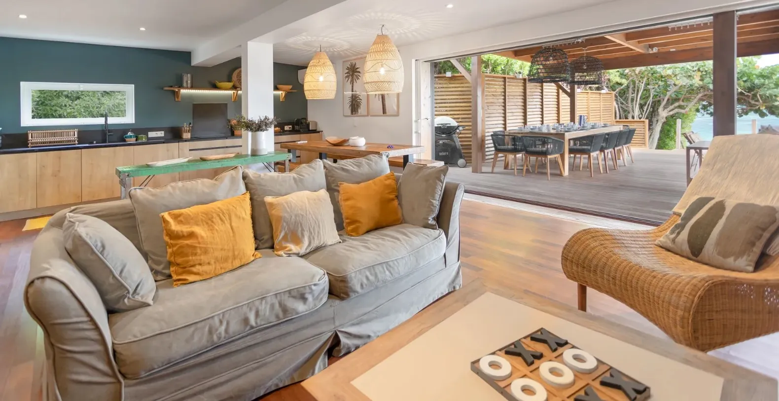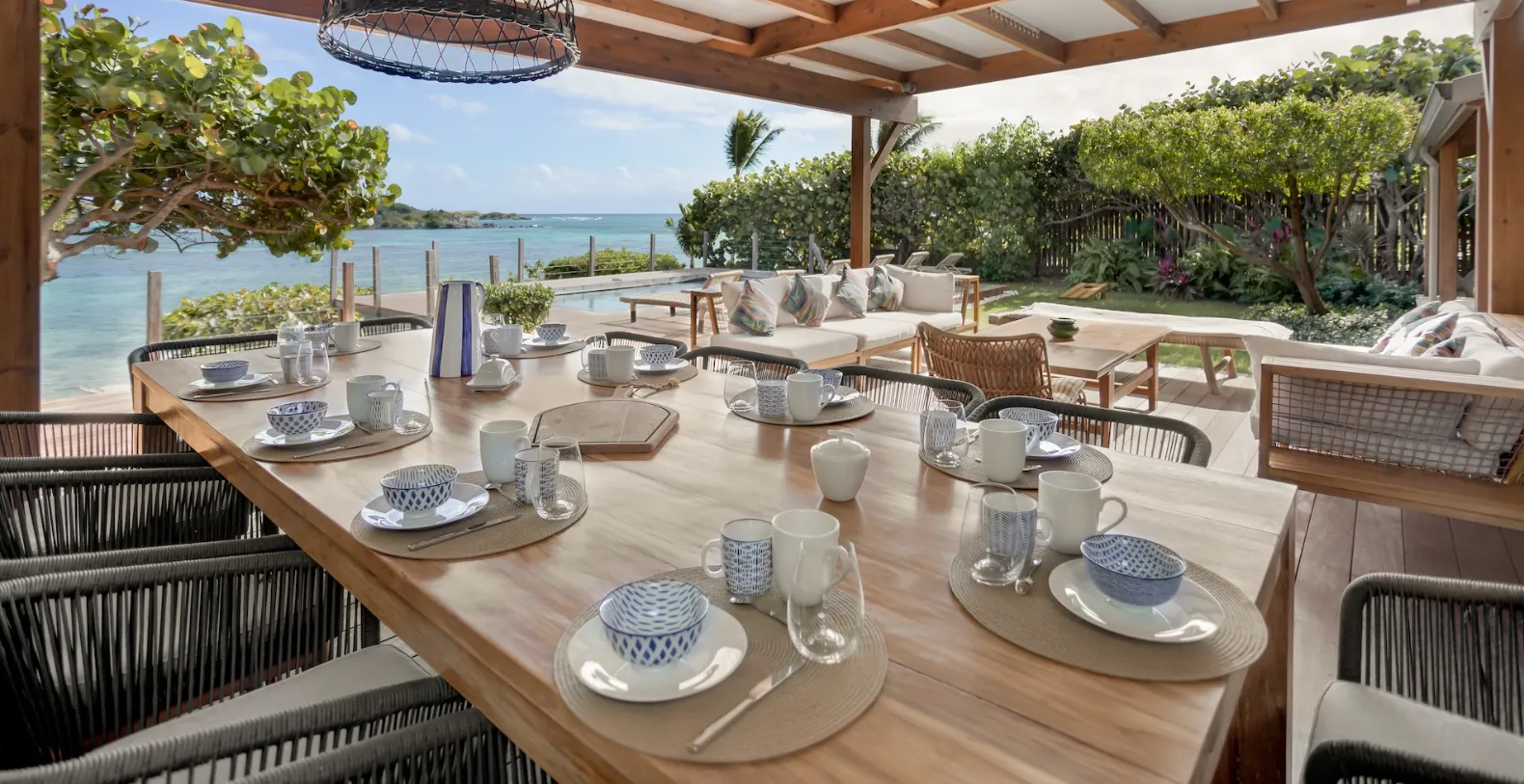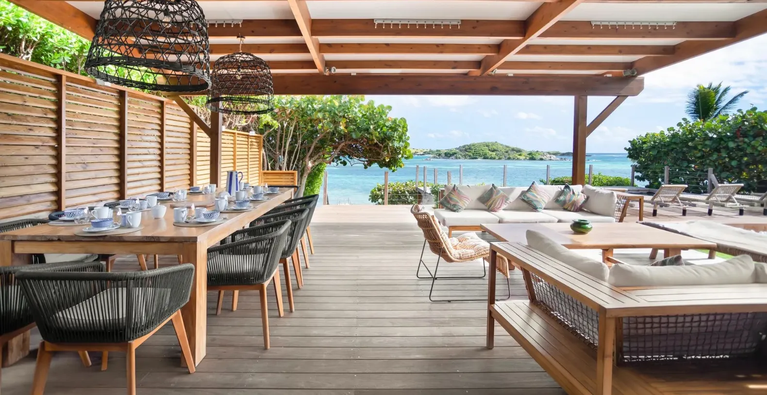 The villa’s recently renovated design brings a fresh, stylish aesthetic to a relaxed island escape. Natural wood tones, earthy textures, and tropical greenery blend effortlessly into the open-concept layout. Whether you're lounging under the shaded outdoor pavilion or soaking up the sun on the deck, the atmosphere here is one of laid-back luxury. The outdoor living space is a true highlight—centered around a serene pool deck overlooking the calm bay waters. Comfortable sun loungers invite you to bask in the warmth of the sun, while the covered terrace features both a chic lounge area and a large dining table—perfect for al fresco meals with panoramic ocean views as your backdrop.