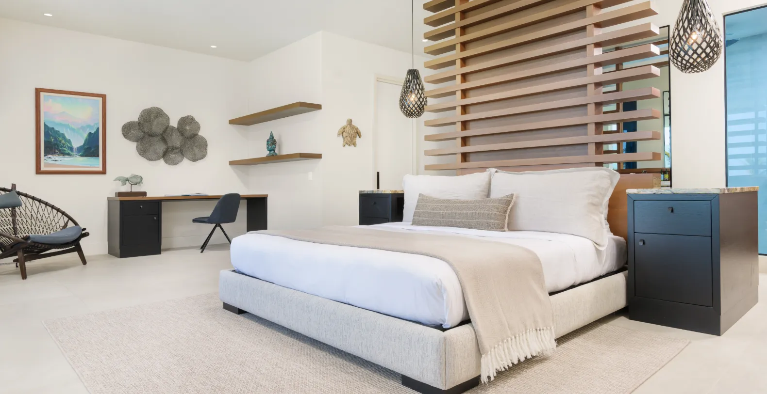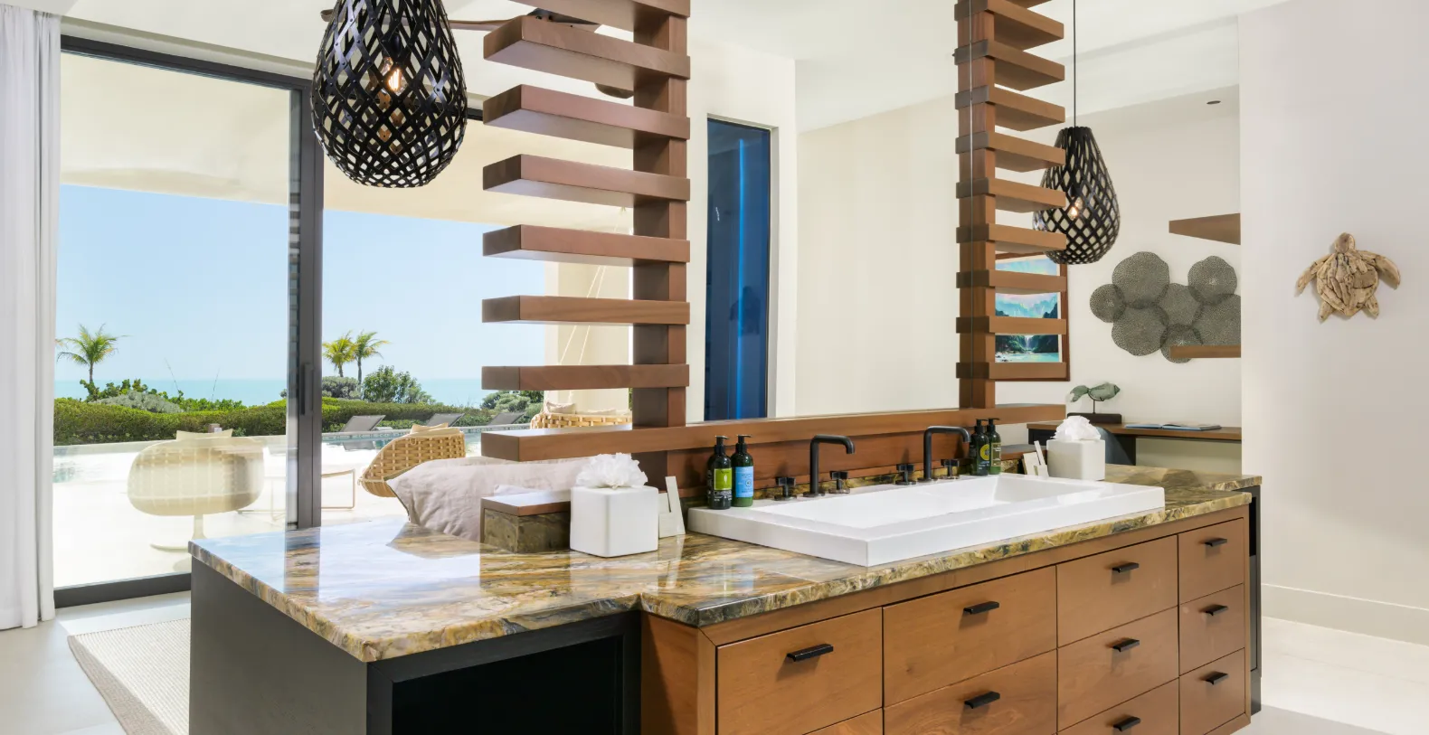 The Villa features a spacious open plan kitchen dining overlooking pool patio and ocean. The sleek, clean, fully appointed chef’s kitchen including Wolf Range, plenty of room for enjoying time with friends and uniquely designed to be both inviting and inspiring. This modern design is exactly what families cherish when they stay at a private luxury villa, as it means they get to enjoy their home away from home with all of the elements a luxury vacation should have.