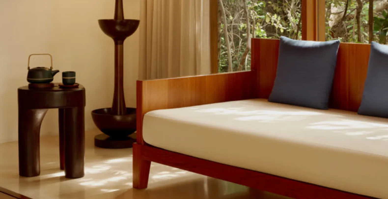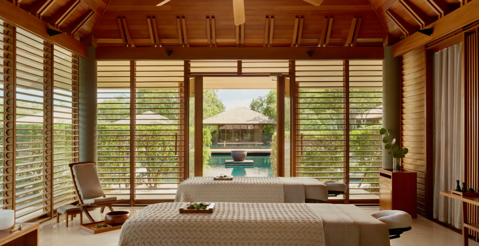 The pavilion features a private zero-edge swimming pool, a secluded walled garden, and a glassed-in relaxation alcove—ideal for sun-drenched afternoons or peaceful contemplation. Inside, high ceilings and floor-to-ceiling sliding glass doors flood the space with natural light, creating a harmonious connection with the surrounding landscape. The interior boasts a king-size bed, a comfortable living area with a reading chair and writing desk, and an ensuite bathroom equipped with a freestanding bathtub and twin vanities. Natural wood finishes and a neutral color palette enhance the calming ambiance, fostering a restful atmosphere throughout.