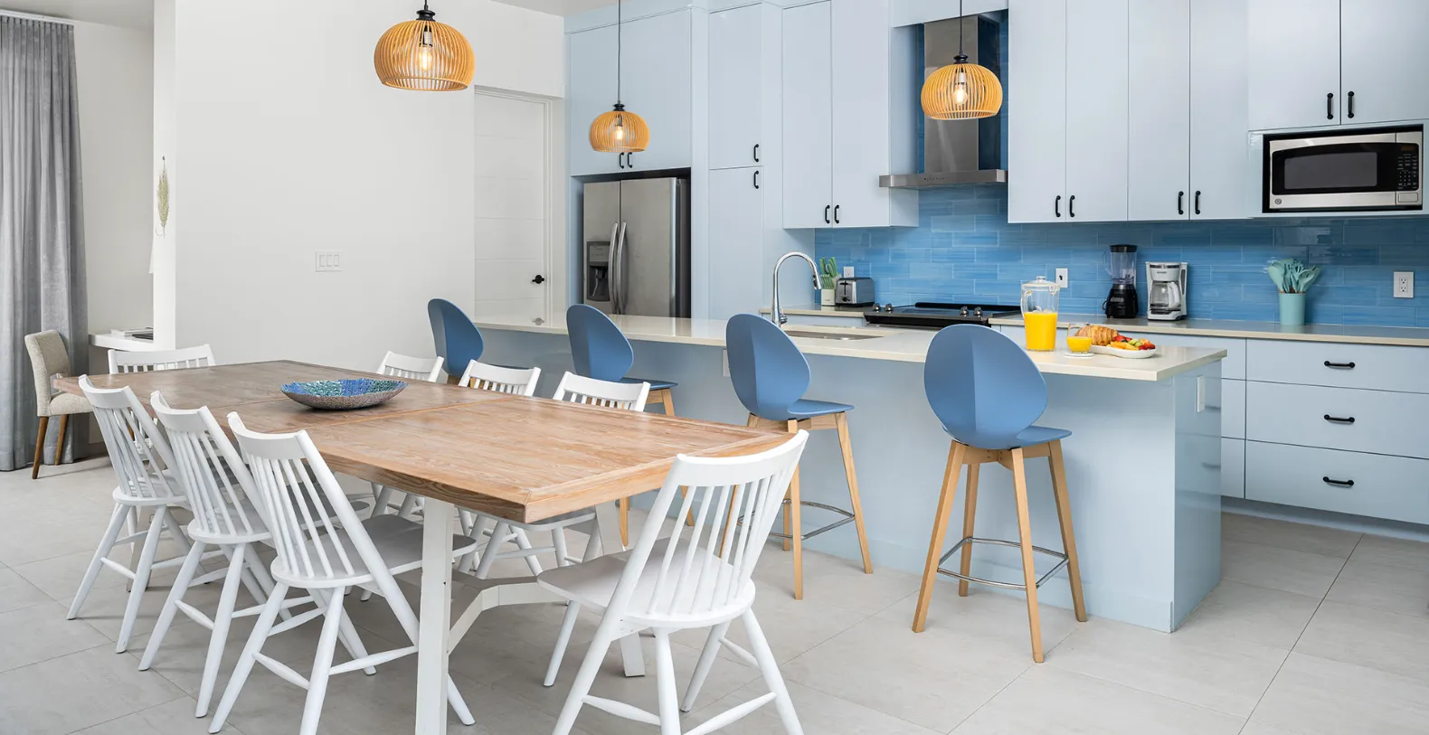 The villa unfolds across two thoughtfully designed levels and comfortably sleeps up to eight guests. Each of the four bedrooms boasts an ocean view and an ensuite bathroom, ensuring comfort and privacy. The primary bedroom features a king-size bed, while the remaining three rooms are outfitted with queen-size beds, making it ideal for families or small groups of friends traveling together. At the heart of the villa is a bright, open-concept living area furnished with plush seating and a large Smart TV, perfect for movie nights or a quiet evening indoors. Sliding glass doors open to the expansive beachfront terrace, blurring the lines between indoor and outdoor living. The fully equipped kitchen, designed with soft coastal hues, offers a breakfast bar and adjacent dining table, perfect for group meals or casual brunches.