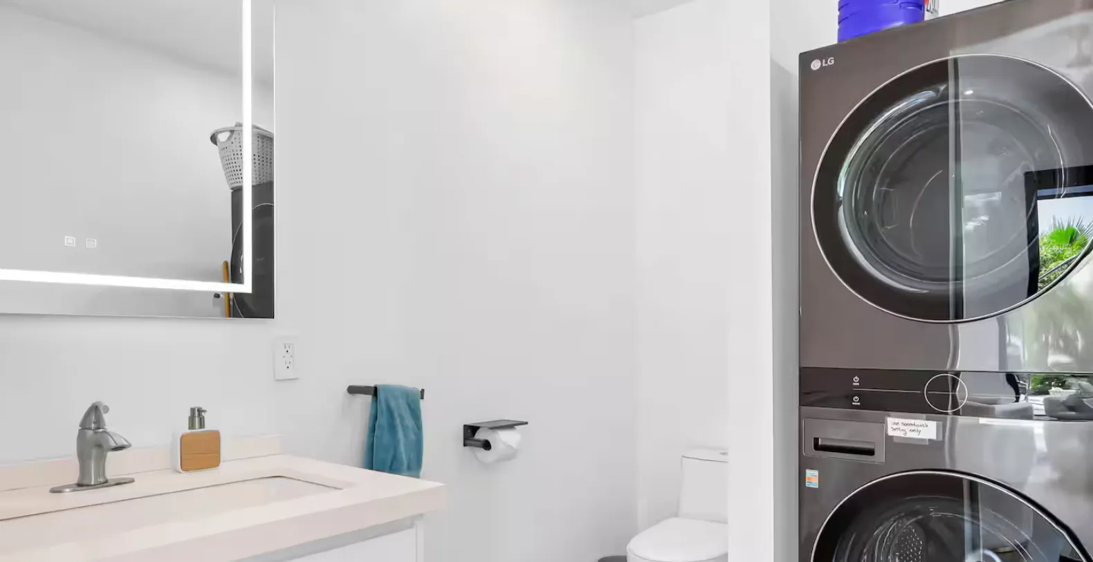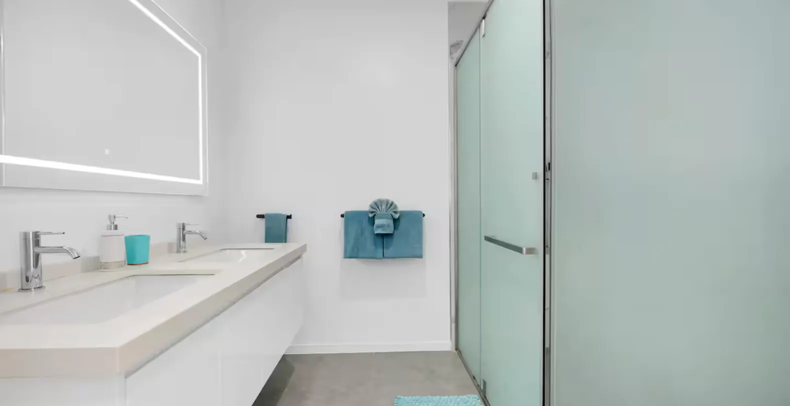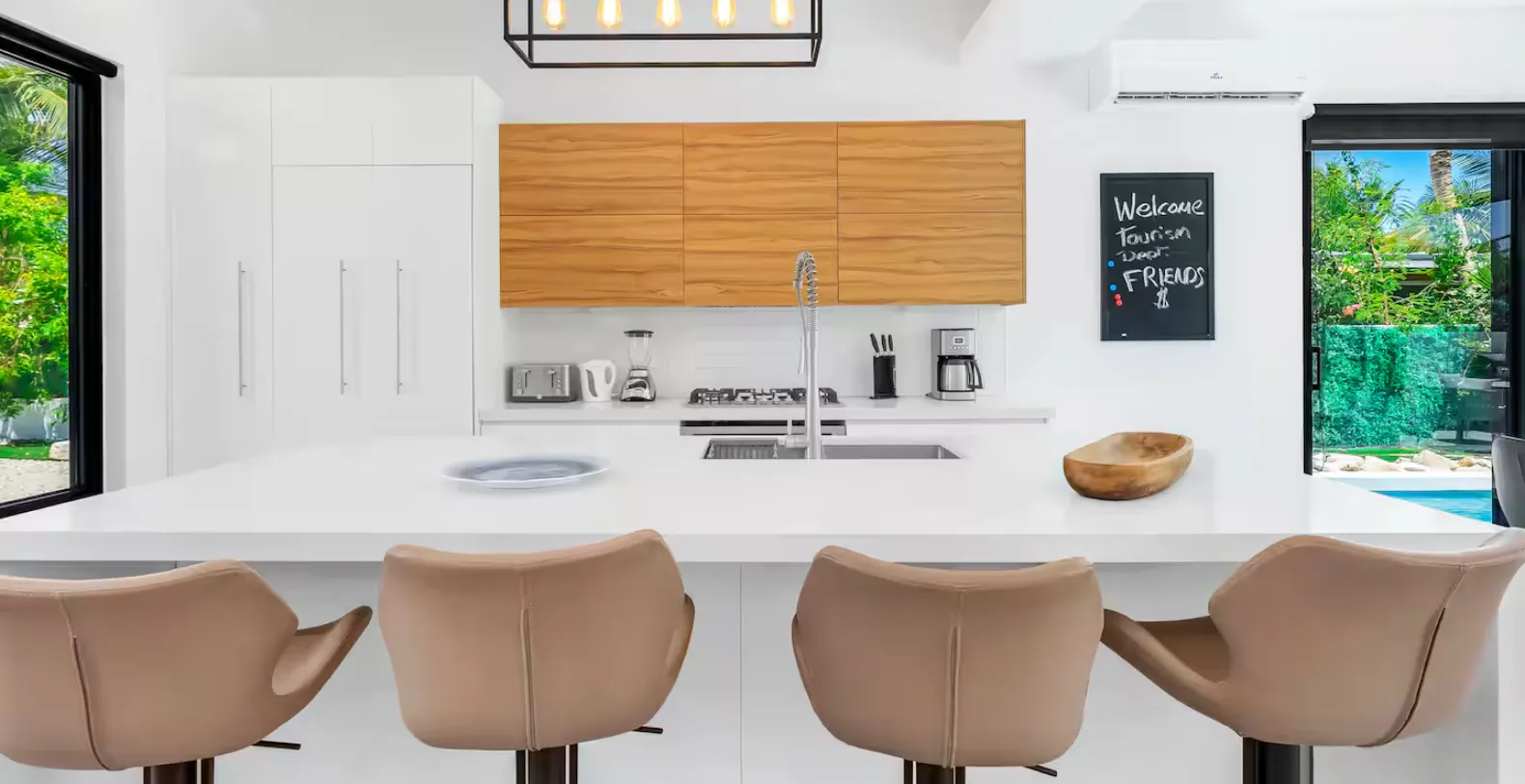Step inside to an open-concept living space filled with natural light, thanks to large sliding glass doors that create a seamless flow between indoor comfort and outdoor enjoyment. The living room features plush, modern seating and a large smart TV, making it an ideal spot to unwind after a day on the beach. Soft neutral tones and island-inspired décor create an atmosphere that feels both relaxing and elevated. The fully equipped kitchen is a standout, featuring clean white cabinetry, warm wood accents, and a spacious island with seating for four. Whether you’re preparing a quick breakfast before heading to the beach or enjoying a cozy dinner at home, this kitchen has everything you need. A convenient half-bath is also located on the main floor. Each bedroom offers its own en-suite bathroom, providing privacy and comfort for couples, friends, or families. A modern half-bath on the main floor adds extra convenience.