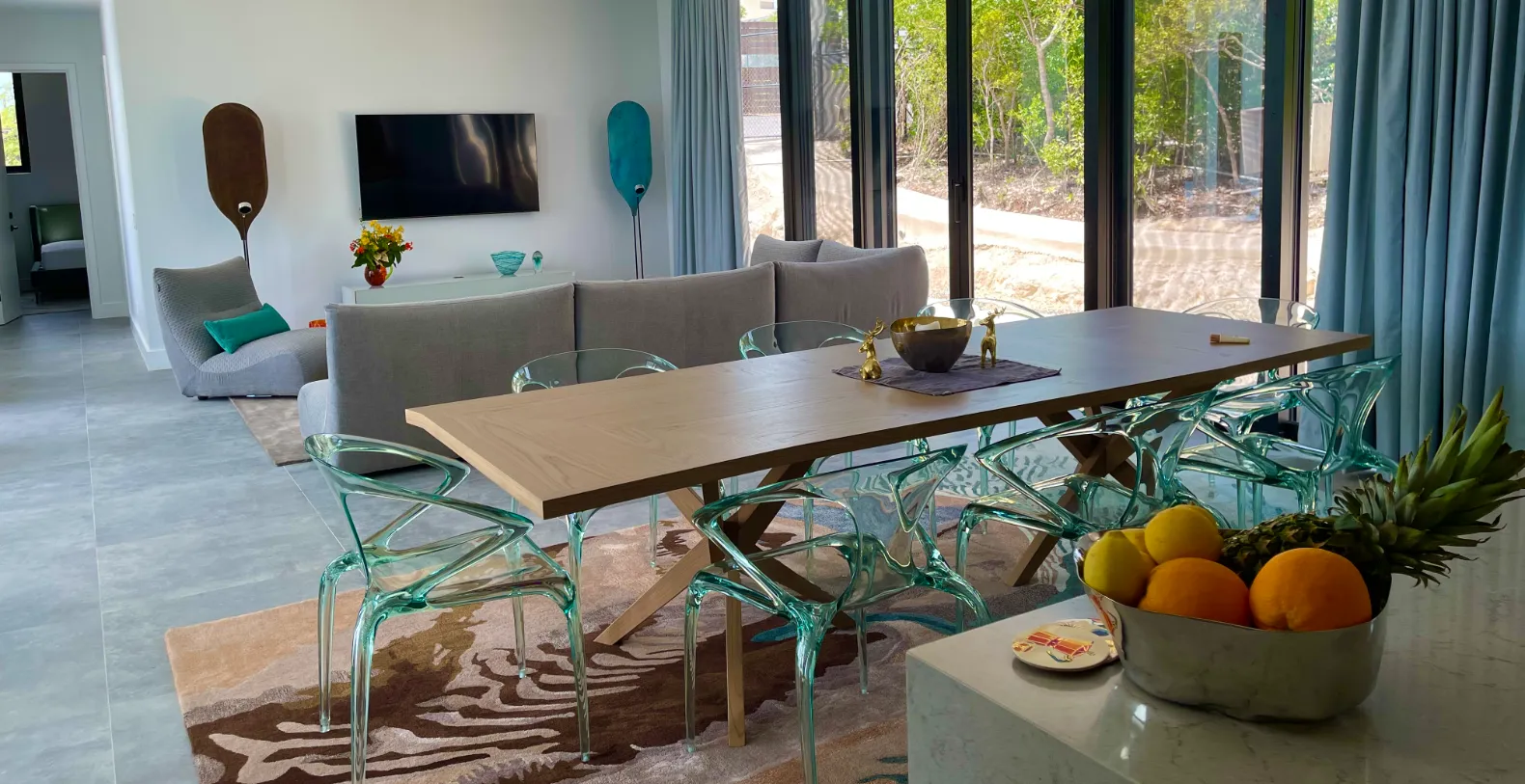 Luna & Pluto Villas are two stylish four-bedroom villas, identically designed by one of the world-leading furniture designers: ROCHE BOBOIS Paris. The villas can be rented separately, accommodating up to 8 guests per villa, or combined for larger groups offering a total of 8 bedrooms to its guests. Every bedroom is individually furnished with chic decor, blending modern aesthetics with the relaxed ambiance of island living. Bedrooms come equipped with spacious closets and in-room TVs. The open-concept living areas in both villas are designed for relaxation and entertainment. Large glass doors allow natural light to flood the interiors, offering seamless indoor-outdoor living with views of the lush surroundings and the azure waters beyond. The living room features plush seating arrangements in soft tones, complemented by vibrant accents that evoke the beauty of the island. The room naturally transitions into a dining area, offering a seating for eight guests and right off the dining table is the fully equipped kitchen with a spacious breakfast bar.