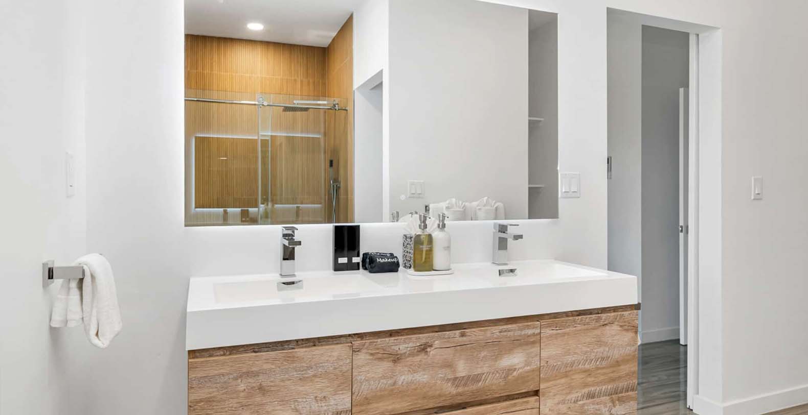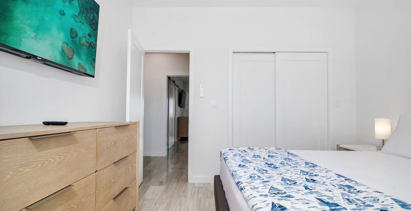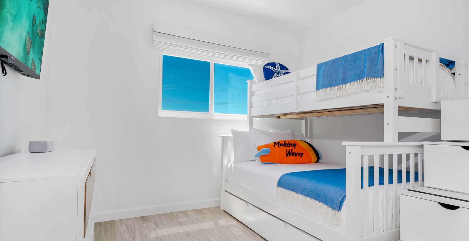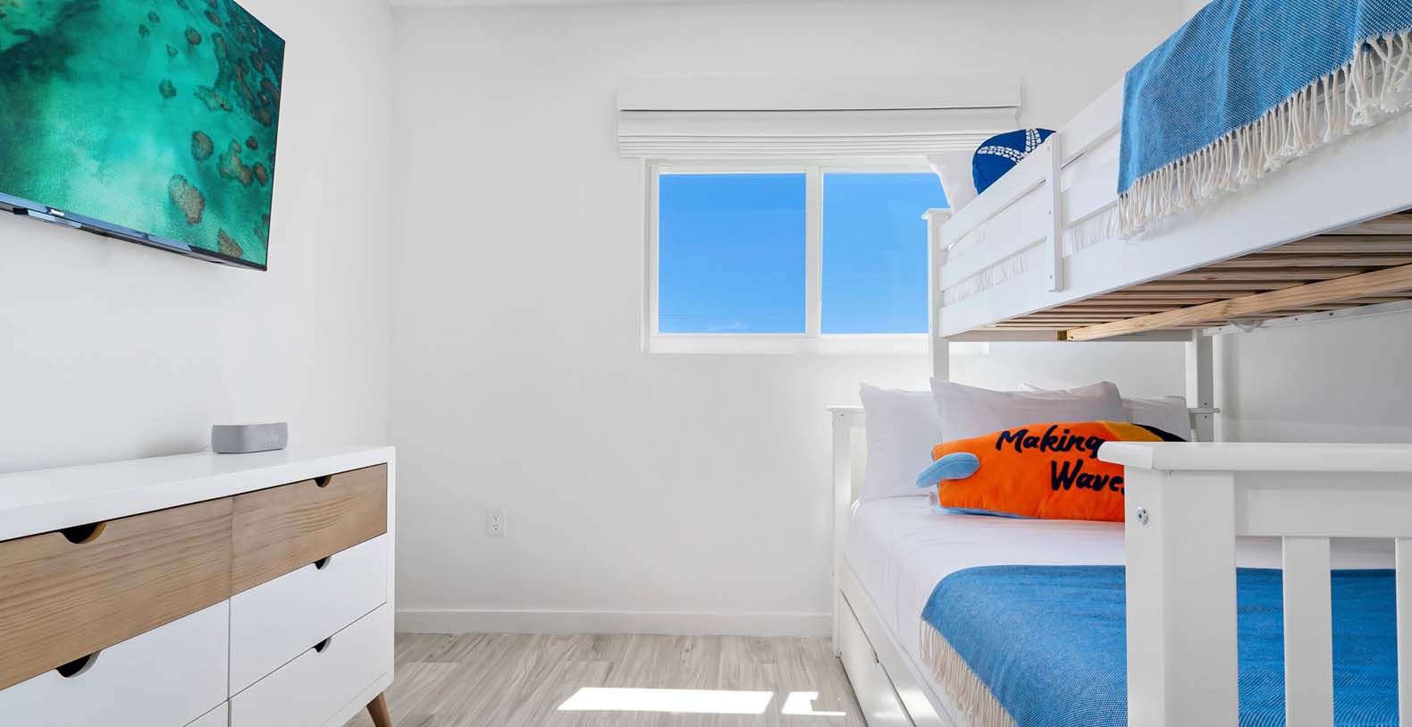 All three bedrooms are located on the second floor. At the top of the stairs, the master suite awaits with a king-sized bed, a 42-inch wall-mounted flat-screen TV, a spacious closet, and an en-suite bathroom featuring a walk-in glass shower and a vanity with a smart mirror. The master bedroom is also equipped with a ceiling fan and a split-unit AC for maximum comfort. Across the landing, you’ll find two additional guest bedrooms The first offers a bunk bed with a queen bed on the bottom and a single bed on top, along with a wall-mounted TV, ceiling fan, and split-unit AC. The second guest bedroom features a king bed, a spacious closet (with a safe), a wall-mounted flat-screen TV, ceiling fan, and split-unit AC. Both guest bedrooms share a modern bathroom at the end of the hall.