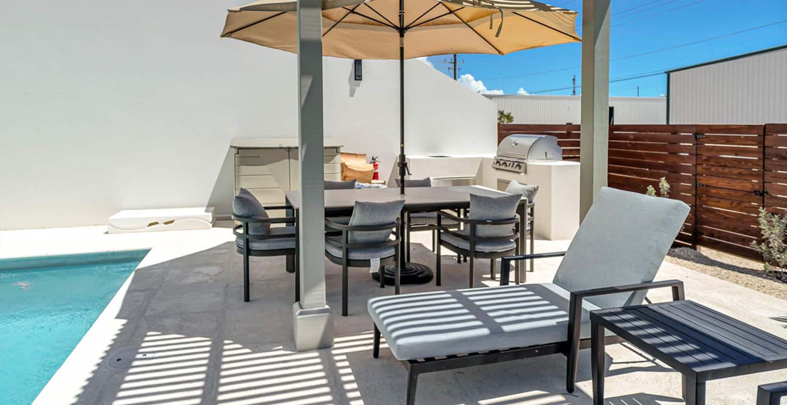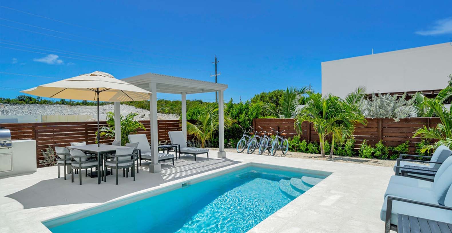 Outside, the villa’s beautifully landscaped exterior is just as impressive as the interior. The private deck boasts a pool with chaise loungers, a sectional outdoor sofa with a fire pit, and a state-of-the-art pavilion-covered BBQ area. An additional outdoor dining table makes it easy to enjoy dinner under the stars. Guests will also find bicycles, beach chairs, and umbrellas available for use. This vacation home is spacious, comfortable, and perfect for small families or groups of friends looking for a private escape while still being within walking distance of Grace Bay’s world-renowned amenities.
