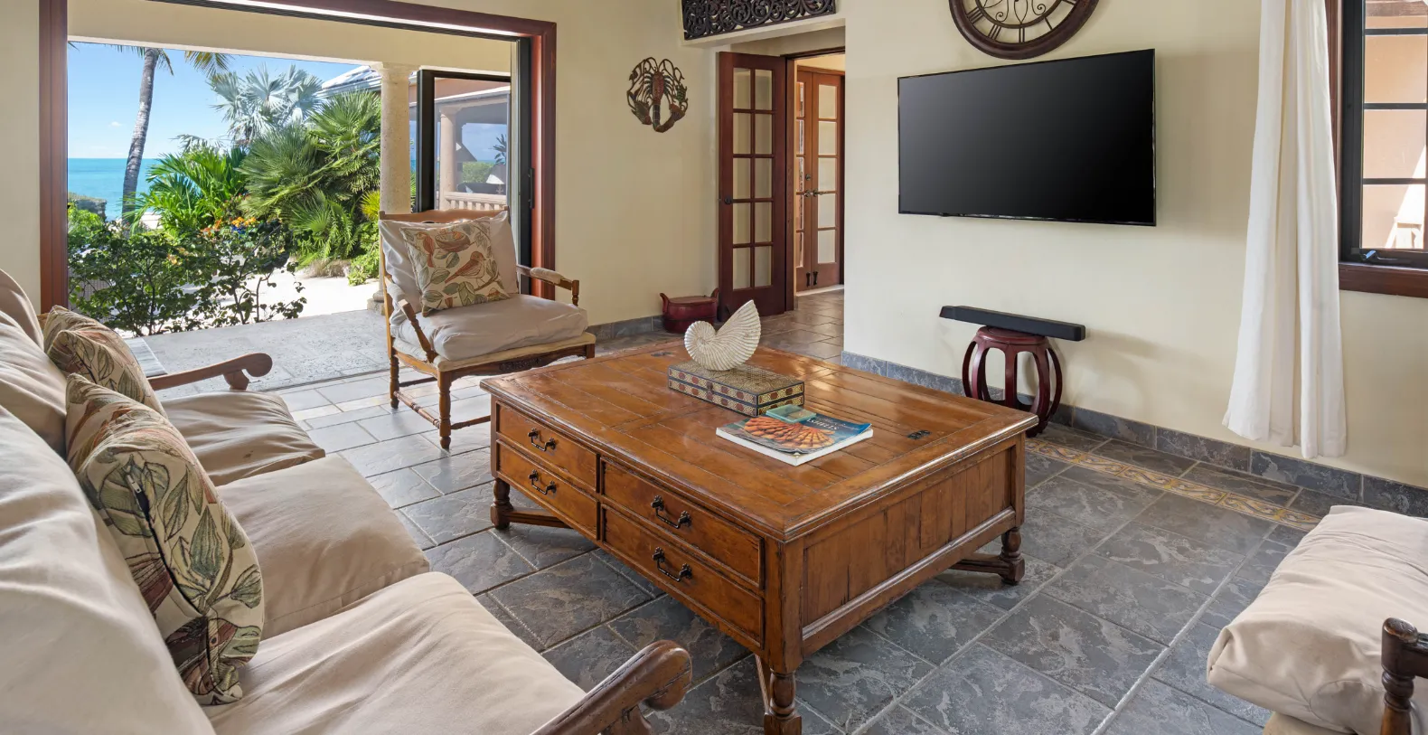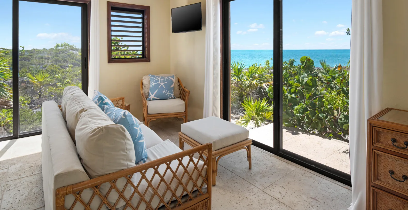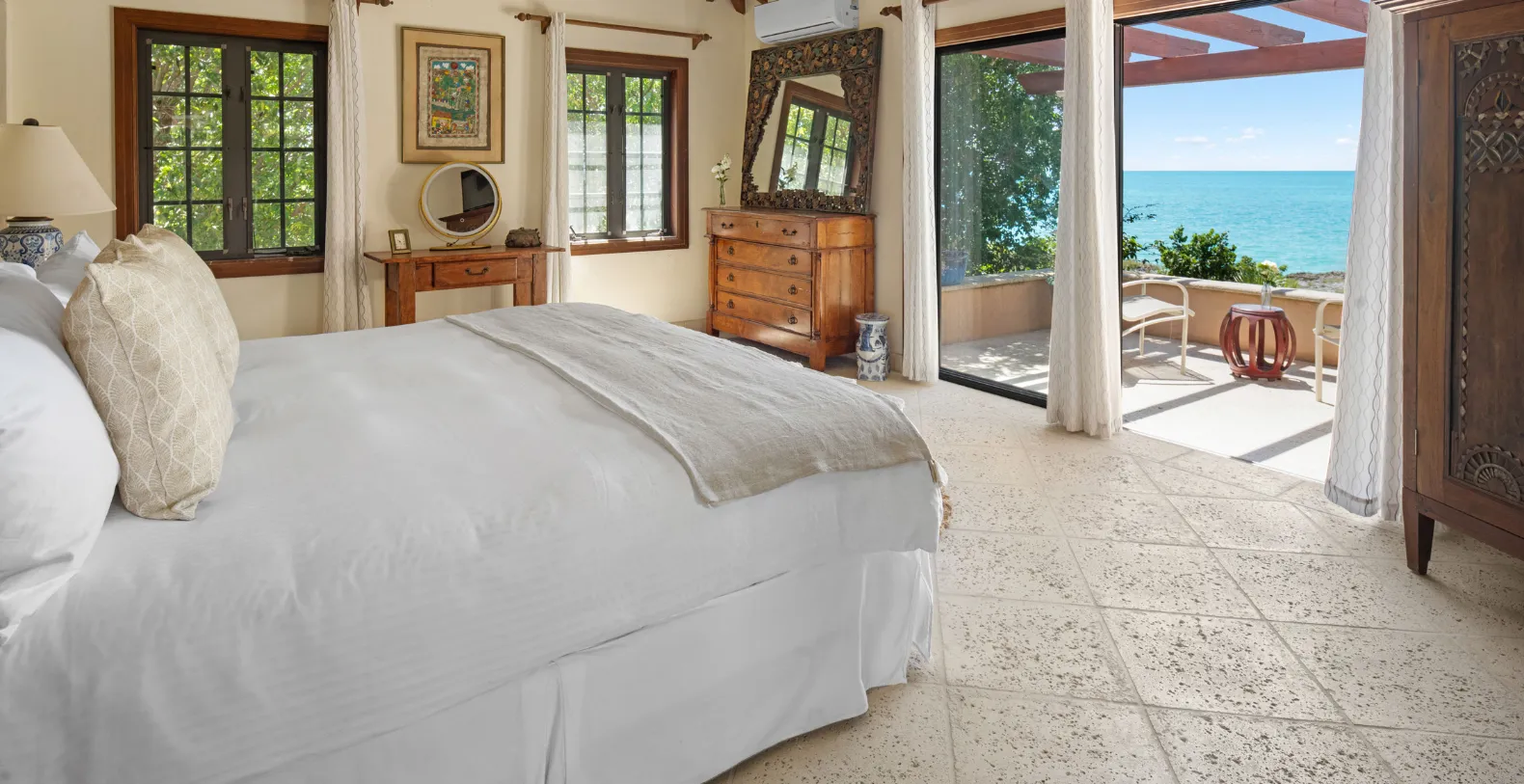 Steps from the ocean’s edge and located in the exclusive Silly Creek Estate on Turks & Caicos, Villa Caona is your next Caribbean vacation retreat. Surrounded by lush tropical gardens and panoramic sea views, this 4,500-square-foot oceanfront retreat offers outstanding views, amenities and island charm. Expansive screened terraces, vaulted ceilings with exposed beams, and rich wood furnishings create a serene, open-air ambience, typical for this majestic island.