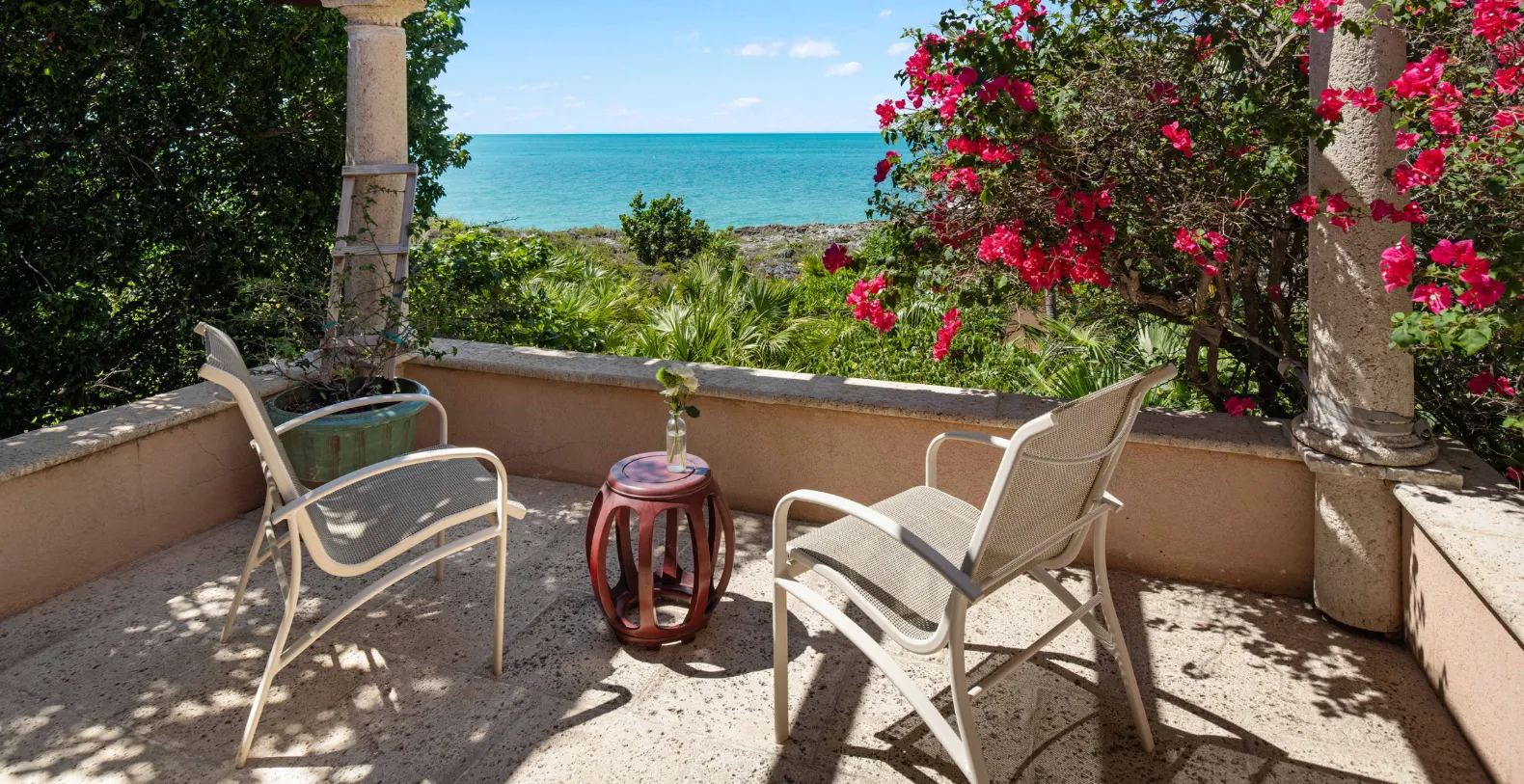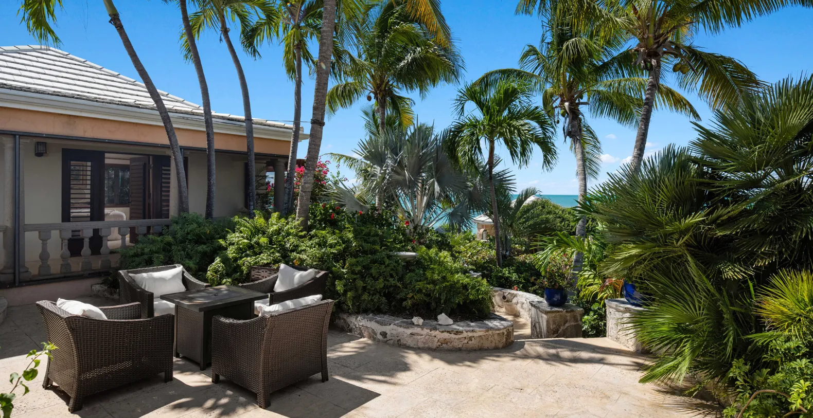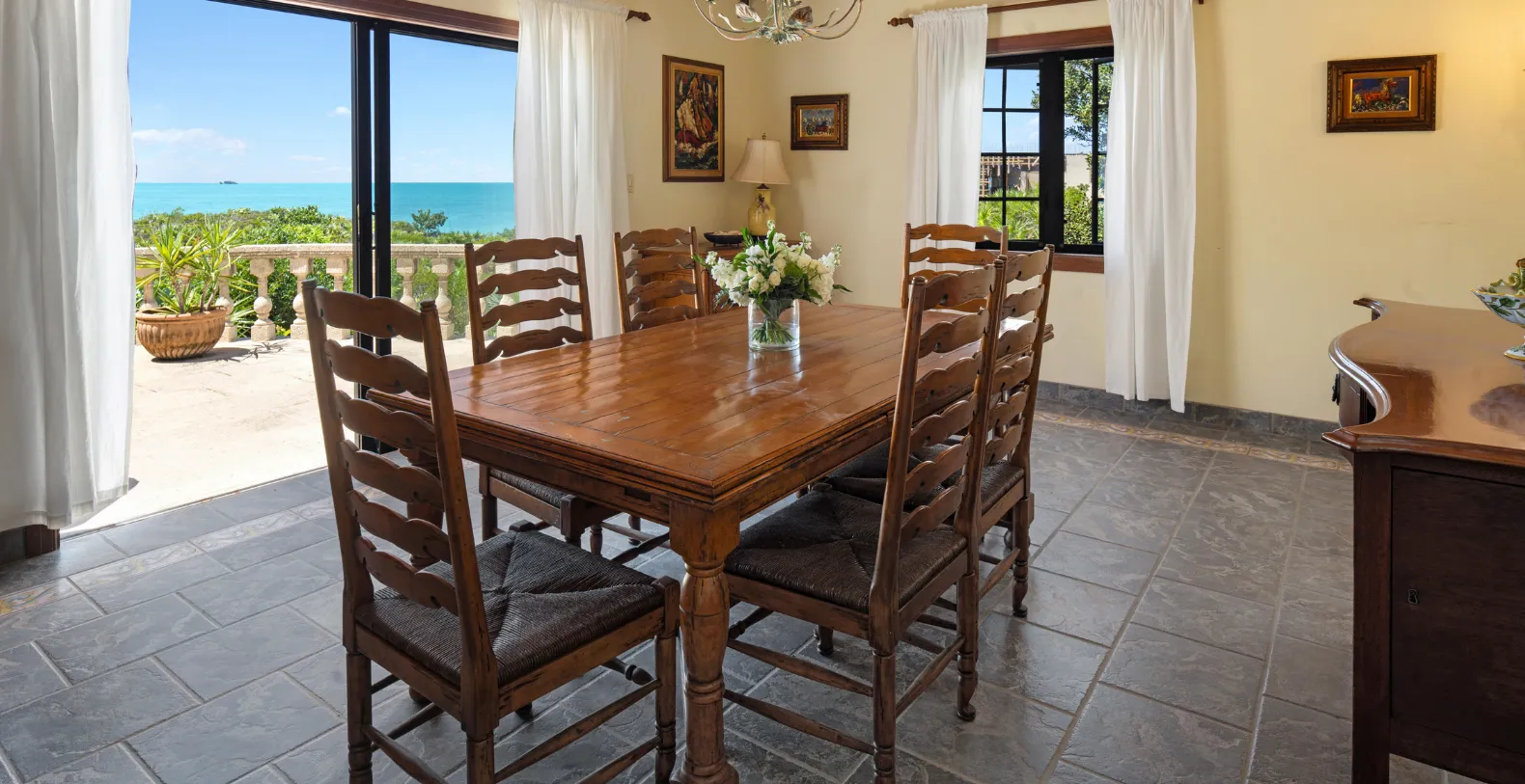 Steps from the ocean’s edge and located in the exclusive Silly Creek Estate on Turks & Caicos, Villa Caona is your next Caribbean vacation retreat. Surrounded by lush tropical gardens and panoramic sea views, this 4,500-square-foot oceanfront retreat offers outstanding views, amenities and island charm. Expansive screened terraces, vaulted ceilings with exposed beams, and rich wood furnishings create a serene, open-air ambience, typical for this majestic island.