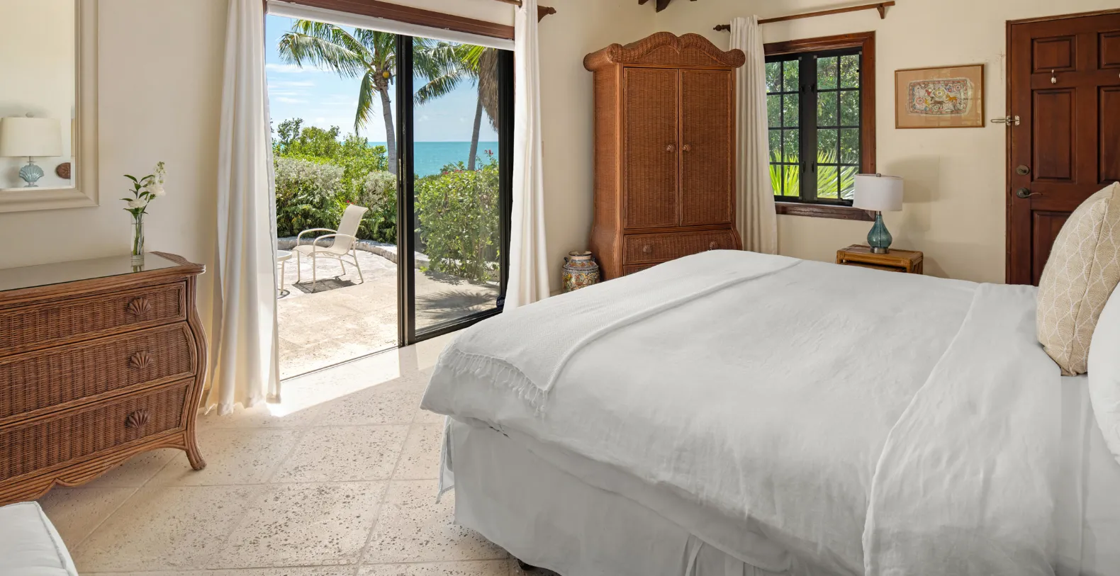 Villa Caona offers three spacious, air-conditioned bedrooms with luxury ensuite bathrooms, accommodating up to six guests. Two bedrooms are located on the main level, each with its own terrace and sweeping ocean vistas. The third bedroom sits adjacent to the pool deck on the lower level and features a private terrace, en suite bathroom, and outdoor shower. Each room is designed as a peaceful retreat, with breezy island décor and direct access to the surrounding gardens or sea views.