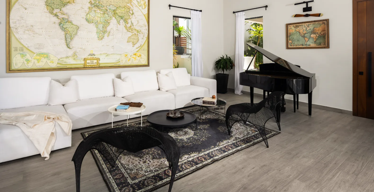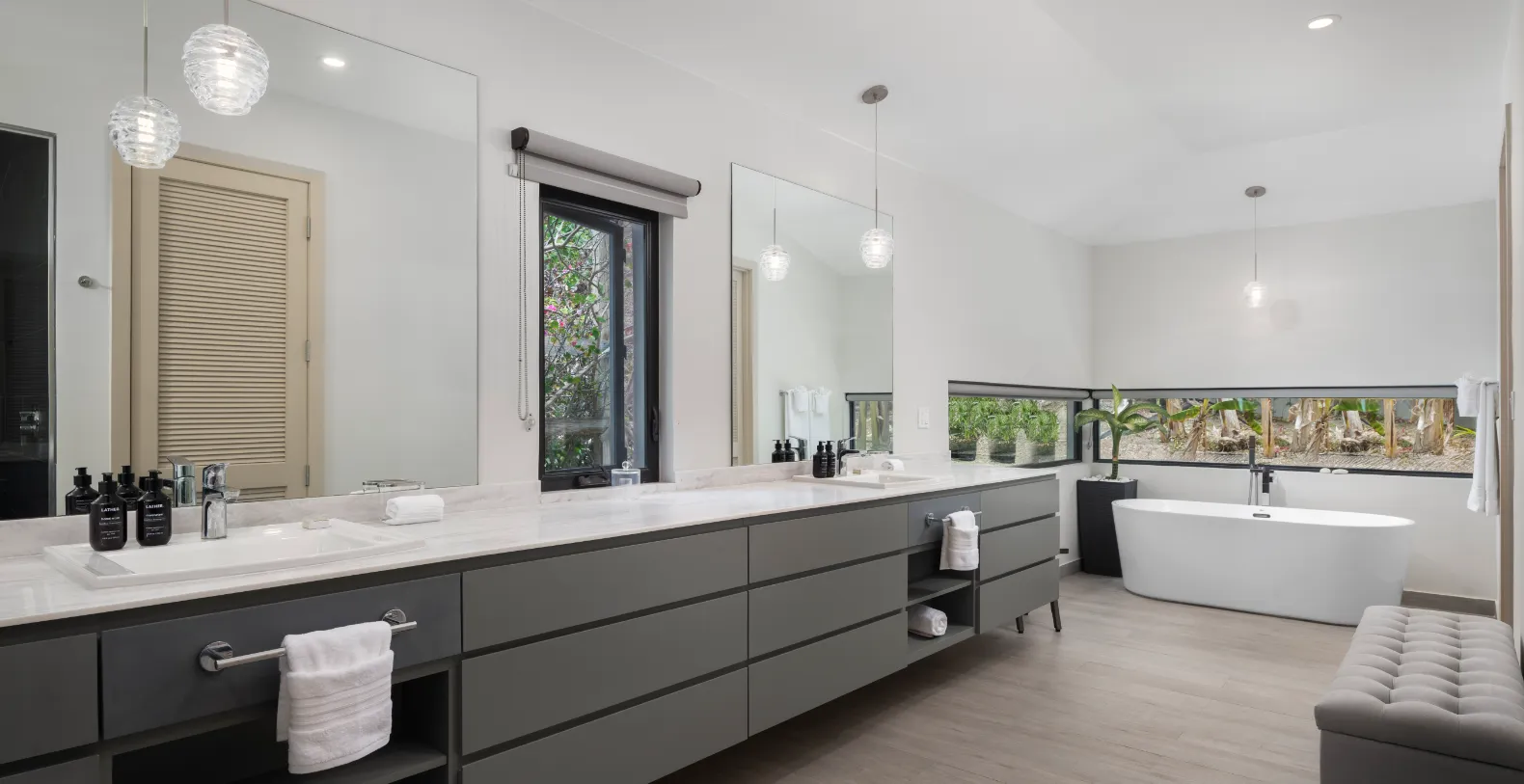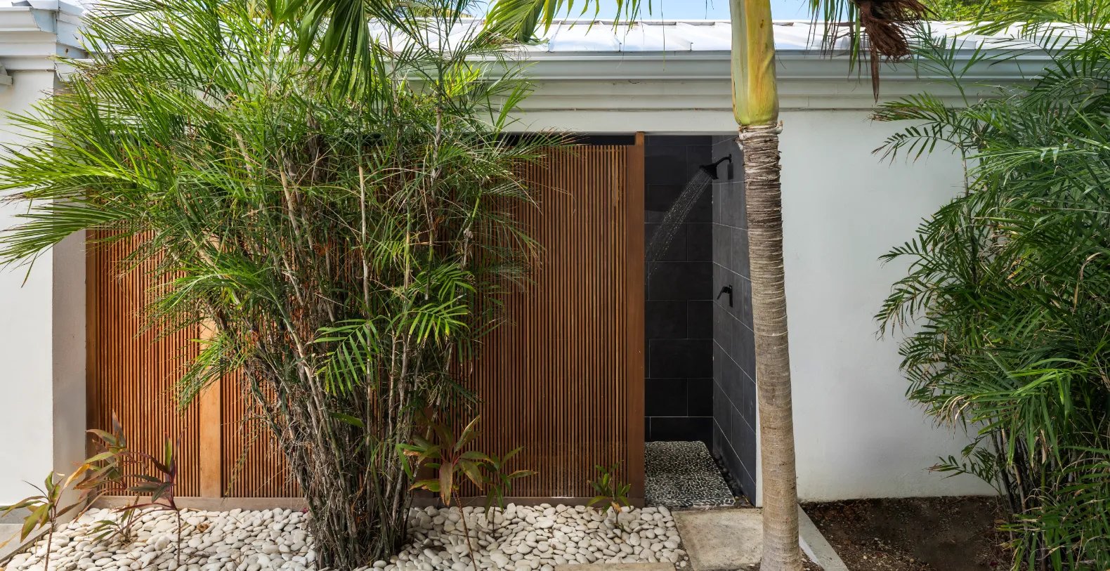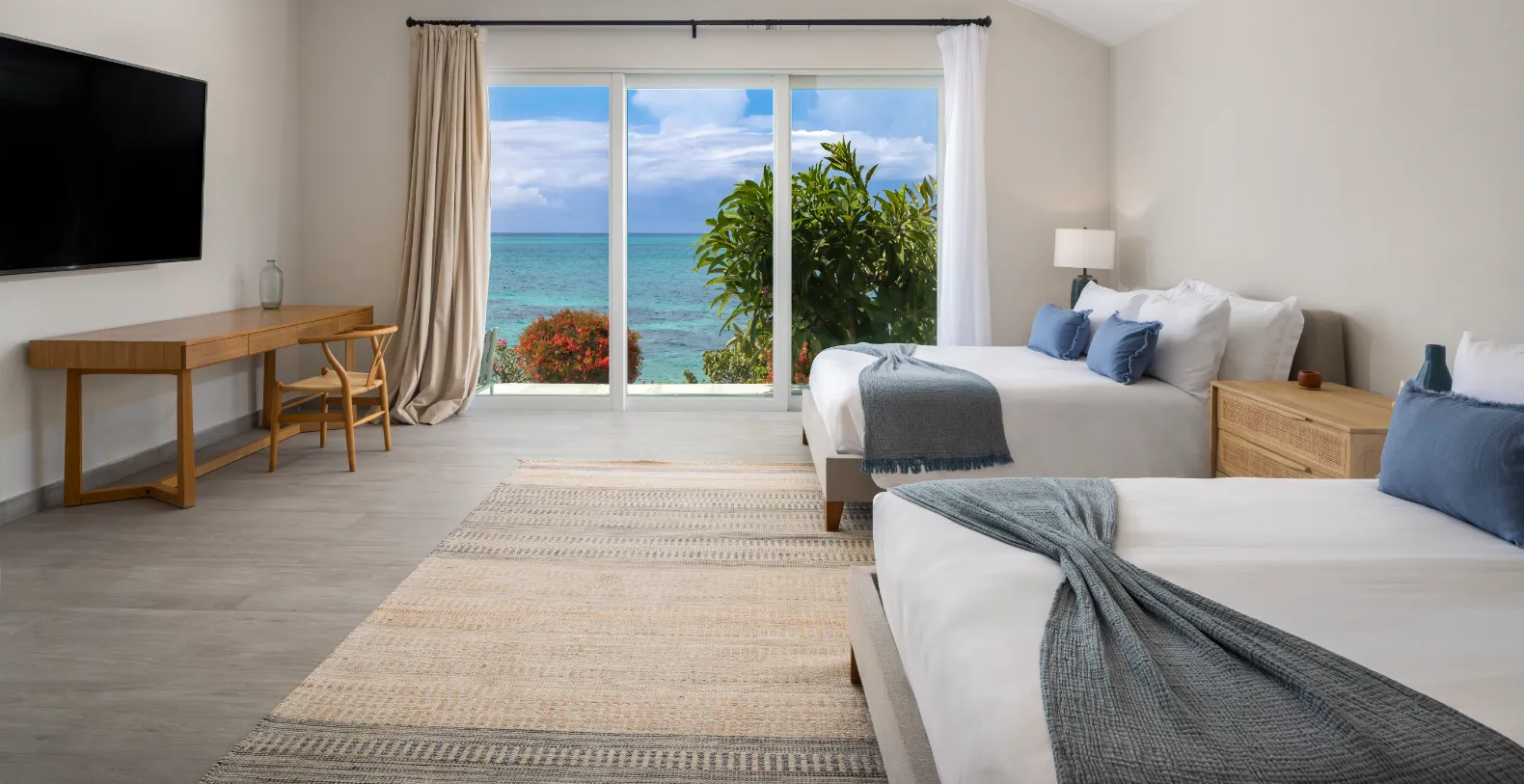 Inside, Villa Eden boasts open-concept living layout and dining areas feature vaulted ceilings and large sliding doors that frame the ocean beyond, creating a bright, airy flow. A standalone great room with a wet bar, grand piano, library, and lounge sets the stage for entertaining or relaxing with loved ones. The modern kitchen is fully equipped with high-end GE appliances, premium small appliances, and a spacious island with seating, making it ideal for both casual meals and formal dining. High-speed wireless internet flows throughout the villa, and split-unit air conditioning allows each space—bedrooms, bathrooms, kitchen, great room, and living areas—to be personalized for ultimate comfort. Villa Eden accommodates up to 12 guests in five stylishly appointed bedrooms, each with en-suite bathrooms, showers, luxurious toiletries, ceiling fans, flat-screen smart TVs, and in-room safes. The primary master suite, located poolside, boasts panoramic ocean views, a private terrace, dual sinks and showers, dual toilets, and a private outdoor shower for a true island experience. A fifth guest suite sits elevated above the main entrance, offering its own terrace and commanding views. A secondary master and two additional guest bedrooms occupy the lower level, each with en-suite bathrooms and ocean-facing terraces.