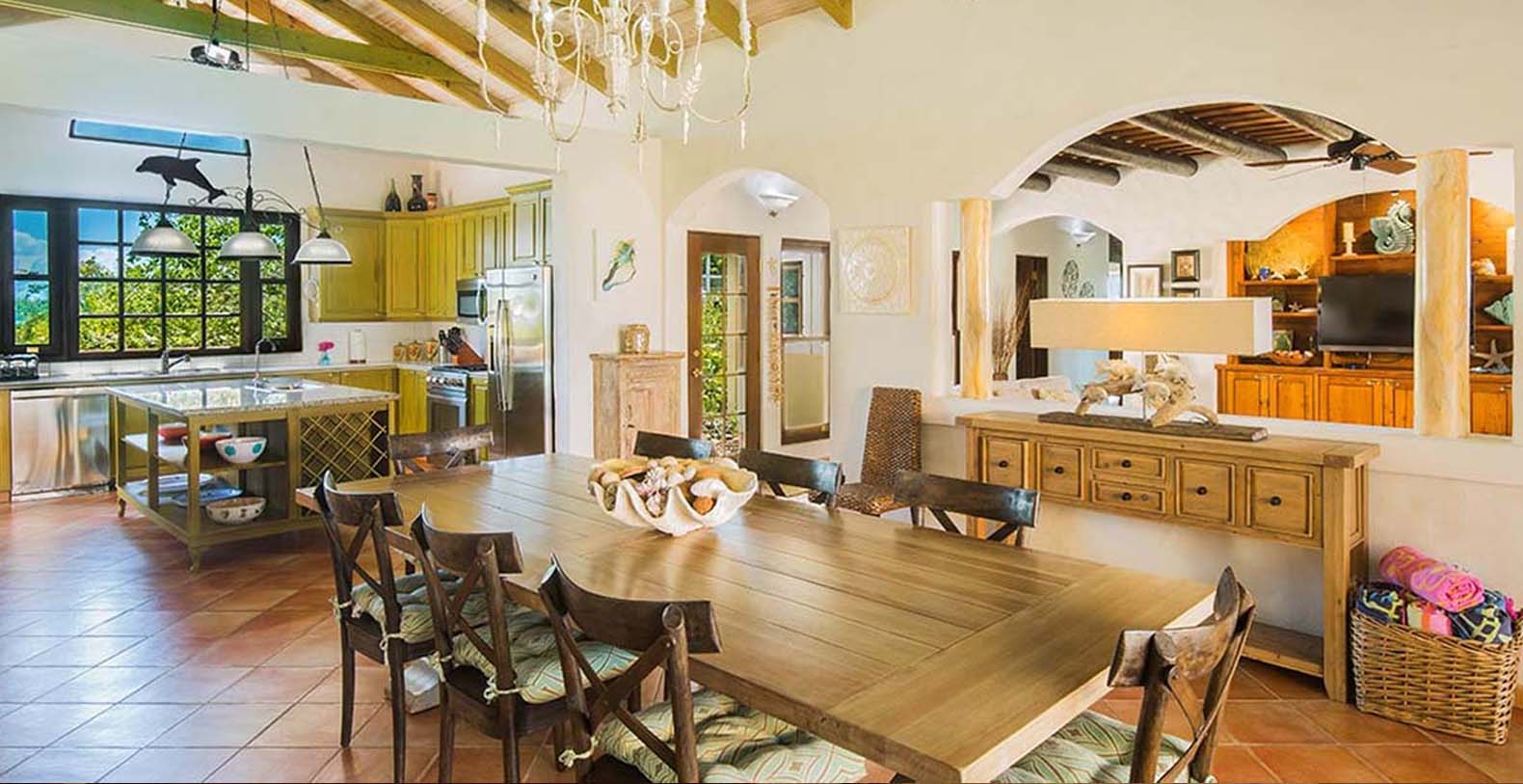 The upper level has a spacious rootop terrace with wonderful views of the ocean and spectacular sunsets. It has both open and shaded areas, a private swimming pool and a wet bar, living room with one wall completely open to the terrace, large gourmet kitchen, which opens onto a back terrace and views of Chalk Sound. The fully equipped open concept kitchen is ideal for catering to large families or private chef, that could be arranged through the dedicated concierge at an additional cost. Just off the kitchen, and with easy access, is a private outdoor balcony which is where you will find the large propane BBQ grill.