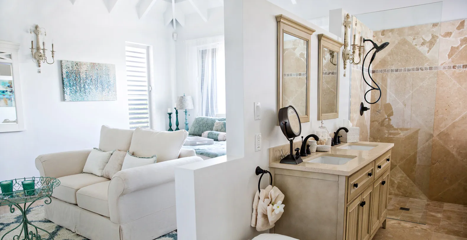 At dusk, you’ll be treated to memorable sunsets. And as darkness sets in, beautiful custom lighting will cast a magical glow around you as music wafts through the air via the speakers that are discretely located, with keypads throughout. The outdoor living oasis at the center of each Pearl connects the front deck with the lagoon area where guests can enjoy an amazing view, access to unbelievably beautiful beach and turquoise waters. Long Bay Beach is known for its silky soft sand, constant gentle breeze, warm turquoise shallows, excellent for water sports, walking, and relaxed beach time and it’s about to be steps away from your villa when you book this property.