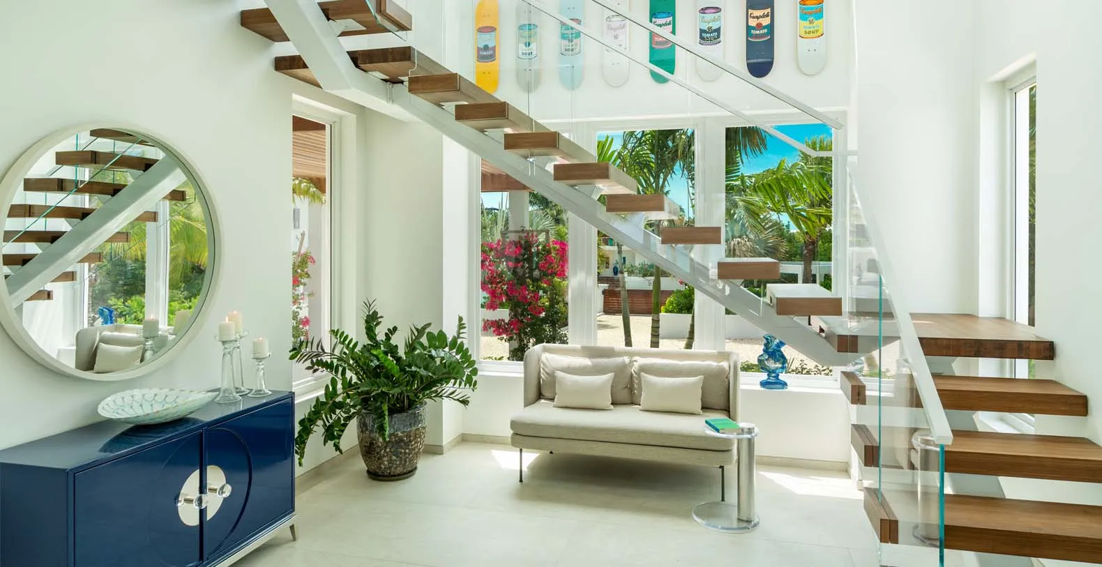A breath-taking experience when you stay in this beautiful vacation home called Milestone Villa, which sits on a pristine white sandy beach in Turks & Caicos. This newly remodeled home can be rented as a 6 or 8 bedroom and has been renovated to the highest hospitality levels, taking all of the elements of a 5 star resort and combining them within a Private Rental. From the moment you walk up through the gates you'll notice how incredibly stunning the entrance is. Modern and Bright, you can see straight to the ocean as you walk in through the large doorway which seems to swallow you up the moment you step inside. Each element has been designed with such care that the organic and modern elements seem to blend to create a space that is both natural and architecturally stunning.