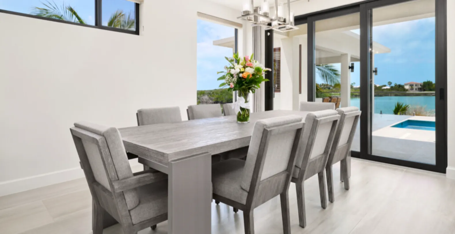 The heart of the home is an expansive open-concept living and kitchen area designed for easy gathering. The gourmet kitchen is outfitted with sleek stainless-steel appliances, a spacious island, and everything needed for in-villa dining or private chef service. The adjoining living room is warm and contemporary, anchored by plush sofas and a 55” flat-screen TV. But the true centerpiece is the view—the entire space opens through sliding glass doors to reveal the villa’s sun terrace, pool deck, and sparkling waterfront backdrop.