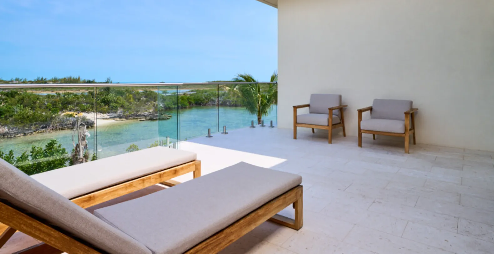 From the moment you arrive, the experience feels effortless. Guests may opt for VIP airport shuttle service, and upon arrival at the estate, a dedicated butler welcomes you, provides a full property orientation, and remains on call throughout your stay. Villa Alexis features four beautifully designed bedrooms and four-and-a-half bathrooms, comfortably accommodating up to 10 guests. Floor-to-ceiling windows fill each space with natural light while showcasing sweeping views of the lagoon-blue water and surrounding landscape. On the main level, the ground-floor master suite offers exceptional comfort with its king bed, a generous ensuite bathroom, and direct access to the outdoor living areas.