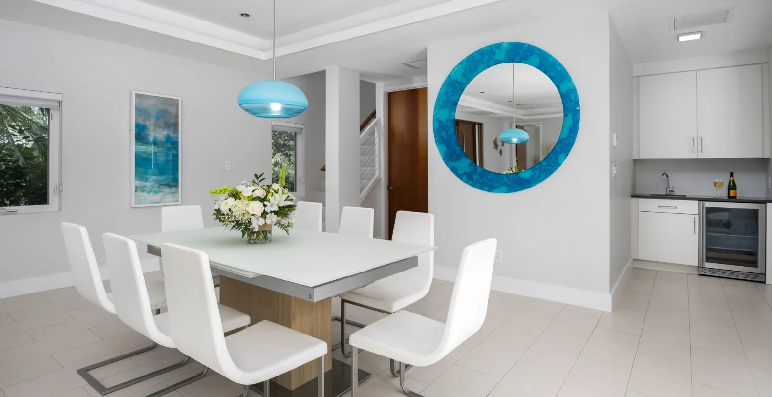 The interiors of Turquoise Villa are a harmonious blend of modern elegance and island-inspired decor, offering a comfortable and stylish living environment. The villa’s main living area is designed with an open-plan concept. Large sliding glass doors merge the indoors and outdoors and provide easy access to the garden. The villa’s kitchen is with unique and clean design, is not just functional but also stylish, with white cabinetry, stainless steel appliances, and elegant countertops. It opens directly to the dining area and living room, making it easy to entertain and socialize while preparing meals.
