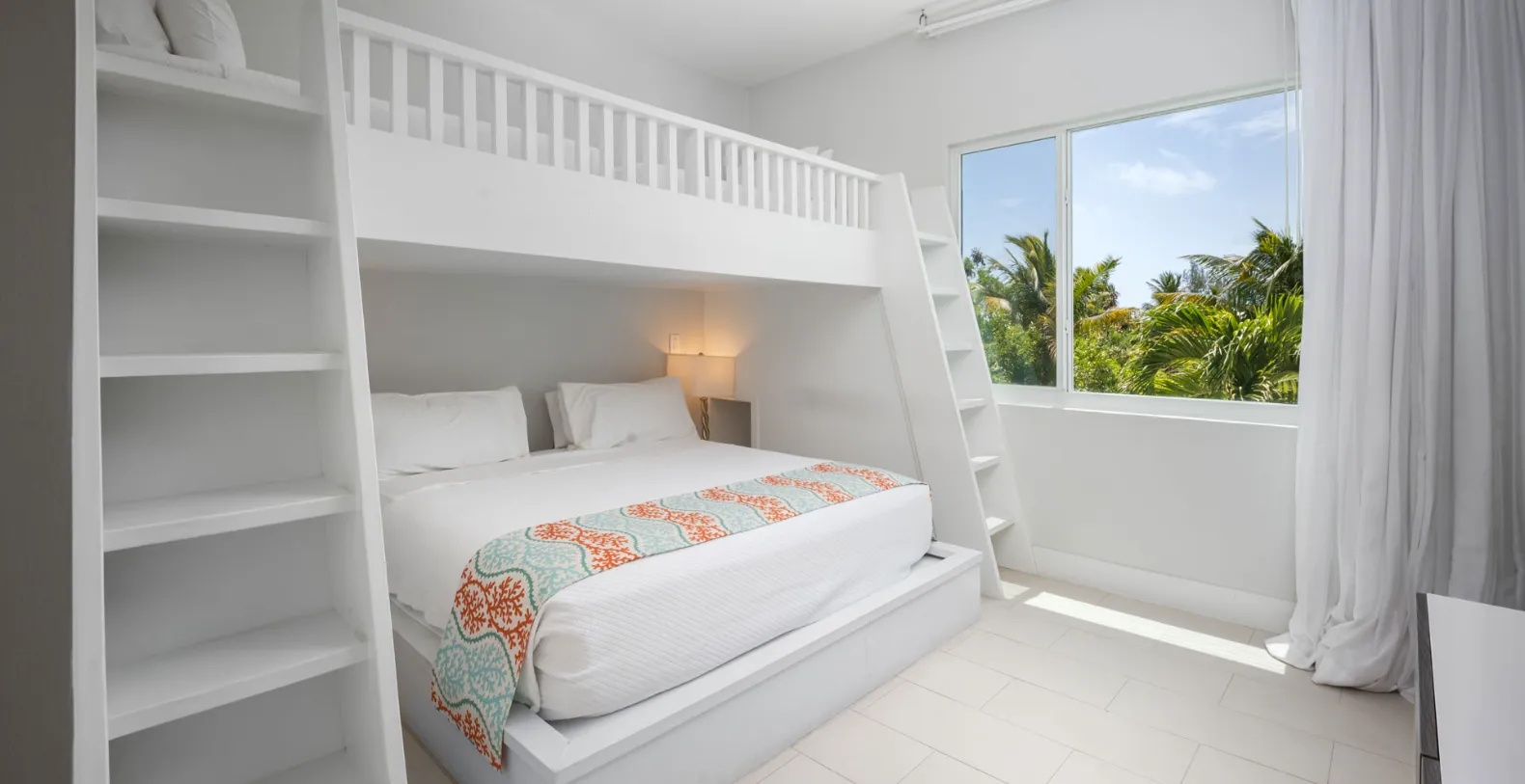 Turquoise Villa boasts four beautifully designed bedrooms, each featuring its own modern ensuite bathroom. The bedrooms are bright, spacious, and elegantly furnished to ensure a relaxing and comfortable stay. One bedroom is located on the first floor and is a private sanctuary with a king-size bed and an ensuite bathroom, ideal for guests seeking tranquility. There are two upper-level bedrooms, each feature king-size beds and open onto private terraces, offering stunning views and a serene retreat. The fourth and last bedroom is the Family room -perfect for families, this room includes twin bunks above a king-size bed, making it a favorite among children.