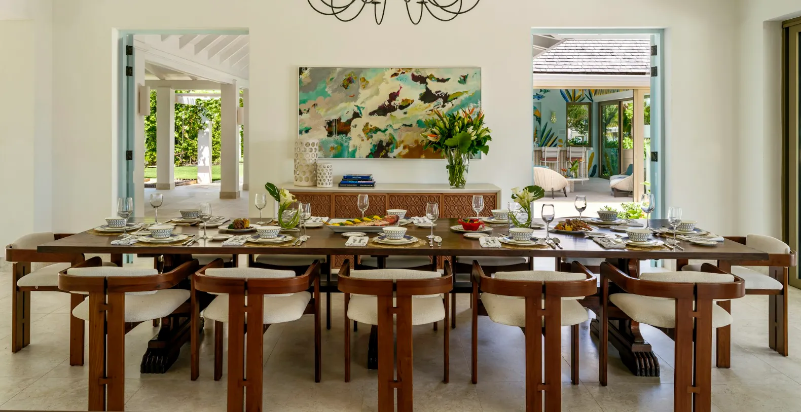 Inside, Evangeline offers multiple beautifully appointed bedrooms, each with king-size beds, en-suite bathrooms, air conditioning, and elegant finishes that reflect the villa’s refined Caribbean style. The interiors are bright, spacious, and thoughtfully designed, combining comfort with understated luxury. A fully equipped kitchen, office space, and modern entertainment systems ensure that guests can balance relaxation with productivity.