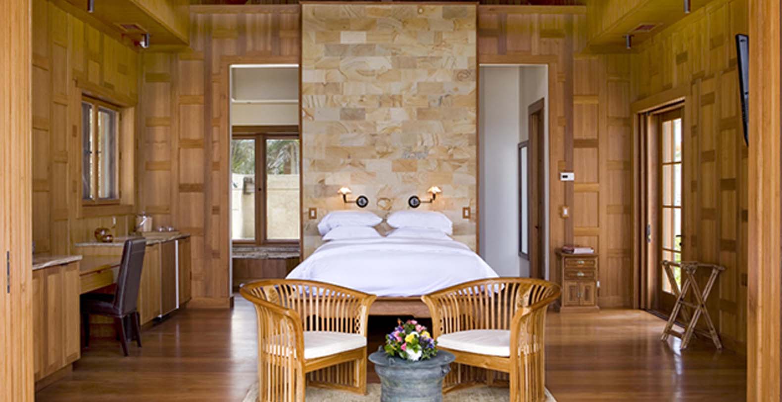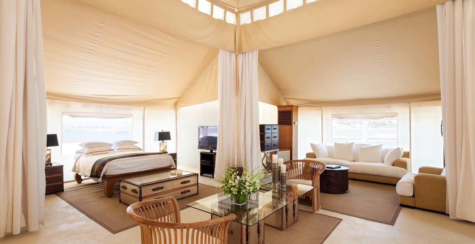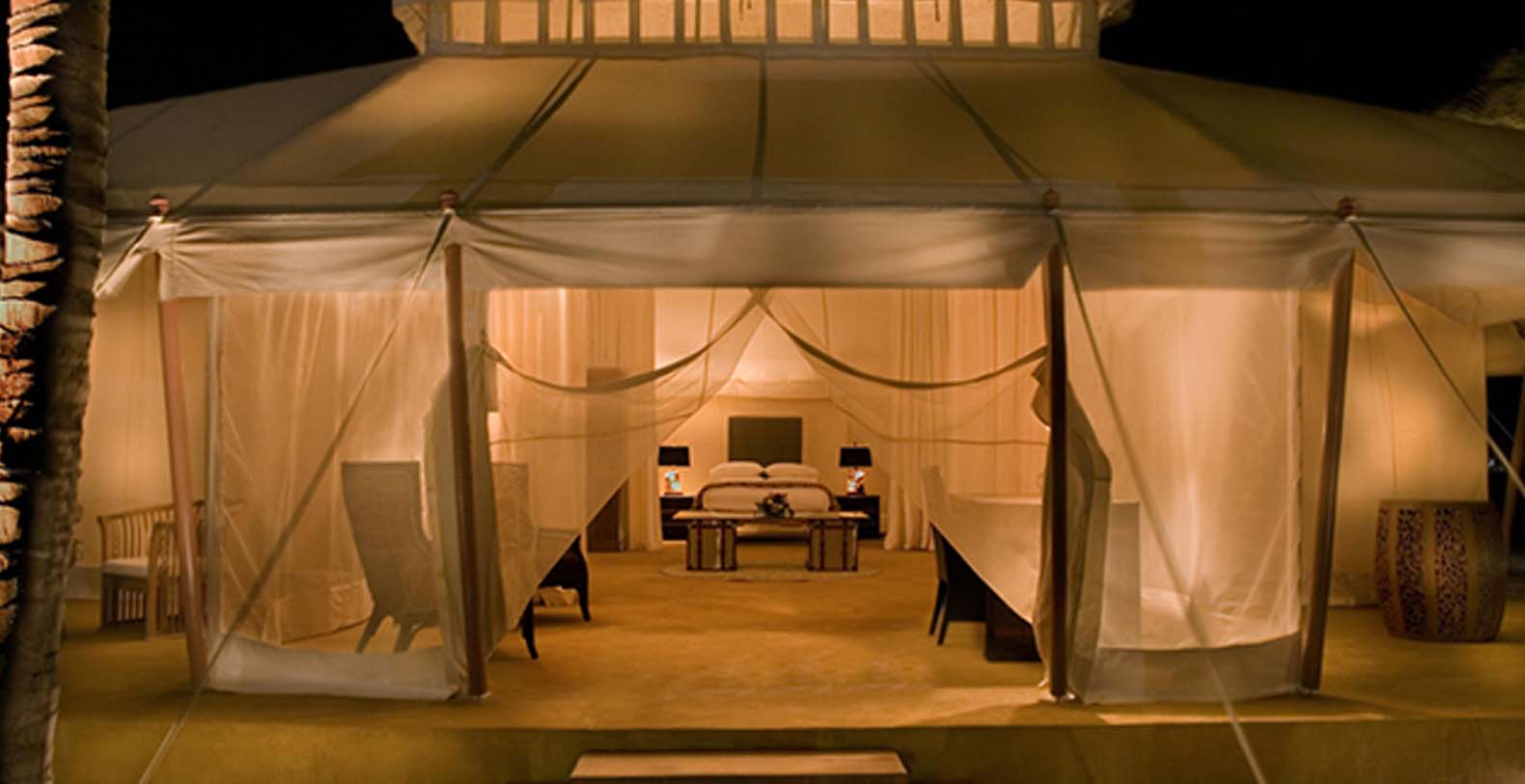 Standing either side of the main building and directly on the beach are two exceptionally large one bedroom Pavilion suites. Each is in excess of 1,000 square feet and contains luxury bath with Jacuzzi tub, indoor/outdoor shower, walk-in closet, writing desk, mini bar and private sundeck with chaises overlooking the sea. A few steps back from the beach, amidst gardens of swaying palms and tropical greenery are two one bedroom Bangala (bungalow) suites. Each Bangala Suite offers more than 750 square feet of luxurious living space with bedroom, sitting area, large bath with indoor/outdoor shower, writing desk and mini-bar. Along the canal, under swaying palms, rises our 2,000 square foot luxury air-conditioned safari tent with separate bedroom, bath, and living area. The Tent is fully furnished and contains the same TV, wireless internet, and other services as the Pavilions and Bungalows.
