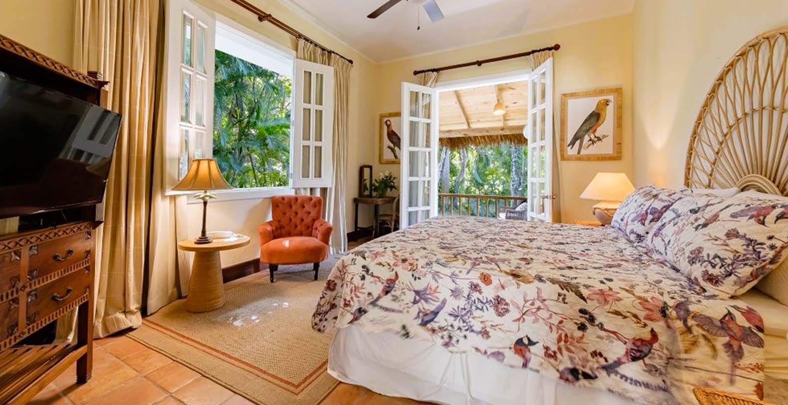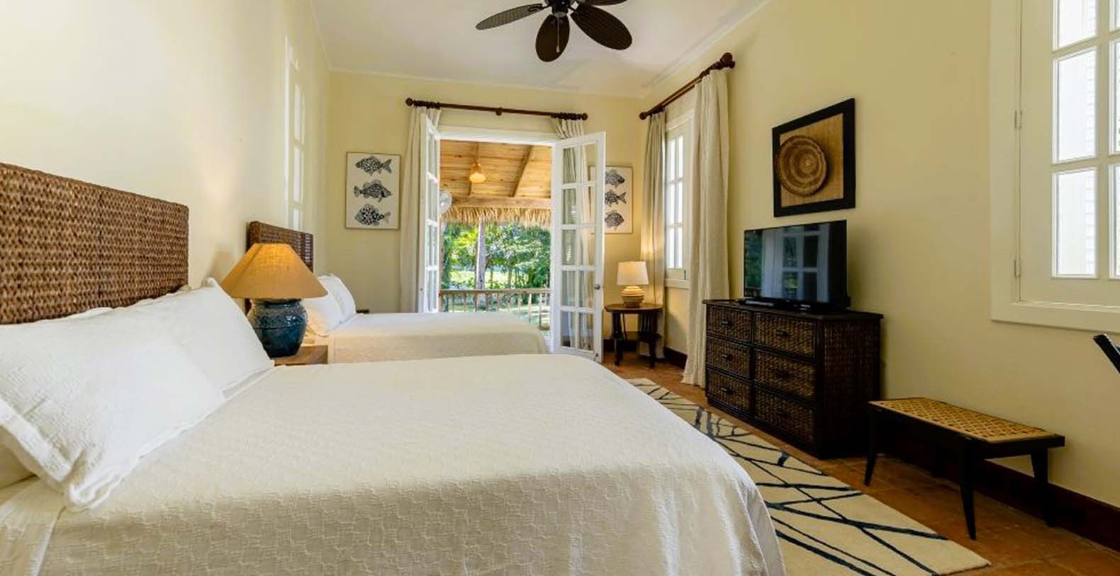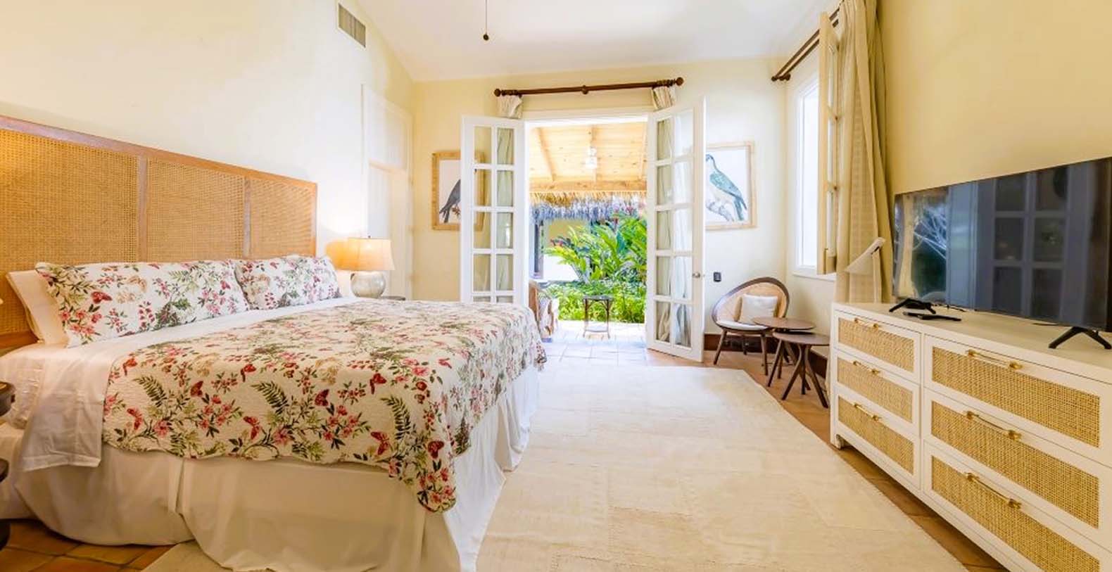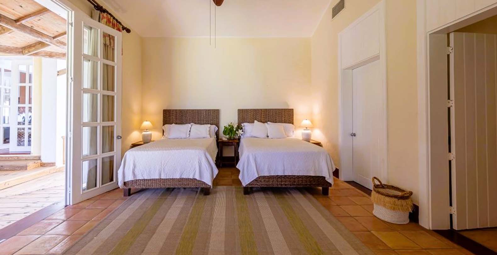 Enjoy the gentle trade winds and breathtaking turquoise ocean views from the spacious wooden veranda, by the pool, or at the beachfront. Casa Las Banderas is superbly decorated with the finest Indonesian, European, and native hardwood furniture A unique wrap-around terrace design ensures that each guest can enjoy their own outdoor space. Step into a world of tropical splendor where fresh breezes and spectacular views await you. The villa’s Caribbean style shines through with louvered windows, vaulted ceilings, and rustic beams, creating a warm and inviting atmosphere. Vibrant colors and a partial-thatched roof terrace exemplify the carefree Caribbean lifestyle you will embrace during your stay.
