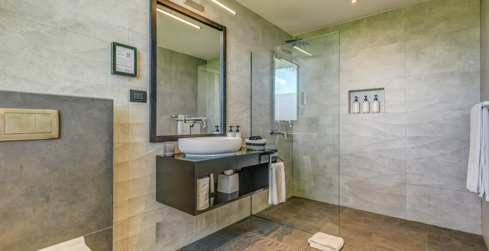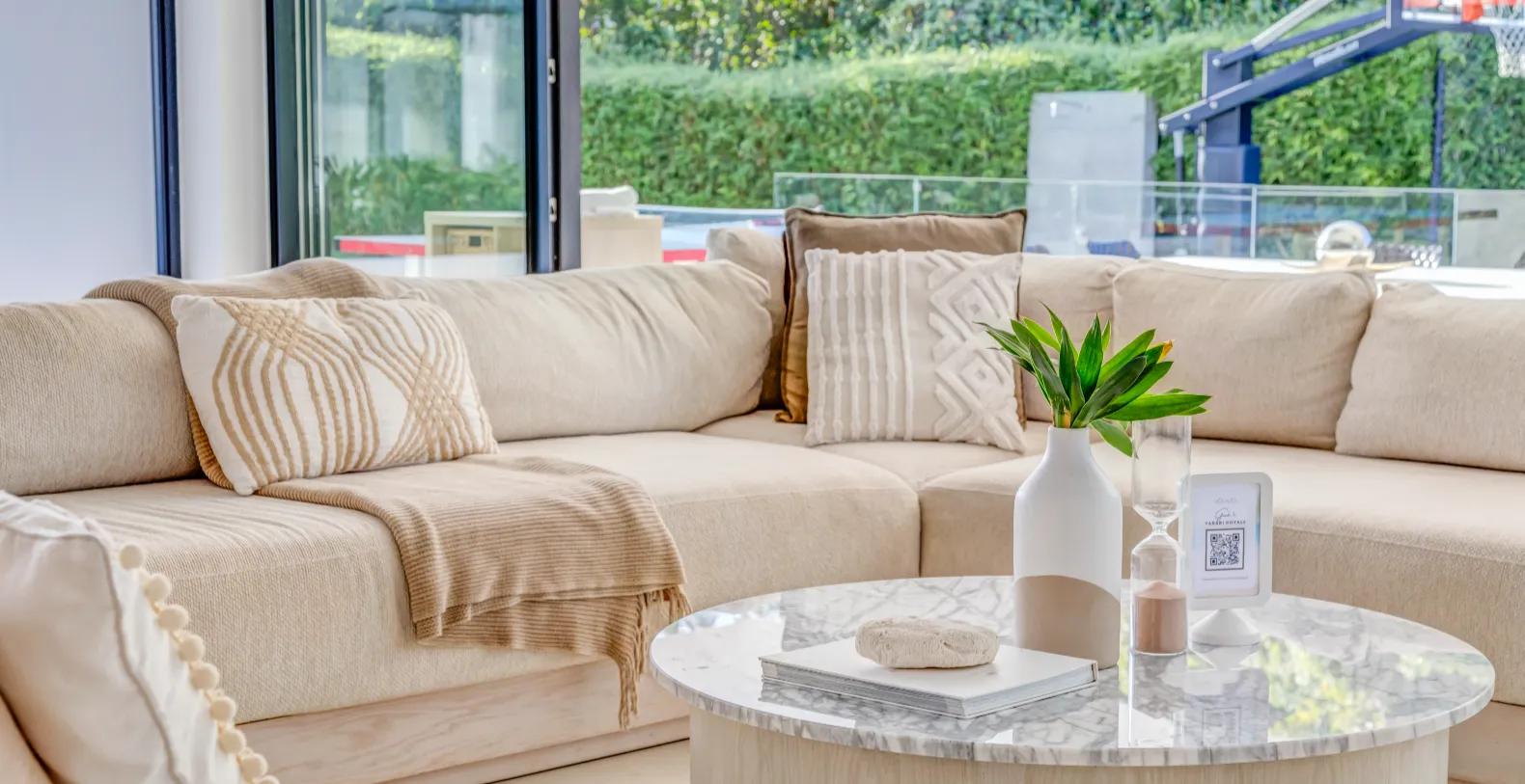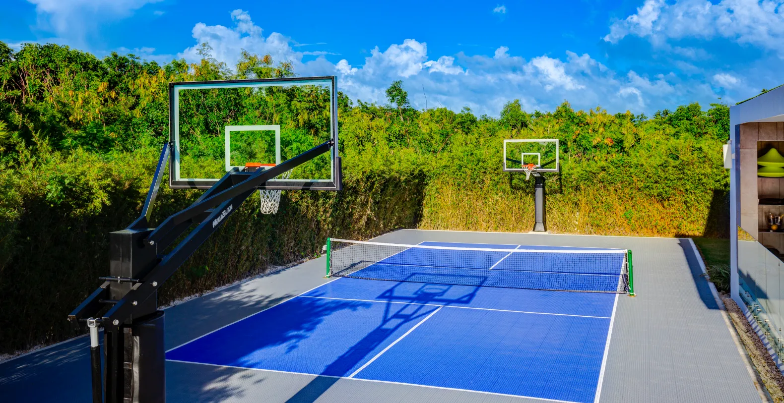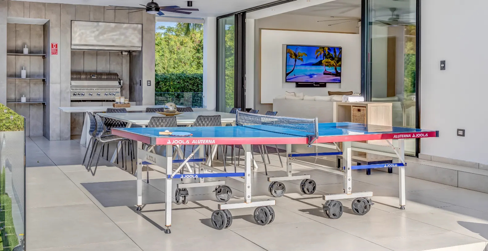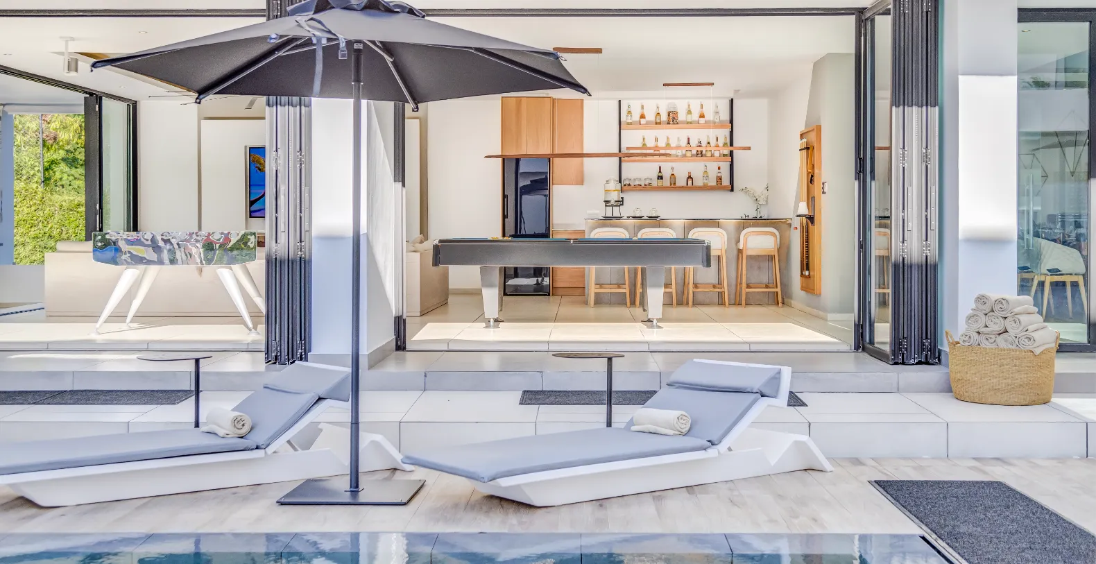 The villa’s central courtyard is an outdoor oasis framed by sleek modern lines and lush greenery. A heated swimming pool (available at an additional nightly fee), oversized sun loungers, and shaded seating areas create the perfect environment for both relaxation and entertainment. Families and groups will love the property’s abundant amenities, including a gym, pickleball court that can transform into a professional basketball court, foosball, ping pong, pool table, bicycles, and a hot tub for unwinding after a day in the sun. Children can enjoy their own dedicated play area, making Yarari Royale equally ideal for family vacations or group getaways.