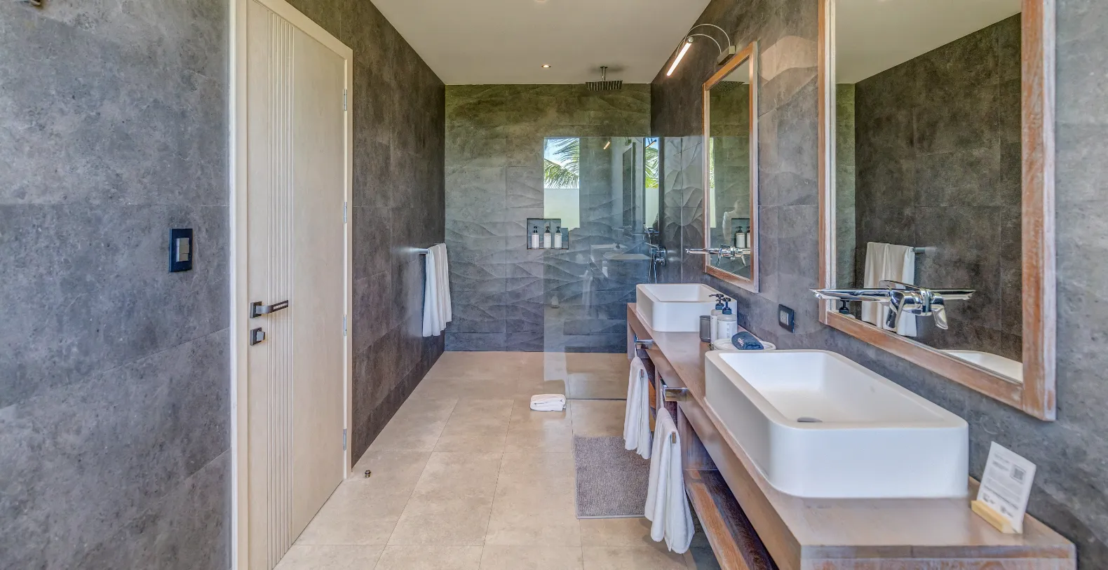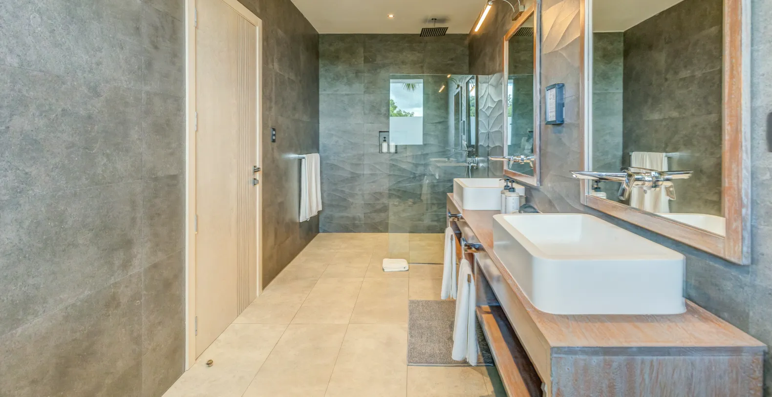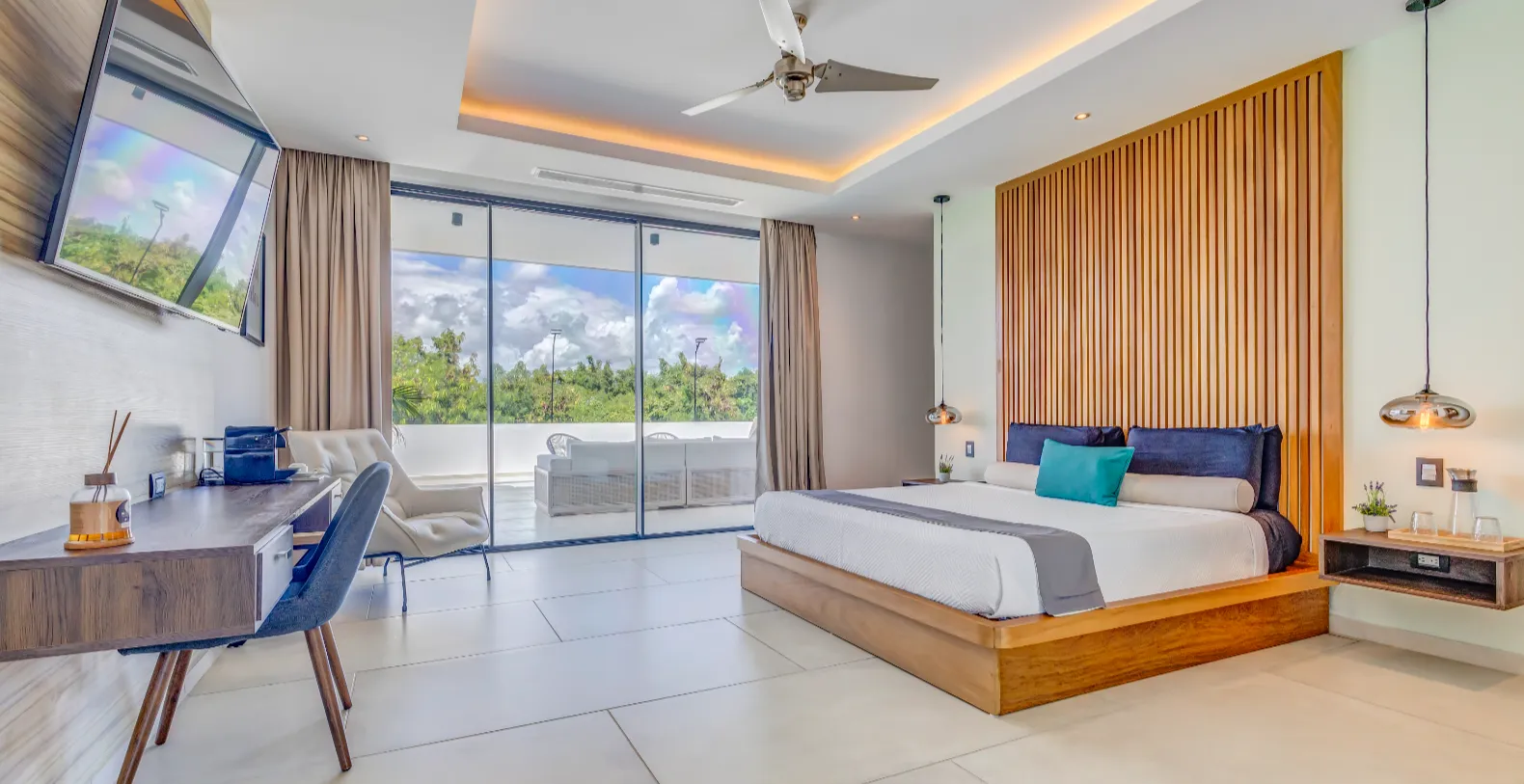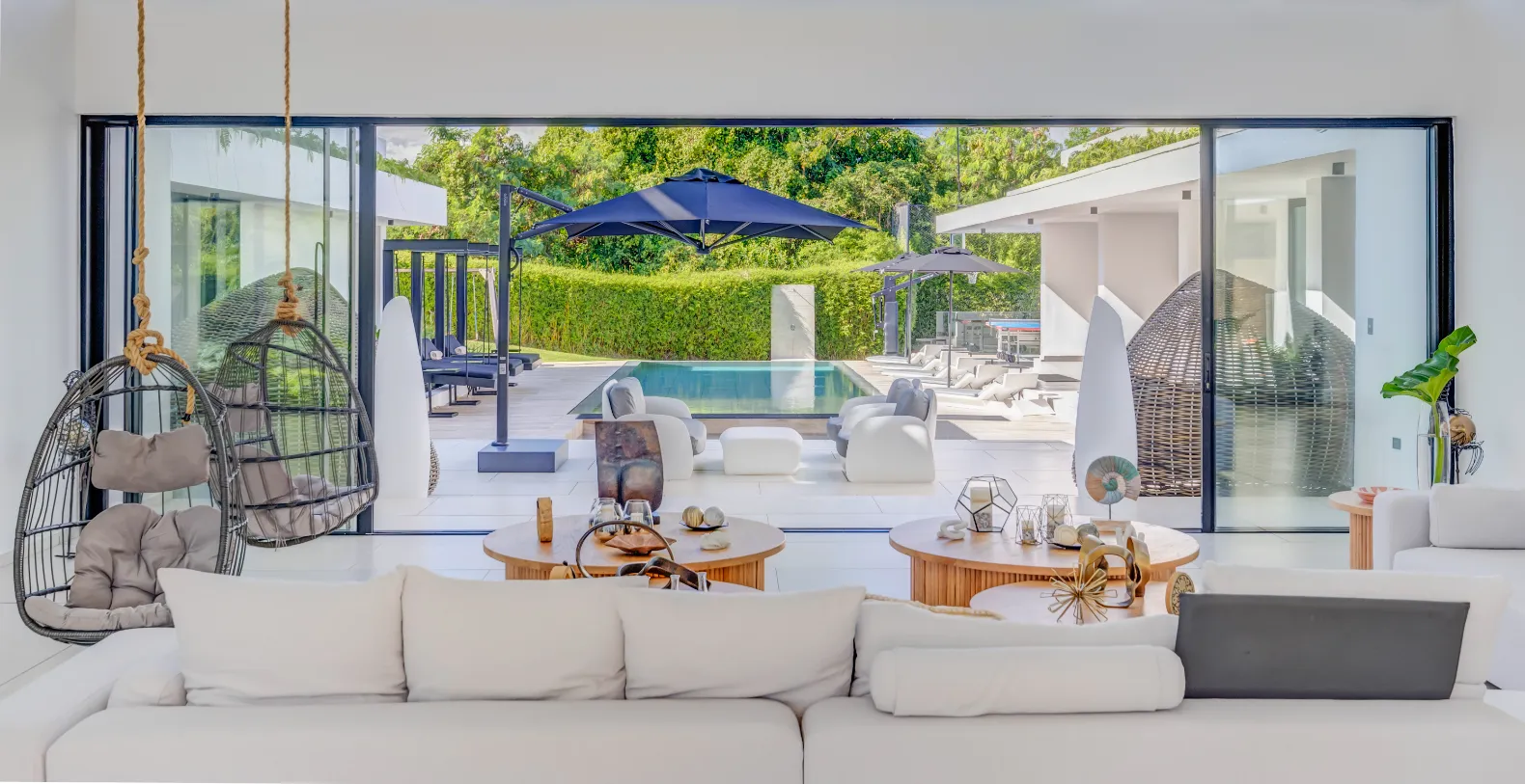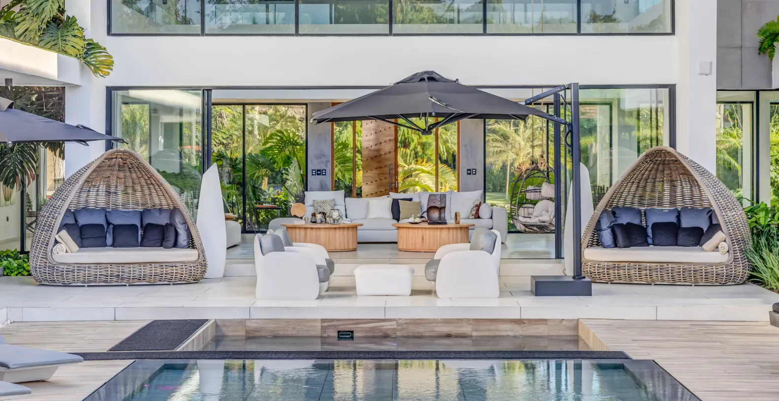 This remarkable residence spans across multiple levels and features nine stunning bedrooms and ten bathrooms, accommodating up to 20 guests in total comfort. The home’s design showcases expansive glass walls, high ceilings, and open-plan spaces filled with natural light. Each bedroom is a serene retreat, complete with ensuite bathrooms, Smart TVs, and fine linens. Several master suites also include Jacuzzis and private terraces that overlook the pool and tropical surroundings.