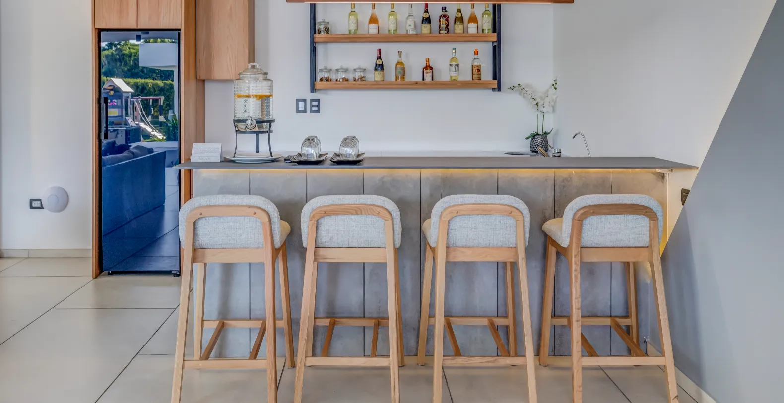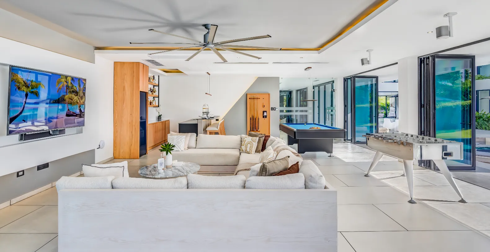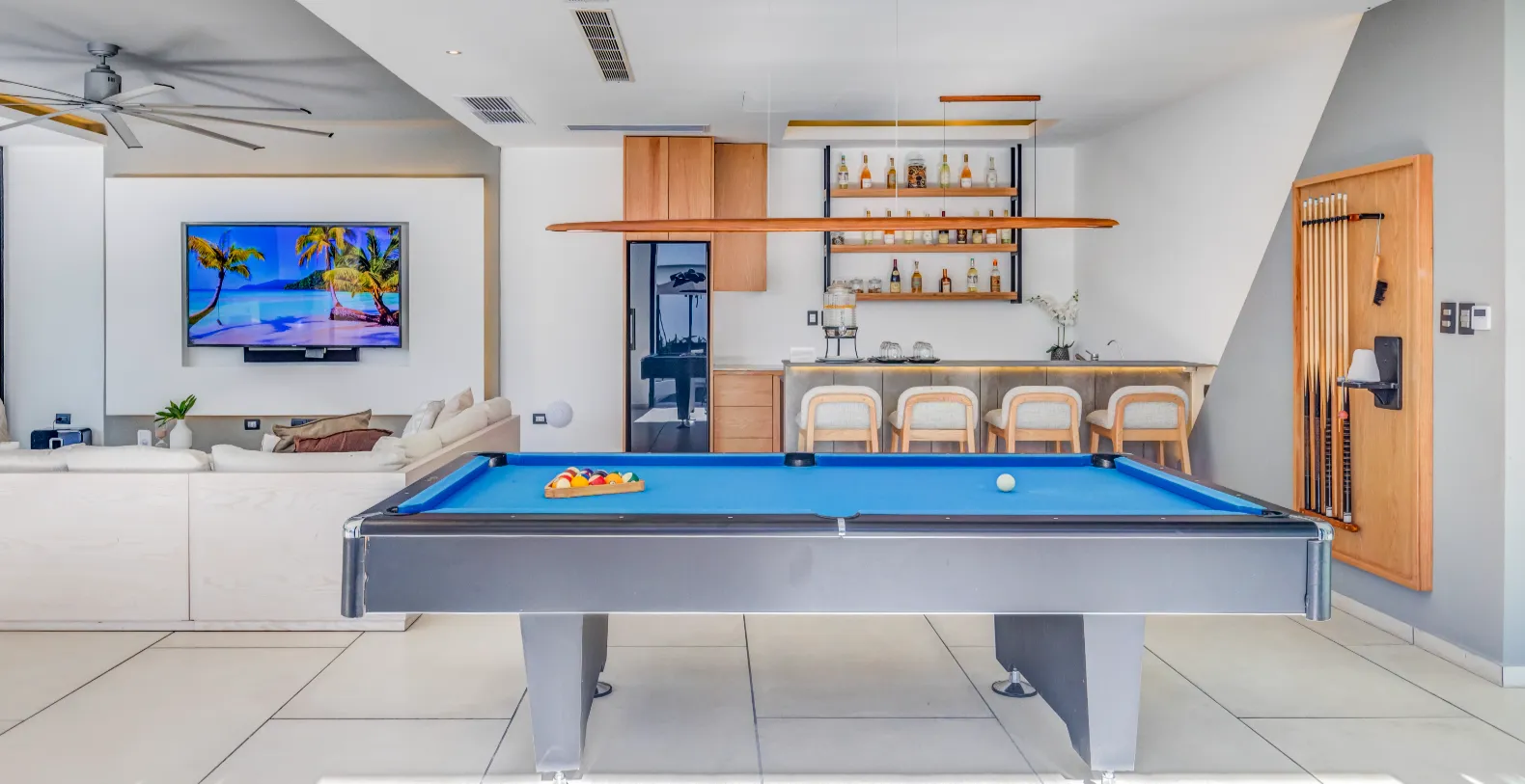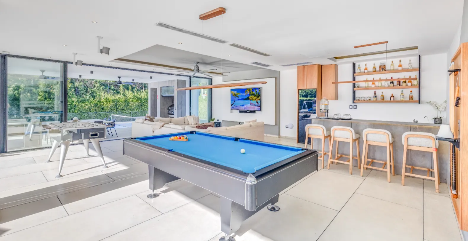 Inside, the villa’s spacious living areas are styled with a balance of modern comfort and coastal charm. A bright living room opens seamlessly onto the terrace, while the elegant dining area easily seats large groups for shared meals prepared by the villa’s private chef. The chef, butler, and daily maid service ensure every detail is attended to, providing guests with a completely stress-free experience. The kitchen is fully equipped for gourmet cooking, and the villa’s entertainment lounge—complete with a bar, large flat-screen TV, and games area—is perfect for evening gatherings.