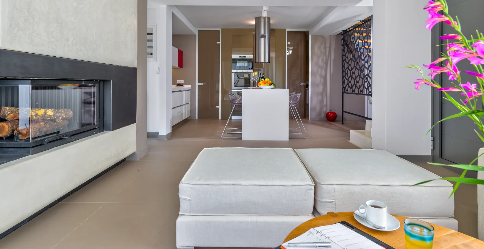 The ground floor opens into a spacious living room where a stylish eco-friendly fireplace creates a warm focal point. Large windows fill the room with natural light while framing the surrounding landscape. The open-plan kitchen is sleek and functional, featuring modern appliances, generous work surfaces, and an informal dining area that encourages relaxed gatherings and home-cooked meals inspired by local Cretan ingredients.