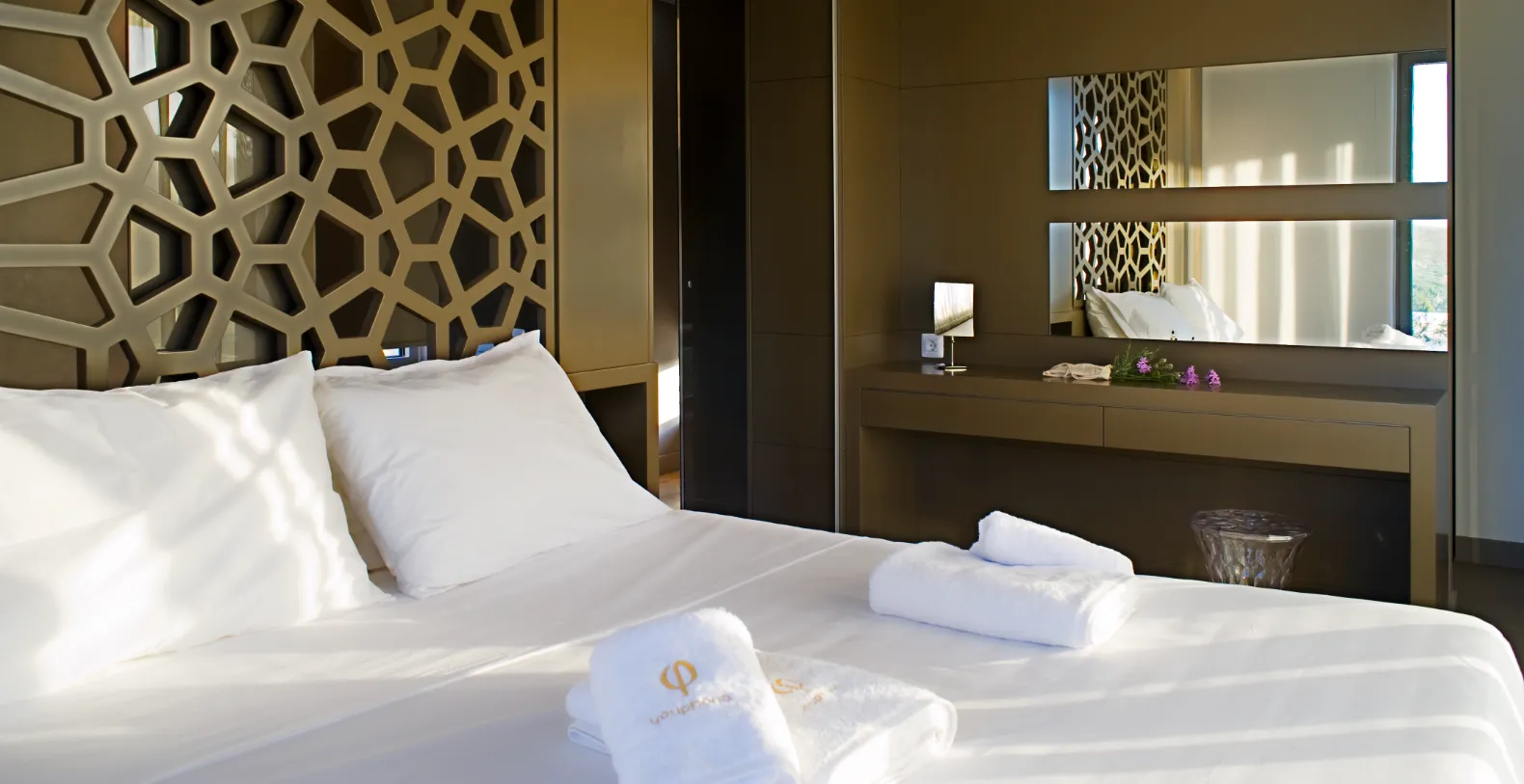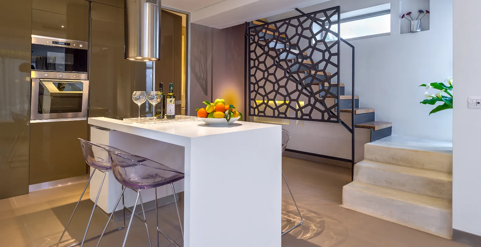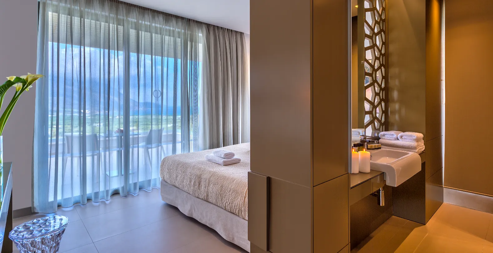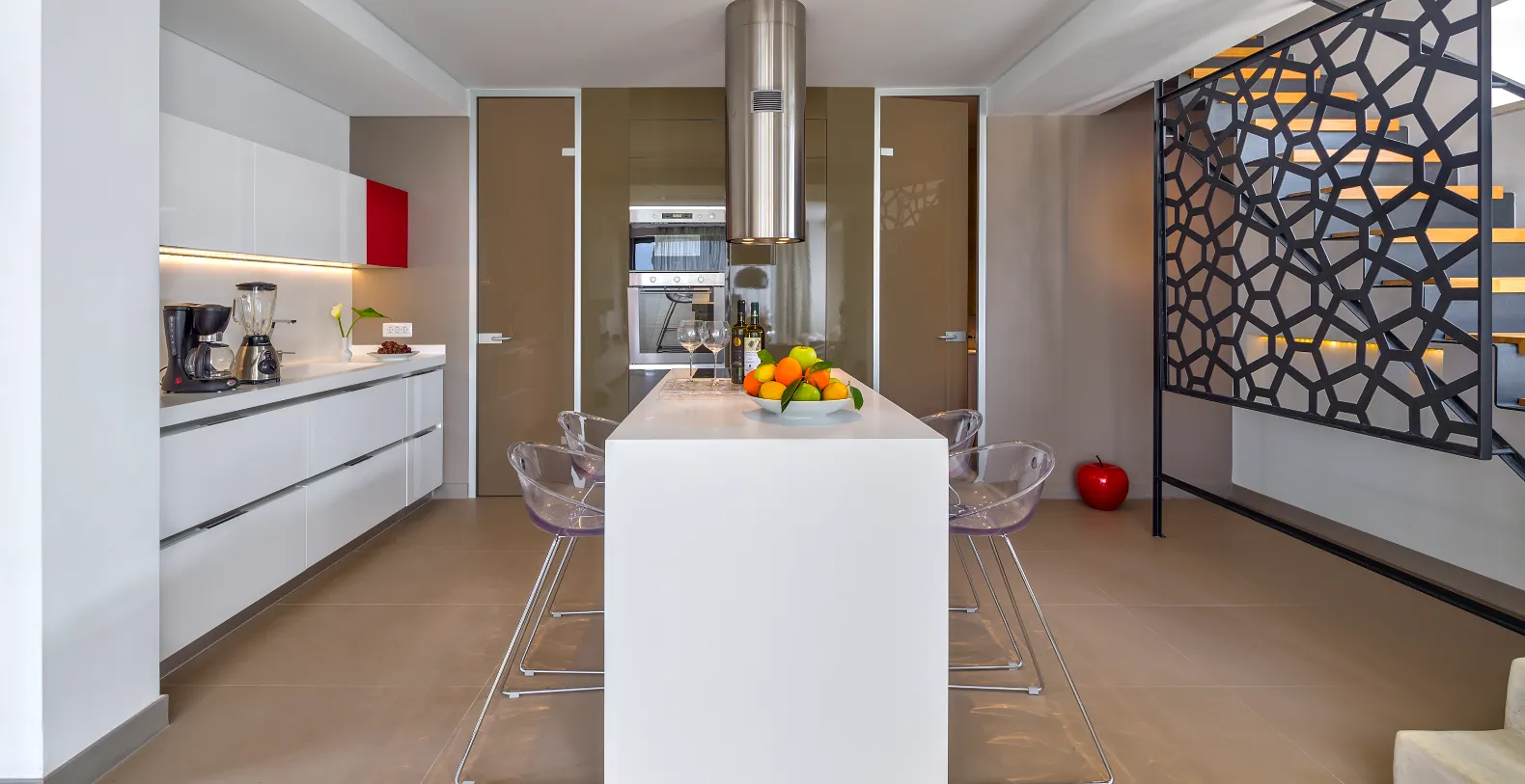 Villa Charisma accommodates up to four guests in two beautifully appointed double bedrooms. A freestanding metal staircase leads to the master bedroom on the first floor, where the en-suite bathroom and bath, and the large balcony and unique private outdoor seating space, allow you to gaze out over the bay. Meanwhile, the ground-floor double/twin bedroom, with an en-suite bathroom featuring a walk-in spa shower area, has a separate entrance with large doors opening onto the terrace.