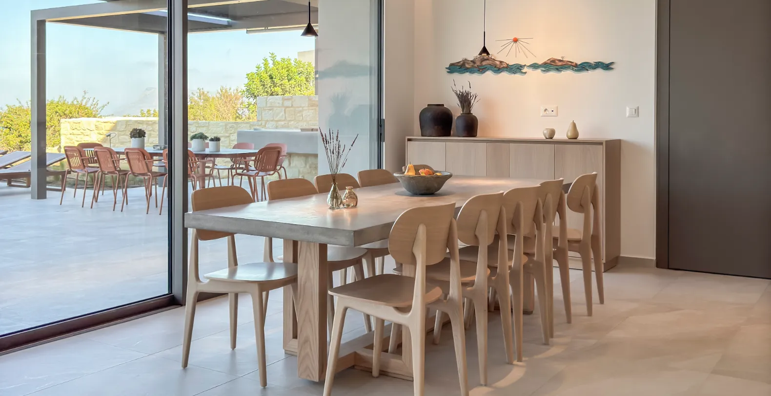 Spanning approximately 280 square meters, this sophisticated private villa welcomes guests into a beautifully designed open-plan interior where natural materials, warm tones, and contemporary comforts create an inviting atmosphere. The spacious living room is centered around an eco-friendly fireplace and furnished with comfortable seating. Large windows fill the space with natural light while framing captivating views across the rolling countryside and toward the shimmering waters of the Aegean Sea.