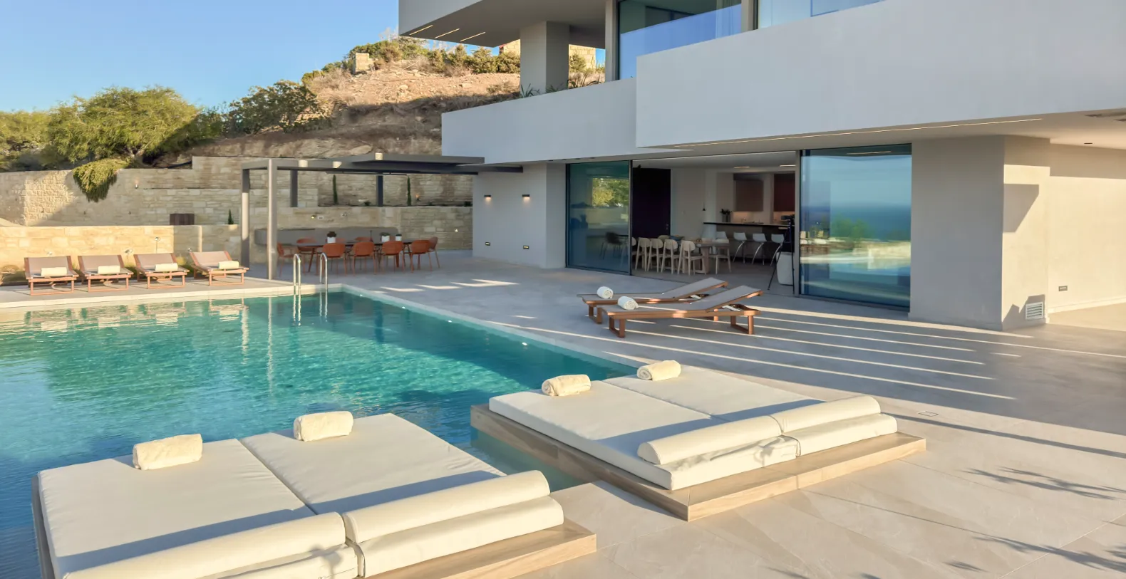 Outdoor living is an essential part of the Villa Majestic experience. At ground level, guests can step onto the spacious terrace where a stunning 50-square-metre swimming pool becomes the focal point of the outdoor area. Sunbeds, plush poolside mattresses, and comfortable sofas invite guests to relax beneath the Mediterranean sun while enjoying uninterrupted panoramic views toward the sea. A shaded pergola provides a beautiful setting for al fresco dining, complete with a large outdoor table and seating area ideal for long evening meals under the stars. Nearby, the dedicated barbecue area makes it easy to prepare grilled specialties.