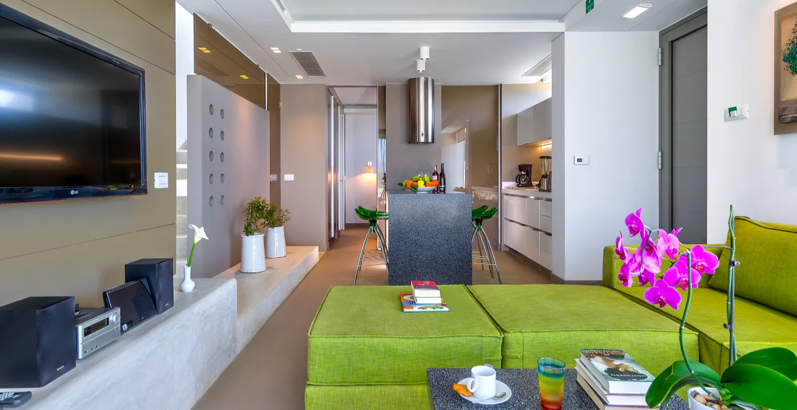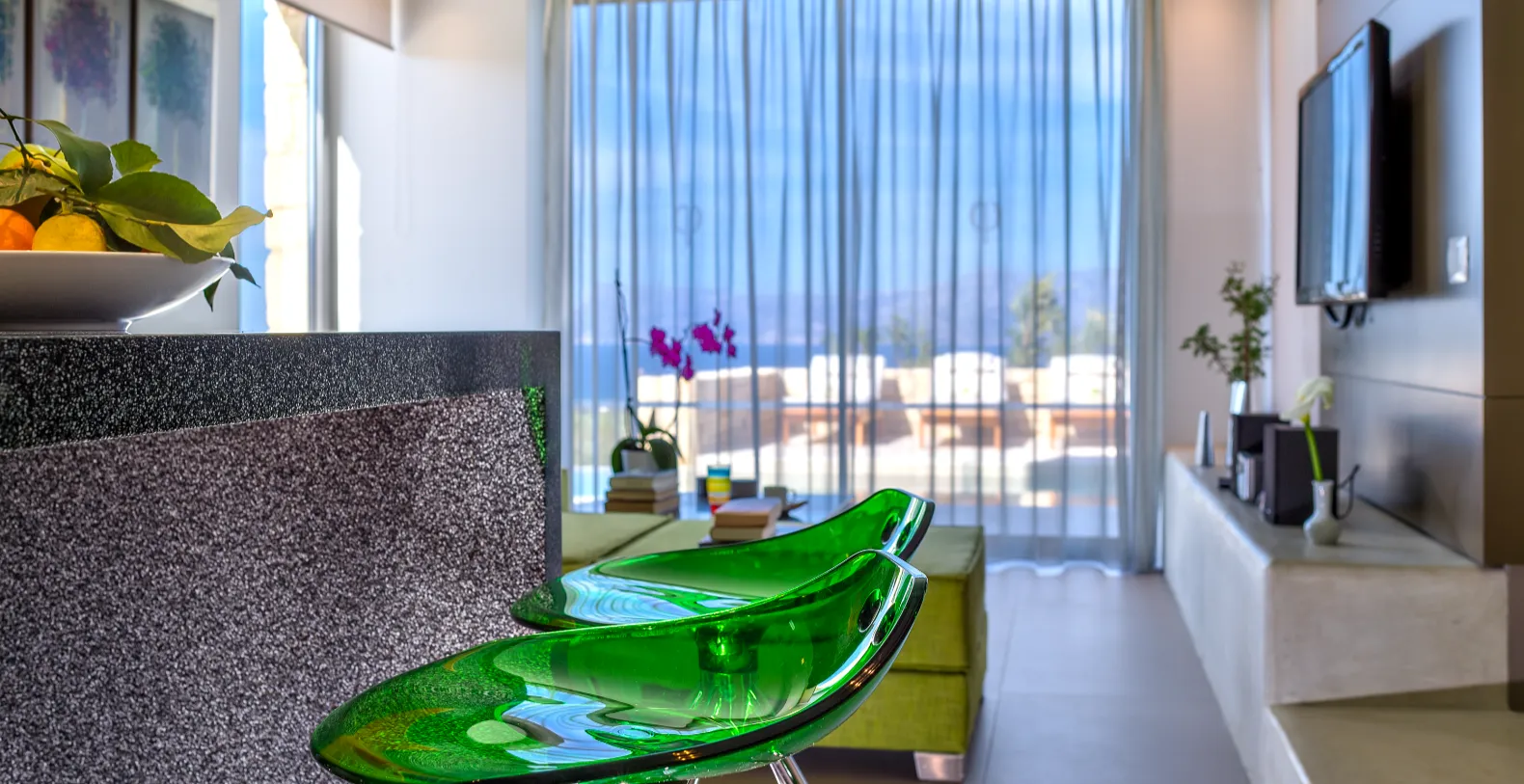 Inside, Villa Oneiro showcases a bright and contemporary interior. Large windows frame the surrounding landscape and flood the living spaces with natural light, reinforcing the seamless connection between indoors and outdoors. The open-plan living area features comfortable seating, modern décor, and direct access to the terrace and pool area. Adjacent to the lounge, the sleek kitchen offers practical work surfaces, modern appliances, and an informal dining area ideal for preparing fresh Mediterranean meals using locally sourced ingredients.