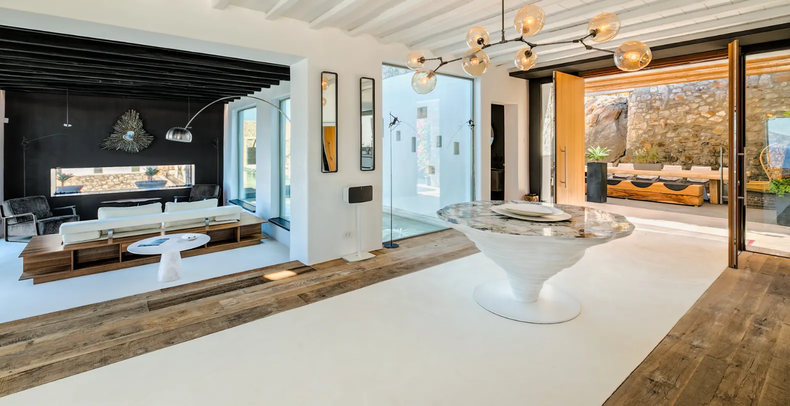 The villa is thoughtfully composed of three interconnected blocks, each with independent entrances that wrap around the main infinity pool level. Every suite has its own sea-view terrace, ensuring that guests experience the tranquility of the coast from the moment they wake. The bedroom layout is exceptionally versatile, featuring master suites with private heated pools, Jacuzzis, gardens, and shaded pergolas; a pool-level suite with its own living space and independent access.