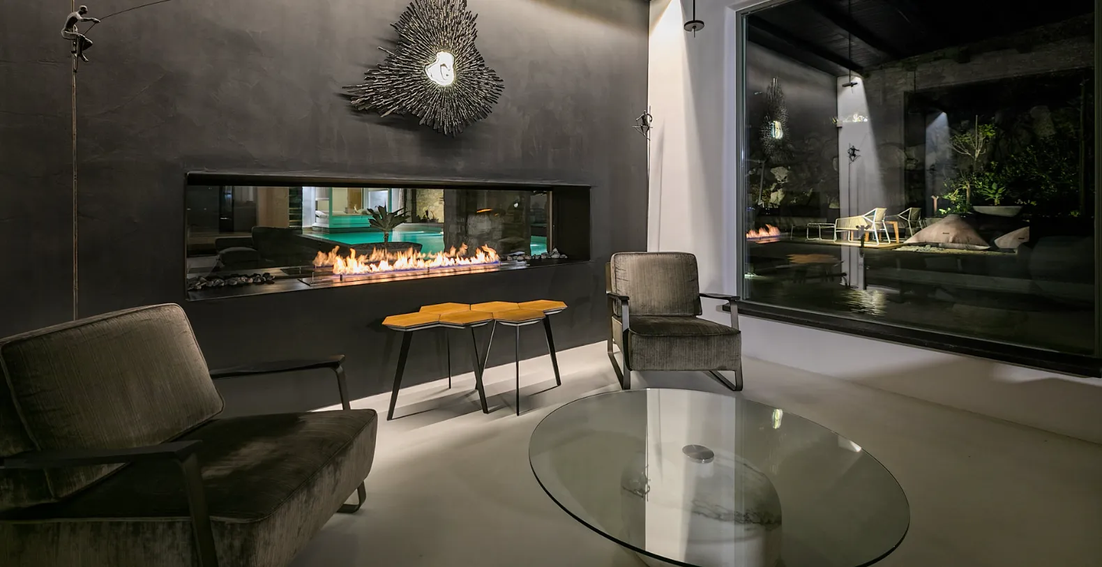 Outdoor living sits at the heart of Villa Allure’s design. The main heated overflow pool glows with LED lighting, creating a serene ambiance. Multiple dining terraces, shaded pergolas, lounging areas, and sunset decks ensure that guests can enjoy alfresco meals and gatherings throughout the day. Thoughtfully landscaped stone pathways, natural rock formations, and waterfront-facing seating areas turn the exterior into a private sanctuary.