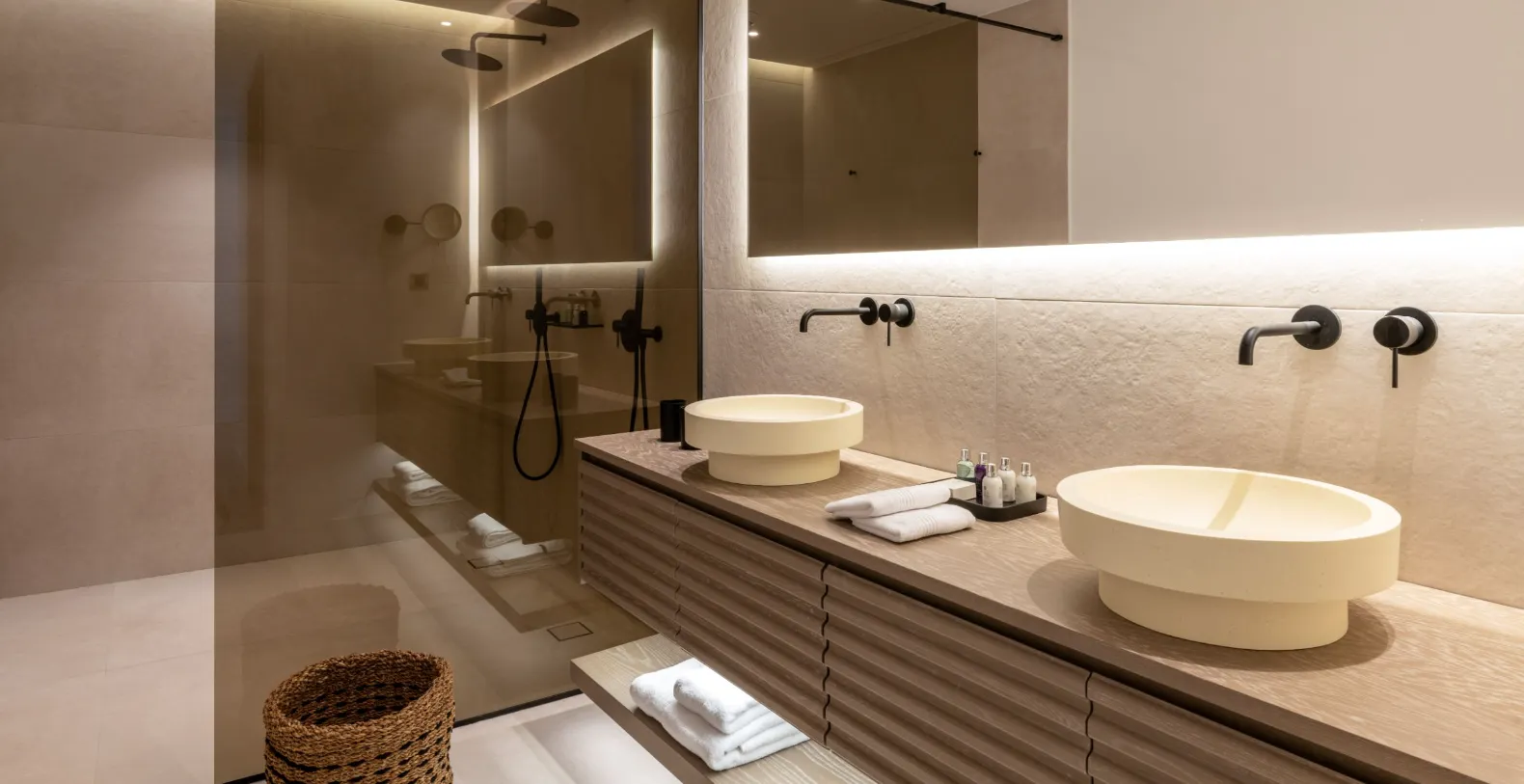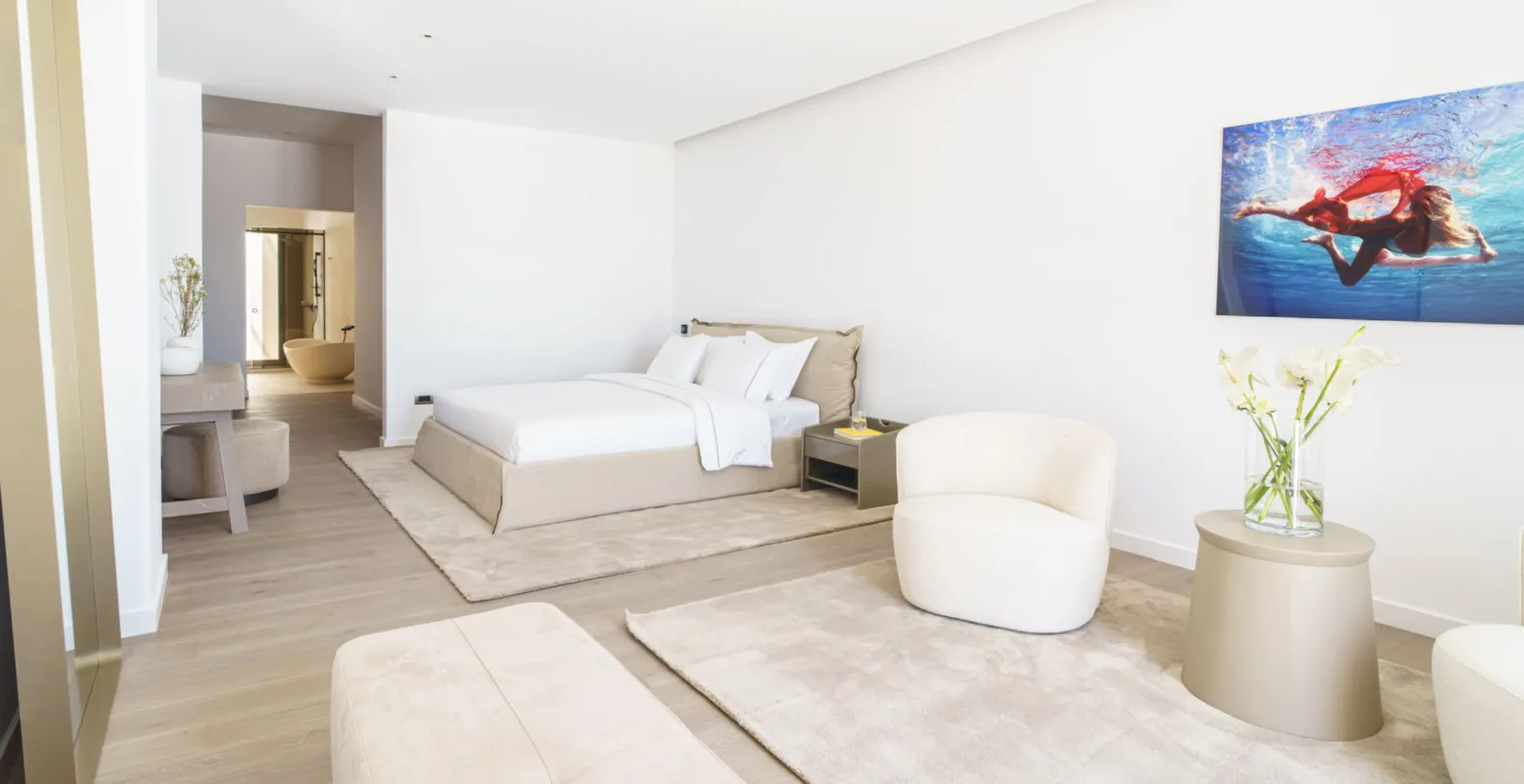 Inside, the design is sleek, modern, and refined, with floor-to-ceiling windows capturing endless blue horizons. Soft neutral tones, premium materials, and custom furnishings create a serene atmosphere throughout the expansive open-plan living and dining area. The bedroom suites at Villa Destiny are designed as private sanctuaries, each with its own en-suite bathroom featuring dual showers and luxurious finishes. Seven double bedrooms offer panoramic sea views and direct access to one of the pools or terraces, while the extraordinary 82 sqm master suite elevates the experience with unmatched space and privacy. A dedicated kids’ room with bunk beds and its own bathroom accommodates families comfortably.