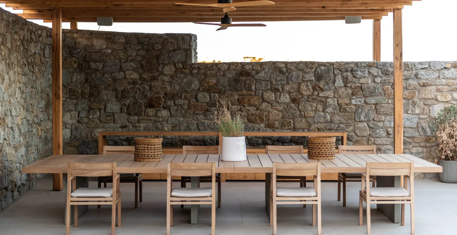 From the moment you arrive, the estate’s dramatic cliffside setting and expansive multi-level layout create a sense of grandeur. Stone terraces, sculpted gardens, and glass-fronted balconies frame sweeping sea views at every turn. The villa’s two infinity pools—one an impressive 27 meters and heated upon request, the other 18 meters—cascade along the hillside, offering total privacy between levels. Sunken loungers, shaded pergolas, an oversized outdoor Jacuzzi, and stylish daybeds allow guests to enjoy full days of sun and relaxation. Every outdoor area has been thoughtfully designed to maximize comfort and entertainment. The alfresco bar and fully equipped BBQ station serve as the heart of social gatherings, while an outdoor dining table for 20 invites guests to enjoy long Mediterranean meals with unforgettable sea views. A dedicated open-air home cinema transforms warm Mykonos nights into memorable evenings under the stars.
